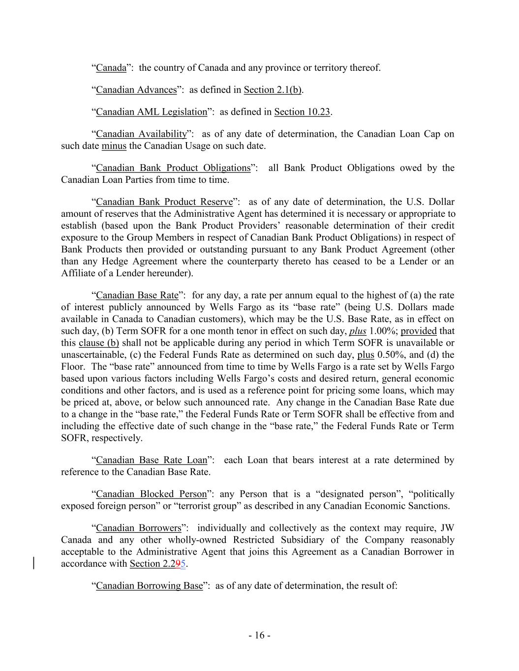 “Canada”: the country of Canada and any province or territory thereof. “Canadian Advances”: as defined in Section 2.1(b). “Canadian AML Legislation”: as defined in Section 10.23. “Canadian Availability”: as of any date of determination, the Canadian Loan Cap on such date minus the Canadian Usage on such date. “Canadian Bank Product Obligations”: all Bank Product Obligations owed by the Canadian Loan Parties from time to time. “Canadian Bank Product Reserve”: as of any date of determination, the U.S. Dollar amount of reserves that the Administrative Agent has determined it is necessary or appropriate to establish (based upon the Bank Product Providers’ reasonable determination of their credit exposure to the Group Members in respect of Canadian Bank Product Obligations) in respect of Bank Products then provided or outstanding pursuant to any Bank Product Agreement (other than any Hedge Agreement where the counterparty thereto has ceased to be a Lender or an Affiliate of a Lender hereunder). “Canadian Base Rate”: for any day, a rate per annum equal to the highest of (a) the rate of interest publicly announced by Wells Fargo as its “base rate” (being U.S. Dollars made available in Canada to Canadian customers), which may be the U.S. Base Rate, as in effect on such day, (b) Term SOFR for a one month tenor in effect on such day, plus 1.00%; provided that this clause (b) shall not be applicable during any period in which Term SOFR is unavailable or unascertainable, (c) the Federal Funds Rate as determined on such day, plus 0.50%, and (d) the Floor. The “base rate” announced from time to time by Wells Fargo is a rate set by Wells Fargo based upon various factors including Wells Fargo’s costs and desired return, general economic conditions and other factors, and is used as a reference point for pricing some loans, which may be priced at, above, or below such announced rate. Any change in the Canadian Base Rate due to a change in the “base rate,” the Federal Funds Rate or Term SOFR shall be effective from and including the effective date of such change in the “base rate,” the Federal Funds Rate or Term SOFR, respectively. “Canadian Base Rate Loan”: each Loan that bears interest at a rate determined by reference to the Canadian Base Rate. “Canadian Blocked Person”: any Person that is a “designated person”, “politically exposed foreign person” or “terrorist group” as described in any Canadian Economic Sanctions. “Canadian Borrowers”: individually and collectively as the context may require, JW Canada and any other wholly-owned Restricted Subsidiary of the Company reasonably acceptable to the Administrative Agent that joins this Agreement as a Canadian Borrower in accordance with Section 2.295. “Canadian Borrowing Base”: as of any date of determination, the result of: - 16 -