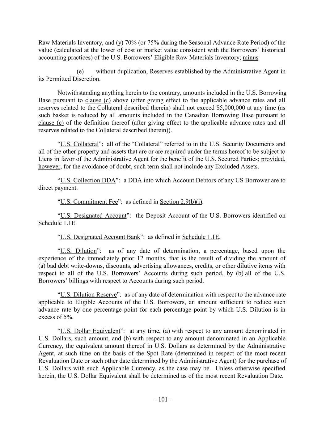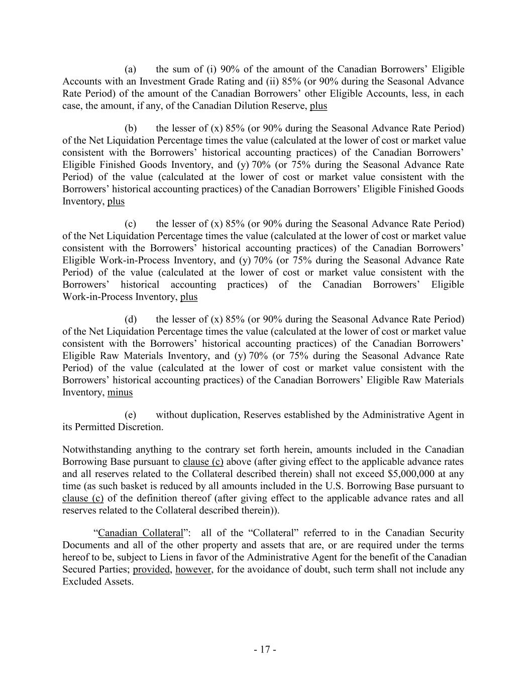 (a) the sum of (i) 90% of the amount of the Canadian Borrowers’ Eligible Accounts with an Investment Grade Rating and (ii) 85% (or 90% during the Seasonal Advance Rate Period) of the amount of the Canadian Borrowers’ other Eligible Accounts, less, in each case, the amount, if any, of the Canadian Dilution Reserve, plus (b) the lesser of (x) 85% (or 90% during the Seasonal Advance Rate Period) of the Net Liquidation Percentage times the value (calculated at the lower of cost or market value consistent with the Borrowers’ historical accounting practices) of the Canadian Borrowers’ Eligible Finished Goods Inventory, and (y) 70% (or 75% during the Seasonal Advance Rate Period) of the value (calculated at the lower of cost or market value consistent with the Borrowers’ historical accounting practices) of the Canadian Borrowers’ Eligible Finished Goods Inventory, plus (c) the lesser of (x) 85% (or 90% during the Seasonal Advance Rate Period) of the Net Liquidation Percentage times the value (calculated at the lower of cost or market value consistent with the Borrowers’ historical accounting practices) of the Canadian Borrowers’ Eligible Work-in-Process Inventory, and (y) 70% (or 75% during the Seasonal Advance Rate Period) of the value (calculated at the lower of cost or market value consistent with the Borrowers’ historical accounting practices) of the Canadian Borrowers’ Eligible Work-in-Process Inventory, plus (d) the lesser of (x) 85% (or 90% during the Seasonal Advance Rate Period) of the Net Liquidation Percentage times the value (calculated at the lower of cost or market value consistent with the Borrowers’ historical accounting practices) of the Canadian Borrowers’ Eligible Raw Materials Inventory, and (y) 70% (or 75% during the Seasonal Advance Rate Period) of the value (calculated at the lower of cost or market value consistent with the Borrowers’ historical accounting practices) of the Canadian Borrowers’ Eligible Raw Materials Inventory, minus (e) without duplication, Reserves established by the Administrative Agent in its Permitted Discretion. Notwithstanding anything to the contrary set forth herein, amounts included in the Canadian Borrowing Base pursuant to clause (c) above (after giving effect to the applicable advance rates and all reserves related to the Collateral described therein) shall not exceed $5,000,000 at any time (as such basket is reduced by all amounts included in the U.S. Borrowing Base pursuant to clause (c) of the definition thereof (after giving effect to the applicable advance rates and all reserves related to the Collateral described therein)). “Canadian Collateral”: all of the “Collateral” referred to in the Canadian Security Documents and all of the other property and assets that are, or are required under the terms hereof to be, subject to Liens in favor of the Administrative Agent for the benefit of the Canadian Secured Parties; provided, however, for the avoidance of doubt, such term shall not include any Excluded Assets. - 17 -
