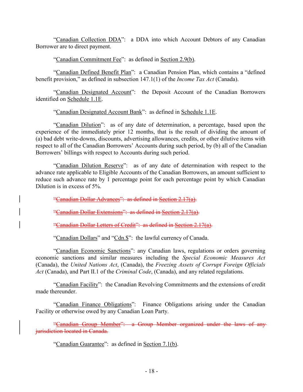“Canadian Collection DDA”: a DDA into which Account Debtors of any Canadian Borrower are to direct payment. “Canadian Commitment Fee”: as defined in Section 2.9(b). “Canadian Defined Benefit Plan”: a Canadian Pension Plan, which contains a “defined benefit provision,” as defined in subsection 147.1(1) of the Income Tax Act (Canada). “Canadian Designated Account”: the Deposit Account of the Canadian Borrowers identified on Schedule 1.1E. “Canadian Designated Account Bank”: as defined in Schedule 1.1E. “Canadian Dilution”: as of any date of determination, a percentage, based upon the experience of the immediately prior 12 months, that is the result of dividing the amount of (a) bad debt write-downs, discounts, advertising allowances, credits, or other dilutive items with respect to all of the Canadian Borrowers’ Accounts during such period, by (b) all of the Canadian Borrowers’ billings with respect to Accounts during such period. “Canadian Dilution Reserve”: as of any date of determination with respect to the advance rate applicable to Eligible Accounts of the Canadian Borrowers, an amount sufficient to reduce such advance rate by 1 percentage point for each percentage point by which Canadian Dilution is in excess of 5%. “Canadian Dollar Advances”: as defined in Section 2.17(a). “Canadian Dollar Extensions”: as defined in Section 2.17(a). “Canadian Dollar Letters of Credit”: as defined in Section 2.17(a). “Canadian Dollars” and “Cdn.$”: the lawful currency of Canada. “Canadian Economic Sanctions”: any Canadian laws, regulations or orders governing economic sanctions and similar measures including the Special Economic Measures Act (Canada), the United Nations Act, (Canada), the Freezing Assets of Corrupt Foreign Officials Act (Canada), and Part II.1 of the Criminal Code, (Canada), and any related regulations. “Canadian Facility”: the Canadian Revolving Commitments and the extensions of credit made thereunder. “Canadian Finance Obligations”: Finance Obligations arising under the Canadian Facility or otherwise owed by any Canadian Loan Party. “Canadian Group Member”: a Group Member organized under the laws of any jurisdiction located in Canada. “Canadian Guarantee”: as defined in Section 7.1(b). - 18 -