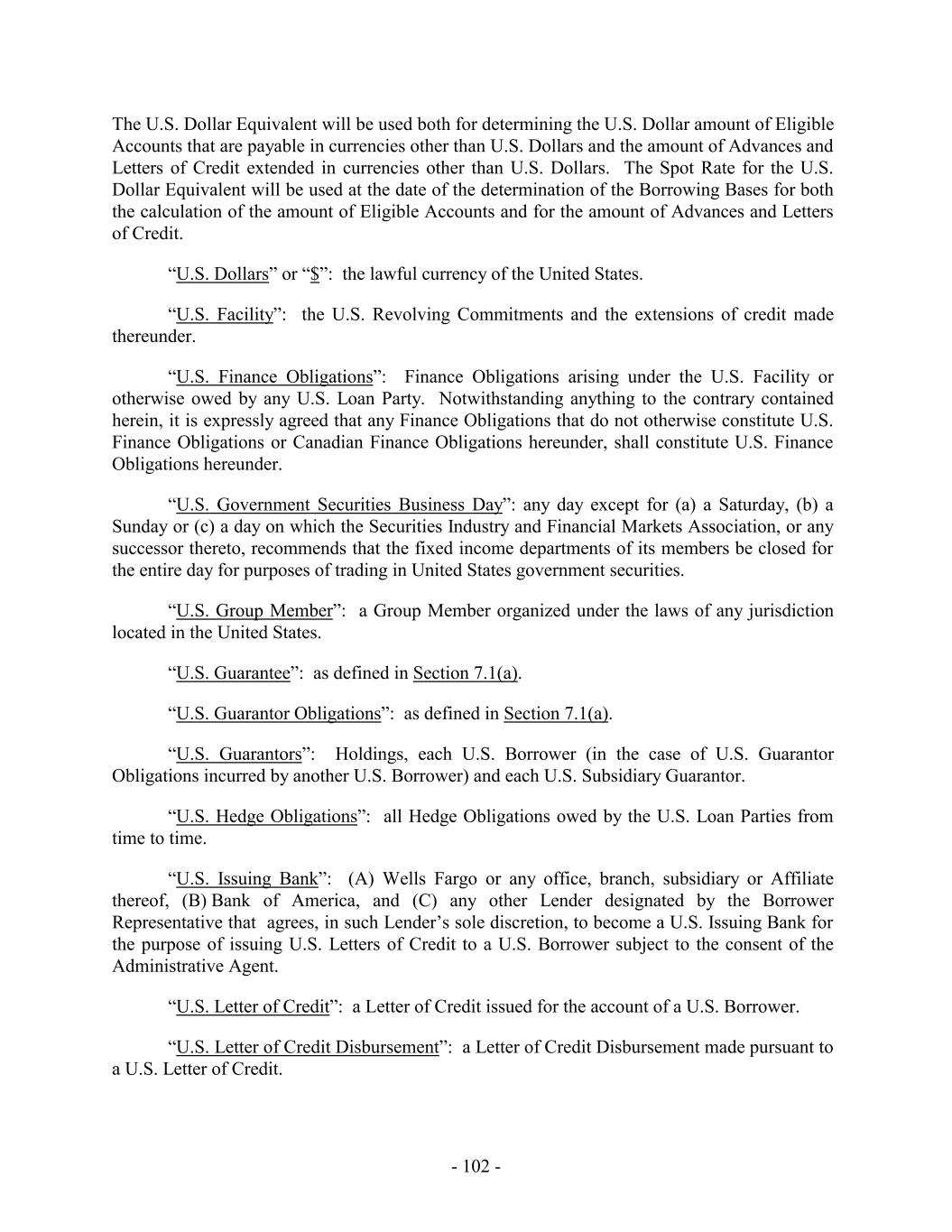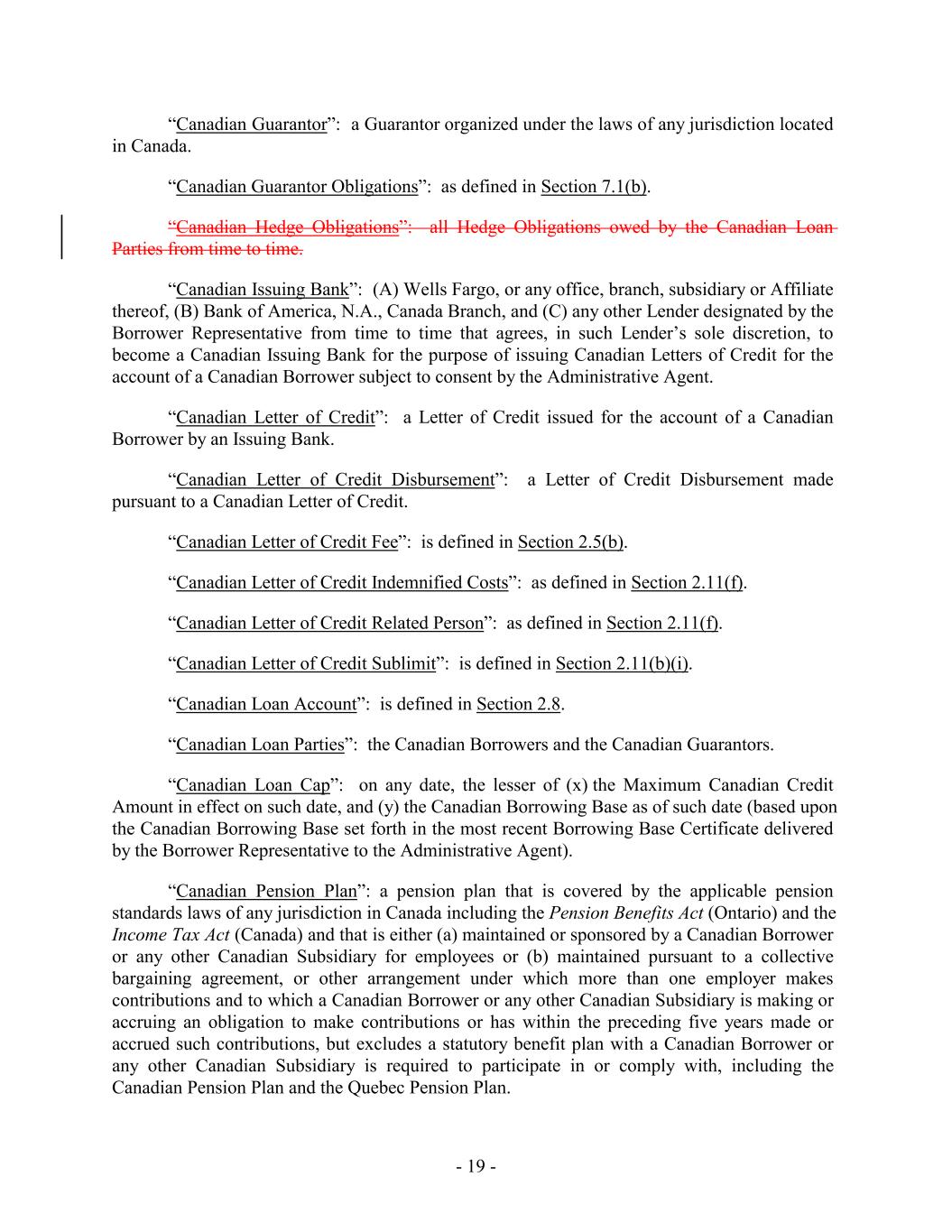 “Canadian Guarantor”: a Guarantor organized under the laws of any jurisdiction located in Canada. “Canadian Guarantor Obligations”: as defined in Section 7.1(b). “Canadian Hedge Obligations”: all Hedge Obligations owed by the Canadian Loan Parties from time to time. “Canadian Issuing Bank”: (A) Wells Fargo, or any office, branch, subsidiary or Affiliate thereof, (B) Bank of America, N.A., Canada Branch, and (C) any other Lender designated by the Borrower Representative from time to time that agrees, in such Lender’s sole discretion, to become a Canadian Issuing Bank for the purpose of issuing Canadian Letters of Credit for the account of a Canadian Borrower subject to consent by the Administrative Agent. “Canadian Letter of Credit”: a Letter of Credit issued for the account of a Canadian Borrower by an Issuing Bank. “Canadian Letter of Credit Disbursement”: a Letter of Credit Disbursement made pursuant to a Canadian Letter of Credit. “Canadian Letter of Credit Fee”: is defined in Section 2.5(b). “Canadian Letter of Credit Indemnified Costs”: as defined in Section 2.11(f). “Canadian Letter of Credit Related Person”: as defined in Section 2.11(f). “Canadian Letter of Credit Sublimit”: is defined in Section 2.11(b)(i). “Canadian Loan Account”: is defined in Section 2.8. “Canadian Loan Parties”: the Canadian Borrowers and the Canadian Guarantors. “Canadian Loan Cap”: on any date, the lesser of (x) the Maximum Canadian Credit Amount in effect on such date, and (y) the Canadian Borrowing Base as of such date (based upon the Canadian Borrowing Base set forth in the most recent Borrowing Base Certificate delivered by the Borrower Representative to the Administrative Agent). “Canadian Pension Plan”: a pension plan that is covered by the applicable pension standards laws of any jurisdiction in Canada including the Pension Benefits Act (Ontario) and the Income Tax Act (Canada) and that is either (a) maintained or sponsored by a Canadian Borrower or any other Canadian Subsidiary for employees or (b) maintained pursuant to a collective bargaining agreement, or other arrangement under which more than one employer makes contributions and to which a Canadian Borrower or any other Canadian Subsidiary is making or accruing an obligation to make contributions or has within the preceding five years made or accrued such contributions, but excludes a statutory benefit plan with a Canadian Borrower or any other Canadian Subsidiary is required to participate in or comply with, including the Canadian Pension Plan and the Quebec Pension Plan. - 19 -