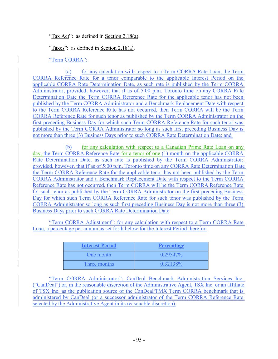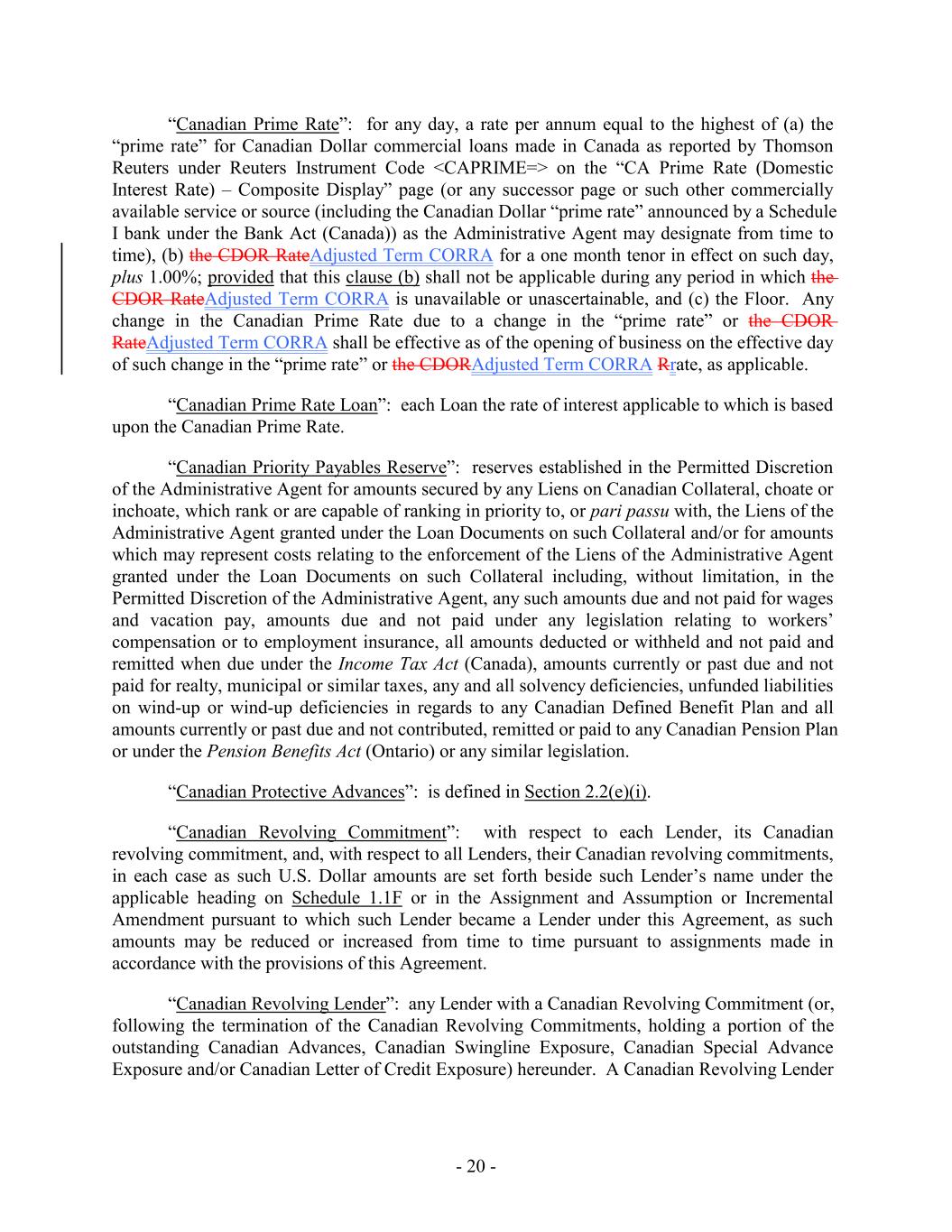 “Canadian Prime Rate”: for any day, a rate per annum equal to the highest of (a) the “prime rate” for Canadian Dollar commercial loans made in Canada as reported by Thomson Reuters under Reuters Instrument Code <CAPRIME=> on the “CA Prime Rate (Domestic Interest Rate) – Composite Display” page (or any successor page or such other commercially available service or source (including the Canadian Dollar “prime rate” announced by a Schedule I bank under the Bank Act (Canada)) as the Administrative Agent may designate from time to time), (b) the CDOR RateAdjusted Term CORRA for a one month tenor in effect on such day, plus 1.00%; provided that this clause (b) shall not be applicable during any period in which the CDOR RateAdjusted Term CORRA is unavailable or unascertainable, and (c) the Floor. Any change in the Canadian Prime Rate due to a change in the “prime rate” or the CDOR RateAdjusted Term CORRA shall be effective as of the opening of business on the effective day of such change in the “prime rate” or the CDORAdjusted Term CORRA Rrate, as applicable. “Canadian Prime Rate Loan”: each Loan the rate of interest applicable to which is based upon the Canadian Prime Rate. “Canadian Priority Payables Reserve”: reserves established in the Permitted Discretion of the Administrative Agent for amounts secured by any Liens on Canadian Collateral, choate or inchoate, which rank or are capable of ranking in priority to, or pari passu with, the Liens of the Administrative Agent granted under the Loan Documents on such Collateral and/or for amounts which may represent costs relating to the enforcement of the Liens of the Administrative Agent granted under the Loan Documents on such Collateral including, without limitation, in the Permitted Discretion of the Administrative Agent, any such amounts due and not paid for wages and vacation pay, amounts due and not paid under any legislation relating to workers’ compensation or to employment insurance, all amounts deducted or withheld and not paid and remitted when due under the Income Tax Act (Canada), amounts currently or past due and not paid for realty, municipal or similar taxes, any and all solvency deficiencies, unfunded liabilities on wind-up or wind-up deficiencies in regards to any Canadian Defined Benefit Plan and all amounts currently or past due and not contributed, remitted or paid to any Canadian Pension Plan or under the Pension Benefits Act (Ontario) or any similar legislation. “Canadian Protective Advances”: is defined in Section 2.2(e)(i). “Canadian Revolving Commitment”: with respect to each Lender, its Canadian revolving commitment, and, with respect to all Lenders, their Canadian revolving commitments, in each case as such U.S. Dollar amounts are set forth beside such Lender’s name under the applicable heading on Schedule 1.1F or in the Assignment and Assumption or Incremental Amendment pursuant to which such Lender became a Lender under this Agreement, as such amounts may be reduced or increased from time to time pursuant to assignments made in accordance with the provisions of this Agreement. “Canadian Revolving Lender”: any Lender with a Canadian Revolving Commitment (or, following the termination of the Canadian Revolving Commitments, holding a portion of the outstanding Canadian Advances, Canadian Swingline Exposure, Canadian Special Advance Exposure and/or Canadian Letter of Credit Exposure) hereunder. A Canadian Revolving Lender - 20 -