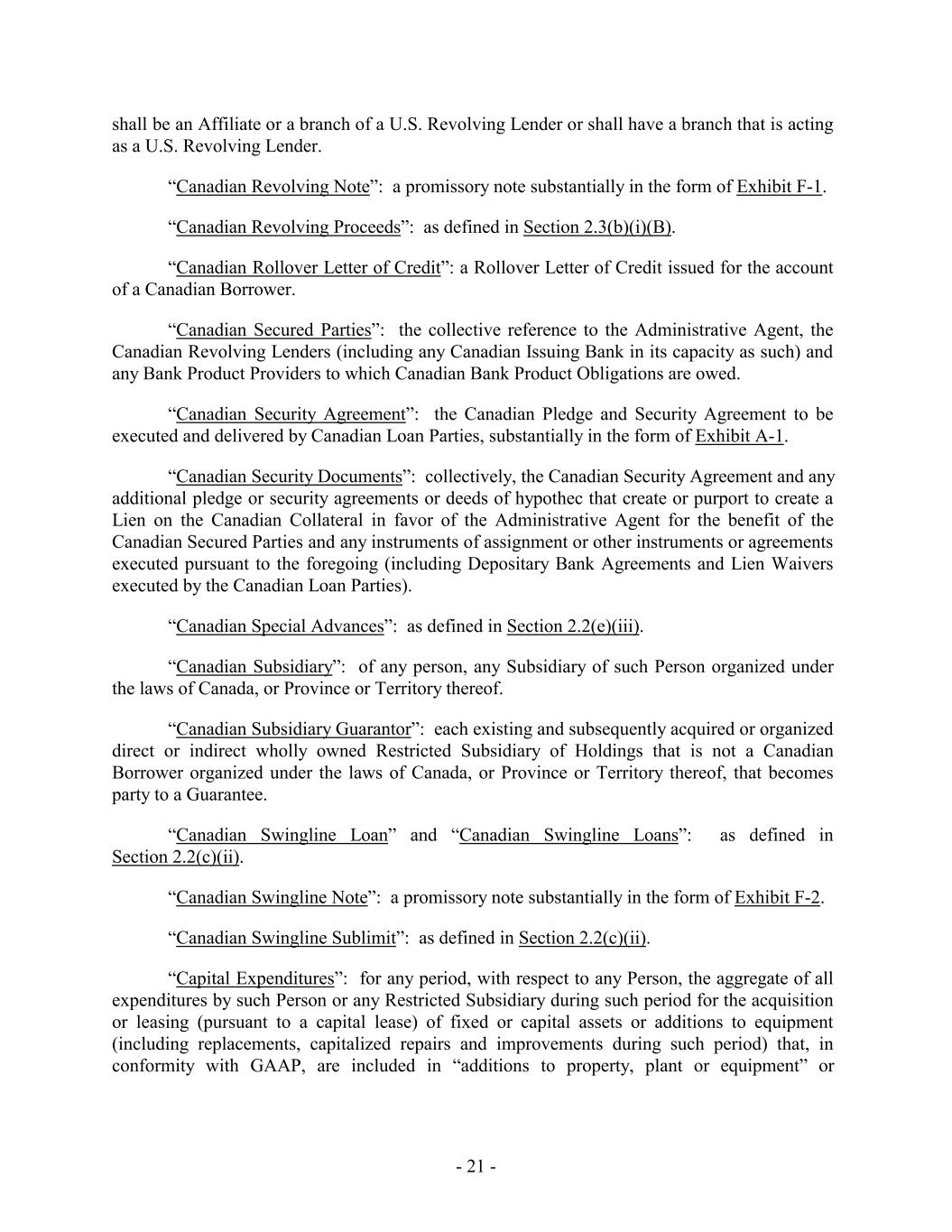 shall be an Affiliate or a branch of a U.S. Revolving Lender or shall have a branch that is acting as a U.S. Revolving Lender. “Canadian Revolving Note”: a promissory note substantially in the form of Exhibit F-1. “Canadian Revolving Proceeds”: as defined in Section 2.3(b)(i)(B). “Canadian Rollover Letter of Credit”: a Rollover Letter of Credit issued for the account of a Canadian Borrower. “Canadian Secured Parties”: the collective reference to the Administrative Agent, the Canadian Revolving Lenders (including any Canadian Issuing Bank in its capacity as such) and any Bank Product Providers to which Canadian Bank Product Obligations are owed. “Canadian Security Agreement”: the Canadian Pledge and Security Agreement to be executed and delivered by Canadian Loan Parties, substantially in the form of Exhibit A-1. “Canadian Security Documents”: collectively, the Canadian Security Agreement and any additional pledge or security agreements or deeds of hypothec that create or purport to create a Lien on the Canadian Collateral in favor of the Administrative Agent for the benefit of the Canadian Secured Parties and any instruments of assignment or other instruments or agreements executed pursuant to the foregoing (including Depositary Bank Agreements and Lien Waivers executed by the Canadian Loan Parties). “Canadian Special Advances”: as defined in Section 2.2(e)(iii). “Canadian Subsidiary”: of any person, any Subsidiary of such Person organized under the laws of Canada, or Province or Territory thereof. “Canadian Subsidiary Guarantor”: each existing and subsequently acquired or organized direct or indirect wholly owned Restricted Subsidiary of Holdings that is not a Canadian Borrower organized under the laws of Canada, or Province or Territory thereof, that becomes party to a Guarantee. “Canadian Swingline Loan” and “Canadian Swingline Loans”: as defined in Section 2.2(c)(ii). “Canadian Swingline Note”: a promissory note substantially in the form of Exhibit F-2. “Canadian Swingline Sublimit”: as defined in Section 2.2(c)(ii). “Capital Expenditures”: for any period, with respect to any Person, the aggregate of all expenditures by such Person or any Restricted Subsidiary during such period for the acquisition or leasing (pursuant to a capital lease) of fixed or capital assets or additions to equipment (including replacements, capitalized repairs and improvements during such period) that, in conformity with GAAP, are included in “additions to property, plant or equipment” or - 21 -