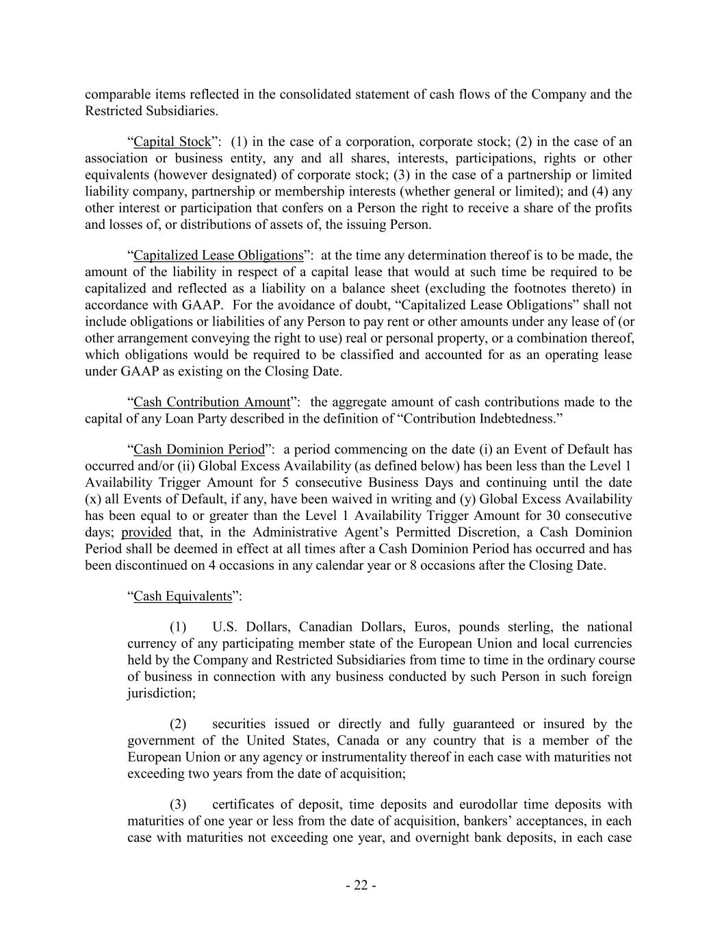 comparable items reflected in the consolidated statement of cash flows of the Company and the Restricted Subsidiaries. “Capital Stock”: (1) in the case of a corporation, corporate stock; (2) in the case of an association or business entity, any and all shares, interests, participations, rights or other equivalents (however designated) of corporate stock; (3) in the case of a partnership or limited liability company, partnership or membership interests (whether general or limited); and (4) any other interest or participation that confers on a Person the right to receive a share of the profits and losses of, or distributions of assets of, the issuing Person. “Capitalized Lease Obligations”: at the time any determination thereof is to be made, the amount of the liability in respect of a capital lease that would at such time be required to be capitalized and reflected as a liability on a balance sheet (excluding the footnotes thereto) in accordance with GAAP. For the avoidance of doubt, “Capitalized Lease Obligations” shall not include obligations or liabilities of any Person to pay rent or other amounts under any lease of (or other arrangement conveying the right to use) real or personal property, or a combination thereof, which obligations would be required to be classified and accounted for as an operating lease under GAAP as existing on the Closing Date. “Cash Contribution Amount”: the aggregate amount of cash contributions made to the capital of any Loan Party described in the definition of “Contribution Indebtedness.” “Cash Dominion Period”: a period commencing on the date (i) an Event of Default has occurred and/or (ii) Global Excess Availability (as defined below) has been less than the Level 1 Availability Trigger Amount for 5 consecutive Business Days and continuing until the date (x) all Events of Default, if any, have been waived in writing and (y) Global Excess Availability has been equal to or greater than the Level 1 Availability Trigger Amount for 30 consecutive days; provided that, in the Administrative Agent’s Permitted Discretion, a Cash Dominion Period shall be deemed in effect at all times after a Cash Dominion Period has occurred and has been discontinued on 4 occasions in any calendar year or 8 occasions after the Closing Date. “Cash Equivalents”: (1) U.S. Dollars, Canadian Dollars, Euros, pounds sterling, the national currency of any participating member state of the European Union and local currencies held by the Company and Restricted Subsidiaries from time to time in the ordinary course of business in connection with any business conducted by such Person in such foreign jurisdiction; (2) securities issued or directly and fully guaranteed or insured by the government of the United States, Canada or any country that is a member of the European Union or any agency or instrumentality thereof in each case with maturities not exceeding two years from the date of acquisition; (3) certificates of deposit, time deposits and eurodollar time deposits with maturities of one year or less from the date of acquisition, bankers’ acceptances, in each case with maturities not exceeding one year, and overnight bank deposits, in each case - 22 -