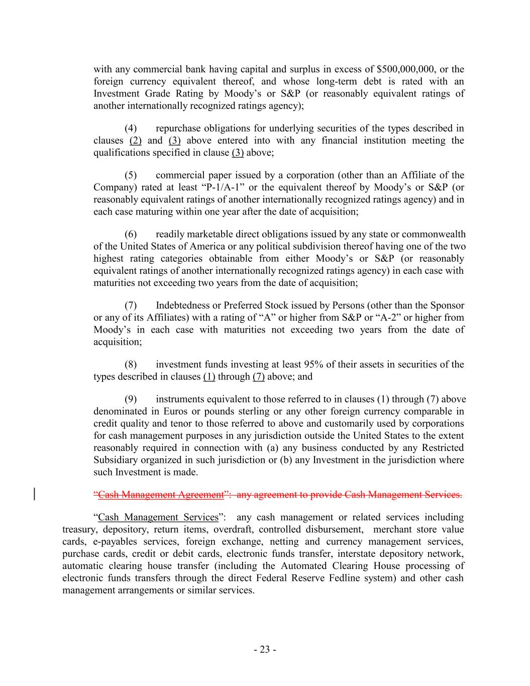 with any commercial bank having capital and surplus in excess of $500,000,000, or the foreign currency equivalent thereof, and whose long-term debt is rated with an Investment Grade Rating by Moody’s or S&P (or reasonably equivalent ratings of another internationally recognized ratings agency); (4) repurchase obligations for underlying securities of the types described in clauses (2) and (3) above entered into with any financial institution meeting the qualifications specified in clause (3) above; (5) commercial paper issued by a corporation (other than an Affiliate of the Company) rated at least “P-1/A-1” or the equivalent thereof by Moody’s or S&P (or reasonably equivalent ratings of another internationally recognized ratings agency) and in each case maturing within one year after the date of acquisition; (6) readily marketable direct obligations issued by any state or commonwealth of the United States of America or any political subdivision thereof having one of the two highest rating categories obtainable from either Moody’s or S&P (or reasonably equivalent ratings of another internationally recognized ratings agency) in each case with maturities not exceeding two years from the date of acquisition; (7) Indebtedness or Preferred Stock issued by Persons (other than the Sponsor or any of its Affiliates) with a rating of “A” or higher from S&P or “A-2” or higher from Moody’s in each case with maturities not exceeding two years from the date of acquisition; (8) investment funds investing at least 95% of their assets in securities of the types described in clauses (1) through (7) above; and (9) instruments equivalent to those referred to in clauses (1) through (7) above denominated in Euros or pounds sterling or any other foreign currency comparable in credit quality and tenor to those referred to above and customarily used by corporations for cash management purposes in any jurisdiction outside the United States to the extent reasonably required in connection with (a) any business conducted by any Restricted Subsidiary organized in such jurisdiction or (b) any Investment in the jurisdiction where such Investment is made. “Cash Management Agreement”: any agreement to provide Cash Management Services. “Cash Management Services”: any cash management or related services including treasury, depository, return items, overdraft, controlled disbursement, merchant store value cards, e-payables services, foreign exchange, netting and currency management services, purchase cards, credit or debit cards, electronic funds transfer, interstate depository network, automatic clearing house transfer (including the Automated Clearing House processing of electronic funds transfers through the direct Federal Reserve Fedline system) and other cash management arrangements or similar services. - 23 -