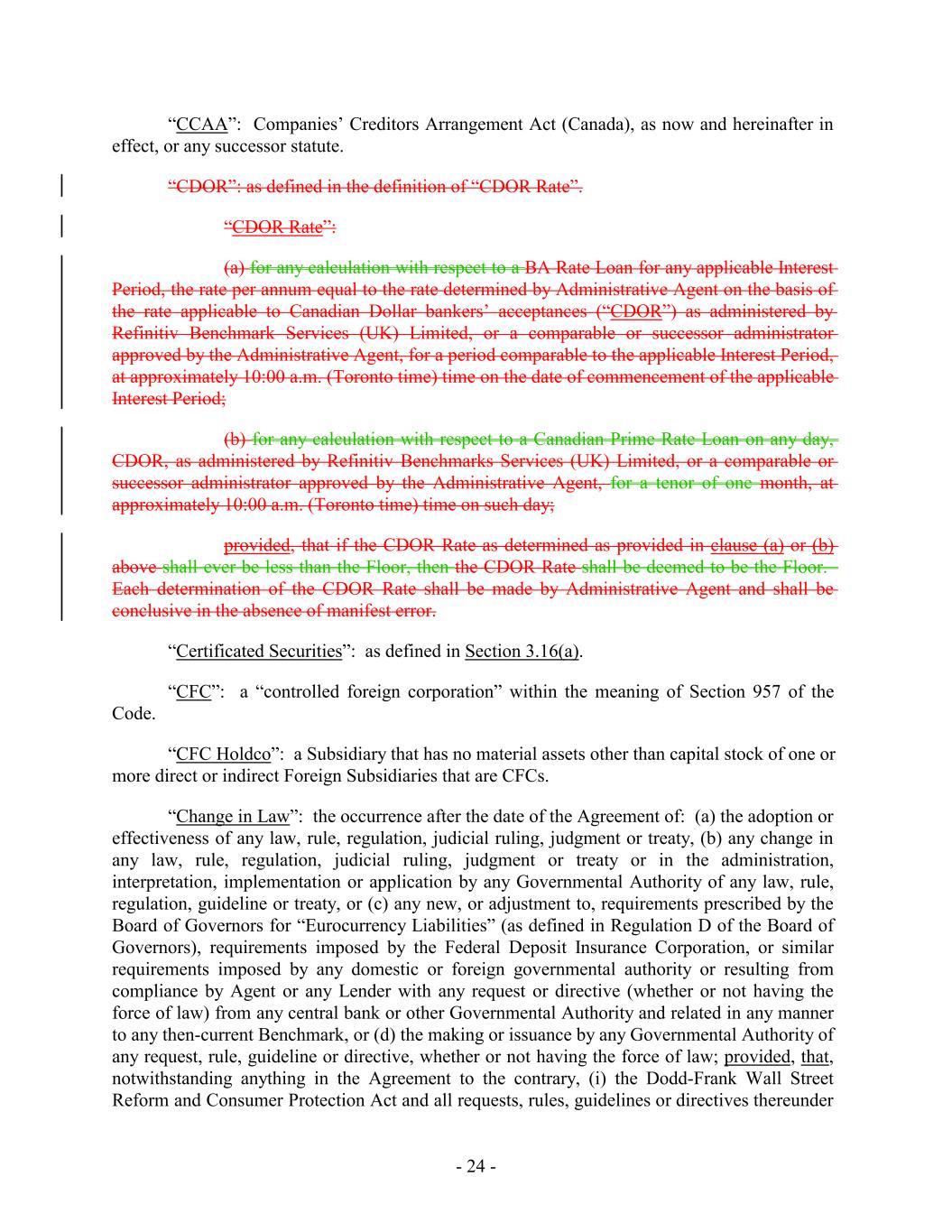 “CCAA”: Companies’ Creditors Arrangement Act (Canada), as now and hereinafter in effect, or any successor statute. “CDOR”: as defined in the definition of “CDOR Rate”. “CDOR Rate”: (a) for any calculation with respect to a BA Rate Loan for any applicable Interest Period, the rate per annum equal to the rate determined by Administrative Agent on the basis of the rate applicable to Canadian Dollar bankers’ acceptances (“CDOR”) as administered by Refinitiv Benchmark Services (UK) Limited, or a comparable or successor administrator approved by the Administrative Agent, for a period comparable to the applicable Interest Period, at approximately 10:00 a.m. (Toronto time) time on the date of commencement of the applicable Interest Period; (b) for any calculation with respect to a Canadian Prime Rate Loan on any day, CDOR, as administered by Refinitiv Benchmarks Services (UK) Limited, or a comparable or successor administrator approved by the Administrative Agent, for a tenor of one month, at approximately 10:00 a.m. (Toronto time) time on such day; provided, that if the CDOR Rate as determined as provided in clause (a) or (b) above shall ever be less than the Floor, then the CDOR Rate shall be deemed to be the Floor. Each determination of the CDOR Rate shall be made by Administrative Agent and shall be conclusive in the absence of manifest error. “Certificated Securities”: as defined in Section 3.16(a). “CFC”: a “controlled foreign corporation” within the meaning of Section 957 of the Code. “CFC Holdco”: a Subsidiary that has no material assets other than capital stock of one or more direct or indirect Foreign Subsidiaries that are CFCs. “Change in Law”: the occurrence after the date of the Agreement of: (a) the adoption or effectiveness of any law, rule, regulation, judicial ruling, judgment or treaty, (b) any change in any law, rule, regulation, judicial ruling, judgment or treaty or in the administration, interpretation, implementation or application by any Governmental Authority of any law, rule, regulation, guideline or treaty, or (c) any new, or adjustment to, requirements prescribed by the Board of Governors for “Eurocurrency Liabilities” (as defined in Regulation D of the Board of Governors), requirements imposed by the Federal Deposit Insurance Corporation, or similar requirements imposed by any domestic or foreign governmental authority or resulting from compliance by Agent or any Lender with any request or directive (whether or not having the force of law) from any central bank or other Governmental Authority and related in any manner to any then-current Benchmark, or (d) the making or issuance by any Governmental Authority of any request, rule, guideline or directive, whether or not having the force of law; provided, that, notwithstanding anything in the Agreement to the contrary, (i) the Dodd-Frank Wall Street Reform and Consumer Protection Act and all requests, rules, guidelines or directives thereunder - 24 -