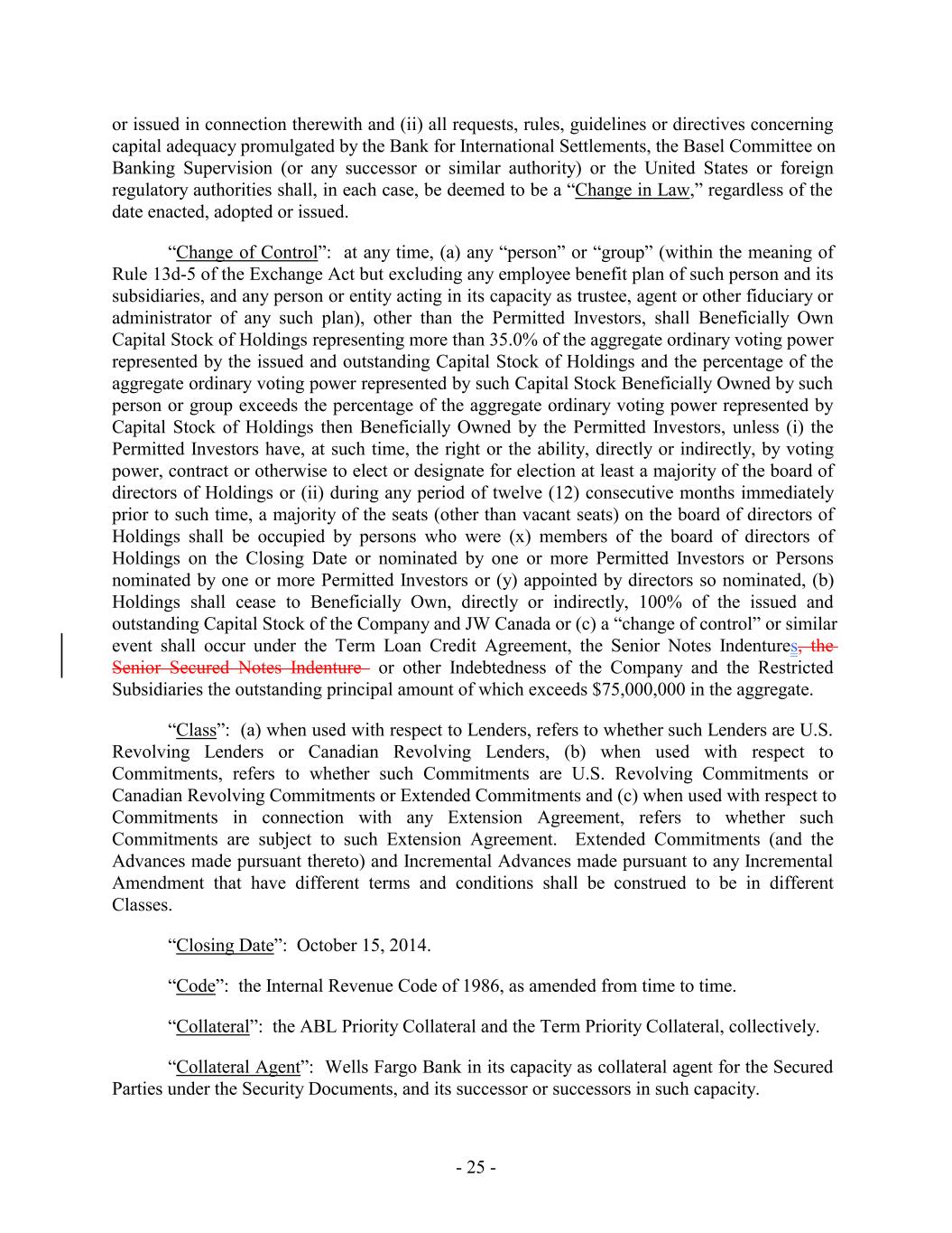or issued in connection therewith and (ii) all requests, rules, guidelines or directives concerning capital adequacy promulgated by the Bank for International Settlements, the Basel Committee on Banking Supervision (or any successor or similar authority) or the United States or foreign regulatory authorities shall, in each case, be deemed to be a “Change in Law,” regardless of the date enacted, adopted or issued. “Change of Control”: at any time, (a) any “person” or “group” (within the meaning of Rule 13d-5 of the Exchange Act but excluding any employee benefit plan of such person and its subsidiaries, and any person or entity acting in its capacity as trustee, agent or other fiduciary or administrator of any such plan), other than the Permitted Investors, shall Beneficially Own Capital Stock of Holdings representing more than 35.0% of the aggregate ordinary voting power represented by the issued and outstanding Capital Stock of Holdings and the percentage of the aggregate ordinary voting power represented by such Capital Stock Beneficially Owned by such person or group exceeds the percentage of the aggregate ordinary voting power represented by Capital Stock of Holdings then Beneficially Owned by the Permitted Investors, unless (i) the Permitted Investors have, at such time, the right or the ability, directly or indirectly, by voting power, contract or otherwise to elect or designate for election at least a majority of the board of directors of Holdings or (ii) during any period of twelve (12) consecutive months immediately prior to such time, a majority of the seats (other than vacant seats) on the board of directors of Holdings shall be occupied by persons who were (x) members of the board of directors of Holdings on the Closing Date or nominated by one or more Permitted Investors or Persons nominated by one or more Permitted Investors or (y) appointed by directors so nominated, (b) Holdings shall cease to Beneficially Own, directly or indirectly, 100% of the issued and outstanding Capital Stock of the Company and JW Canada or (c) a “change of control” or similar event shall occur under the Term Loan Credit Agreement, the Senior Notes Indentures, the Senior Secured Notes Indenture or other Indebtedness of the Company and the Restricted Subsidiaries the outstanding principal amount of which exceeds $75,000,000 in the aggregate. “Class”: (a) when used with respect to Lenders, refers to whether such Lenders are U.S. Revolving Lenders or Canadian Revolving Lenders, (b) when used with respect to Commitments, refers to whether such Commitments are U.S. Revolving Commitments or Canadian Revolving Commitments or Extended Commitments and (c) when used with respect to Commitments in connection with any Extension Agreement, refers to whether such Commitments are subject to such Extension Agreement. Extended Commitments (and the Advances made pursuant thereto) and Incremental Advances made pursuant to any Incremental Amendment that have different terms and conditions shall be construed to be in different Classes. “Closing Date”: October 15, 2014. “Code”: the Internal Revenue Code of 1986, as amended from time to time. “Collateral”: the ABL Priority Collateral and the Term Priority Collateral, collectively. “Collateral Agent”: Wells Fargo Bank in its capacity as collateral agent for the Secured Parties under the Security Documents, and its successor or successors in such capacity. - 25 -