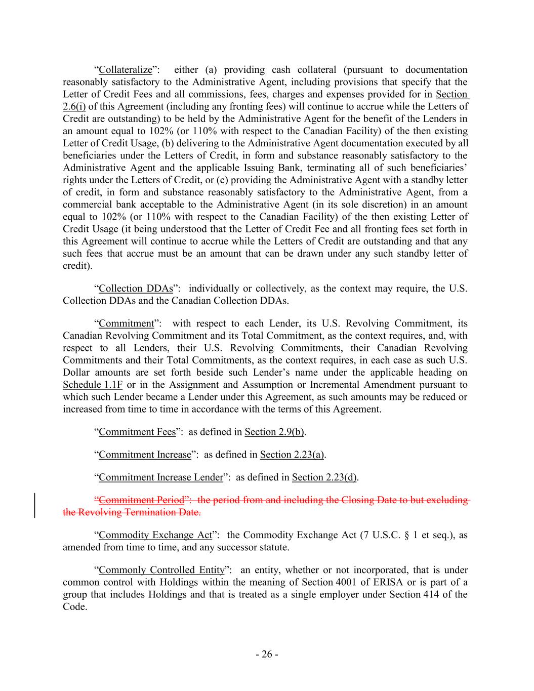 “Collateralize”: either (a) providing cash collateral (pursuant to documentation reasonably satisfactory to the Administrative Agent, including provisions that specify that the Letter of Credit Fees and all commissions, fees, charges and expenses provided for in Section 2.6(i) of this Agreement (including any fronting fees) will continue to accrue while the Letters of Credit are outstanding) to be held by the Administrative Agent for the benefit of the Lenders in an amount equal to 102% (or 110% with respect to the Canadian Facility) of the then existing Letter of Credit Usage, (b) delivering to the Administrative Agent documentation executed by all beneficiaries under the Letters of Credit, in form and substance reasonably satisfactory to the Administrative Agent and the applicable Issuing Bank, terminating all of such beneficiaries’ rights under the Letters of Credit, or (c) providing the Administrative Agent with a standby letter of credit, in form and substance reasonably satisfactory to the Administrative Agent, from a commercial bank acceptable to the Administrative Agent (in its sole discretion) in an amount equal to 102% (or 110% with respect to the Canadian Facility) of the then existing Letter of Credit Usage (it being understood that the Letter of Credit Fee and all fronting fees set forth in this Agreement will continue to accrue while the Letters of Credit are outstanding and that any such fees that accrue must be an amount that can be drawn under any such standby letter of credit). “Collection DDAs”: individually or collectively, as the context may require, the U.S. Collection DDAs and the Canadian Collection DDAs. “Commitment”: with respect to each Lender, its U.S. Revolving Commitment, its Canadian Revolving Commitment and its Total Commitment, as the context requires, and, with respect to all Lenders, their U.S. Revolving Commitments, their Canadian Revolving Commitments and their Total Commitments, as the context requires, in each case as such U.S. Dollar amounts are set forth beside such Lender’s name under the applicable heading on Schedule 1.1F or in the Assignment and Assumption or Incremental Amendment pursuant to which such Lender became a Lender under this Agreement, as such amounts may be reduced or increased from time to time in accordance with the terms of this Agreement. “Commitment Fees”: as defined in Section 2.9(b). “Commitment Increase”: as defined in Section 2.23(a). “Commitment Increase Lender”: as defined in Section 2.23(d). “Commitment Period”: the period from and including the Closing Date to but excluding the Revolving Termination Date. “Commodity Exchange Act”: the Commodity Exchange Act (7 U.S.C. § 1 et seq.), as amended from time to time, and any successor statute. “Commonly Controlled Entity”: an entity, whether or not incorporated, that is under common control with Holdings within the meaning of Section 4001 of ERISA or is part of a group that includes Holdings and that is treated as a single employer under Section 414 of the Code. - 26 -