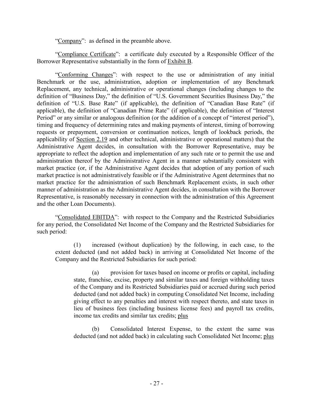 “Company”: as defined in the preamble above. “Compliance Certificate”: a certificate duly executed by a Responsible Officer of the Borrower Representative substantially in the form of Exhibit B. “Conforming Changes”: with respect to the use or administration of any initial Benchmark or the use, administration, adoption or implementation of any Benchmark Replacement, any technical, administrative or operational changes (including changes to the definition of “Business Day,” the definition of “U.S. Government Securities Business Day,” the definition of “U.S. Base Rate” (if applicable), the definition of “Canadian Base Rate” (if applicable), the definition of “Canadian Prime Rate” (if applicable), the definition of “Interest Period” or any similar or analogous definition (or the addition of a concept of “interest period”), timing and frequency of determining rates and making payments of interest, timing of borrowing requests or prepayment, conversion or continuation notices, length of lookback periods, the applicability of Section 2.19 and other technical, administrative or operational matters) that the Administrative Agent decides, in consultation with the Borrower Representative, may be appropriate to reflect the adoption and implementation of any such rate or to permit the use and administration thereof by the Administrative Agent in a manner substantially consistent with market practice (or, if the Administrative Agent decides that adoption of any portion of such market practice is not administratively feasible or if the Administrative Agent determines that no market practice for the administration of such Benchmark Replacement exists, in such other manner of administration as the Administrative Agent decides, in consultation with the Borrower Representative, is reasonably necessary in connection with the administration of this Agreement and the other Loan Documents). “Consolidated EBITDA”: with respect to the Company and the Restricted Subsidiaries for any period, the Consolidated Net Income of the Company and the Restricted Subsidiaries for such period: (1) increased (without duplication) by the following, in each case, to the extent deducted (and not added back) in arriving at Consolidated Net Income of the Company and the Restricted Subsidiaries for such period: (a) provision for taxes based on income or profits or capital, including state, franchise, excise, property and similar taxes and foreign withholding taxes of the Company and its Restricted Subsidiaries paid or accrued during such period deducted (and not added back) in computing Consolidated Net Income, including giving effect to any penalties and interest with respect thereto, and state taxes in lieu of business fees (including business license fees) and payroll tax credits, income tax credits and similar tax credits; plus (b) Consolidated Interest Expense, to the extent the same was deducted (and not added back) in calculating such Consolidated Net Income; plus - 27 -