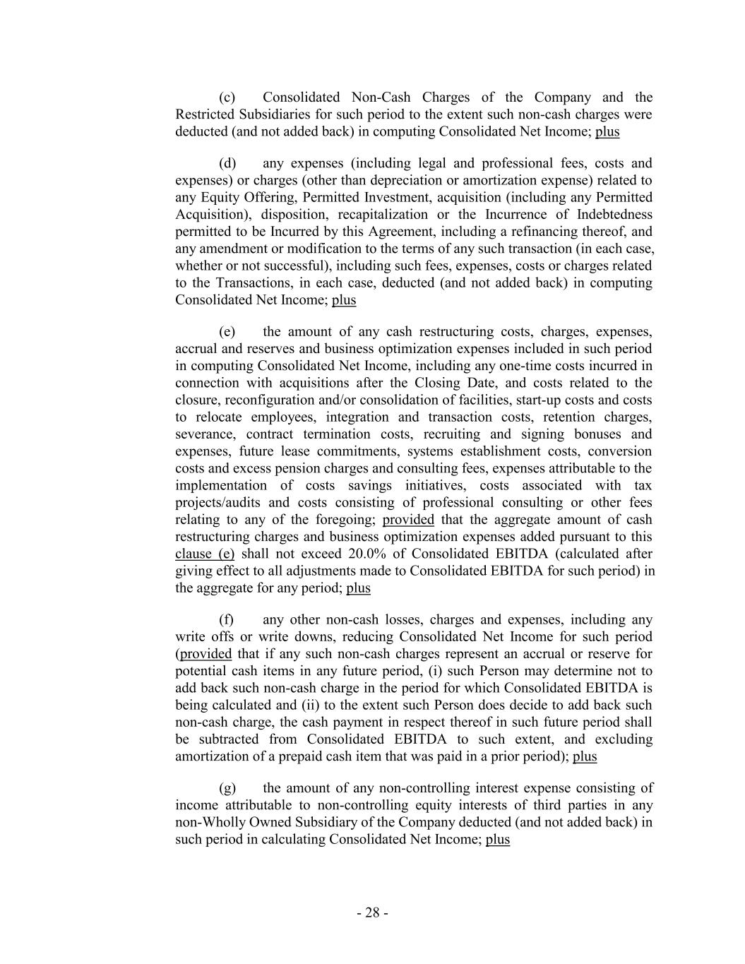 (c) Consolidated Non-Cash Charges of the Company and the Restricted Subsidiaries for such period to the extent such non-cash charges were deducted (and not added back) in computing Consolidated Net Income; plus (d) any expenses (including legal and professional fees, costs and expenses) or charges (other than depreciation or amortization expense) related to any Equity Offering, Permitted Investment, acquisition (including any Permitted Acquisition), disposition, recapitalization or the Incurrence of Indebtedness permitted to be Incurred by this Agreement, including a refinancing thereof, and any amendment or modification to the terms of any such transaction (in each case, whether or not successful), including such fees, expenses, costs or charges related to the Transactions, in each case, deducted (and not added back) in computing Consolidated Net Income; plus (e) the amount of any cash restructuring costs, charges, expenses, accrual and reserves and business optimization expenses included in such period in computing Consolidated Net Income, including any one-time costs incurred in connection with acquisitions after the Closing Date, and costs related to the closure, reconfiguration and/or consolidation of facilities, start-up costs and costs to relocate employees, integration and transaction costs, retention charges, severance, contract termination costs, recruiting and signing bonuses and expenses, future lease commitments, systems establishment costs, conversion costs and excess pension charges and consulting fees, expenses attributable to the implementation of costs savings initiatives, costs associated with tax projects/audits and costs consisting of professional consulting or other fees relating to any of the foregoing; provided that the aggregate amount of cash restructuring charges and business optimization expenses added pursuant to this clause (e) shall not exceed 20.0% of Consolidated EBITDA (calculated after giving effect to all adjustments made to Consolidated EBITDA for such period) in the aggregate for any period; plus (f) any other non-cash losses, charges and expenses, including any write offs or write downs, reducing Consolidated Net Income for such period (provided that if any such non-cash charges represent an accrual or reserve for potential cash items in any future period, (i) such Person may determine not to add back such non-cash charge in the period for which Consolidated EBITDA is being calculated and (ii) to the extent such Person does decide to add back such non-cash charge, the cash payment in respect thereof in such future period shall be subtracted from Consolidated EBITDA to such extent, and excluding amortization of a prepaid cash item that was paid in a prior period); plus (g) the amount of any non-controlling interest expense consisting of income attributable to non-controlling equity interests of third parties in any non-Wholly Owned Subsidiary of the Company deducted (and not added back) in such period in calculating Consolidated Net Income; plus - 28 -