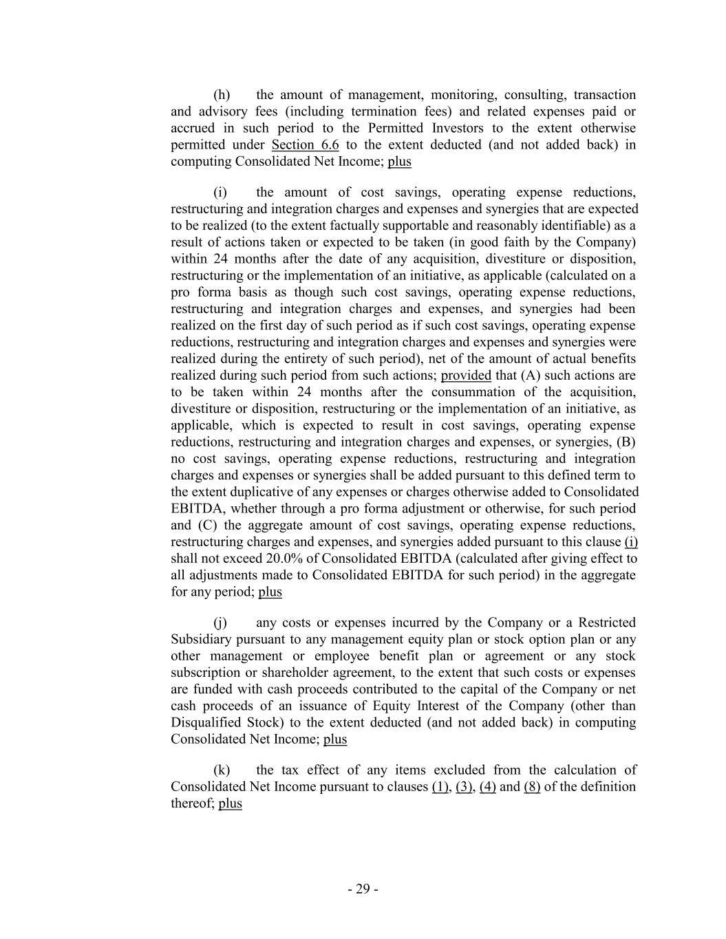 (h) the amount of management, monitoring, consulting, transaction and advisory fees (including termination fees) and related expenses paid or accrued in such period to the Permitted Investors to the extent otherwise permitted under Section 6.6 to the extent deducted (and not added back) in computing Consolidated Net Income; plus (i) the amount of cost savings, operating expense reductions, restructuring and integration charges and expenses and synergies that are expected to be realized (to the extent factually supportable and reasonably identifiable) as a result of actions taken or expected to be taken (in good faith by the Company) within 24 months after the date of any acquisition, divestiture or disposition, restructuring or the implementation of an initiative, as applicable (calculated on a pro forma basis as though such cost savings, operating expense reductions, restructuring and integration charges and expenses, and synergies had been realized on the first day of such period as if such cost savings, operating expense reductions, restructuring and integration charges and expenses and synergies were realized during the entirety of such period), net of the amount of actual benefits realized during such period from such actions; provided that (A) such actions are to be taken within 24 months after the consummation of the acquisition, divestiture or disposition, restructuring or the implementation of an initiative, as applicable, which is expected to result in cost savings, operating expense reductions, restructuring and integration charges and expenses, or synergies, (B) no cost savings, operating expense reductions, restructuring and integration charges and expenses or synergies shall be added pursuant to this defined term to the extent duplicative of any expenses or charges otherwise added to Consolidated EBITDA, whether through a pro forma adjustment or otherwise, for such period and (C) the aggregate amount of cost savings, operating expense reductions, restructuring charges and expenses, and synergies added pursuant to this clause (i) shall not exceed 20.0% of Consolidated EBITDA (calculated after giving effect to all adjustments made to Consolidated EBITDA for such period) in the aggregate for any period; plus (j) any costs or expenses incurred by the Company or a Restricted Subsidiary pursuant to any management equity plan or stock option plan or any other management or employee benefit plan or agreement or any stock subscription or shareholder agreement, to the extent that such costs or expenses are funded with cash proceeds contributed to the capital of the Company or net cash proceeds of an issuance of Equity Interest of the Company (other than Disqualified Stock) to the extent deducted (and not added back) in computing Consolidated Net Income; plus (k) the tax effect of any items excluded from the calculation of Consolidated Net Income pursuant to clauses (1), (3), (4) and (8) of the definition thereof; plus - 29 -