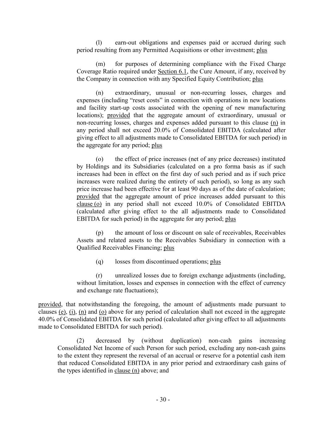 (l) earn-out obligations and expenses paid or accrued during such period resulting from any Permitted Acquisitions or other investment; plus (m) for purposes of determining compliance with the Fixed Charge Coverage Ratio required under Section 6.1, the Cure Amount, if any, received by the Company in connection with any Specified Equity Contribution; plus (n) extraordinary, unusual or non-recurring losses, charges and expenses (including “reset costs” in connection with operations in new locations and facility start-up costs associated with the opening of new manufacturing locations); provided that the aggregate amount of extraordinary, unusual or non-recurring losses, charges and expenses added pursuant to this clause (n) in any period shall not exceed 20.0% of Consolidated EBITDA (calculated after giving effect to all adjustments made to Consolidated EBITDA for such period) in the aggregate for any period; plus (o) the effect of price increases (net of any price decreases) instituted by Holdings and its Subsidiaries (calculated on a pro forma basis as if such increases had been in effect on the first day of such period and as if such price increases were realized during the entirety of such period), so long as any such price increase had been effective for at least 90 days as of the date of calculation; provided that the aggregate amount of price increases added pursuant to this clause (o) in any period shall not exceed 10.0% of Consolidated EBITDA (calculated after giving effect to the all adjustments made to Consolidated EBITDA for such period) in the aggregate for any period; plus (p) the amount of loss or discount on sale of receivables, Receivables Assets and related assets to the Receivables Subsidiary in connection with a Qualified Receivables Financing; plus (q) losses from discontinued operations; plus (r) unrealized losses due to foreign exchange adjustments (including, without limitation, losses and expenses in connection with the effect of currency and exchange rate fluctuations); provided, that notwithstanding the foregoing, the amount of adjustments made pursuant to clauses (e), (i), (n) and (o) above for any period of calculation shall not exceed in the aggregate 40.0% of Consolidated EBITDA for such period (calculated after giving effect to all adjustments made to Consolidated EBITDA for such period). (2) decreased by (without duplication) non-cash gains increasing Consolidated Net Income of such Person for such period, excluding any non-cash gains to the extent they represent the reversal of an accrual or reserve for a potential cash item that reduced Consolidated EBITDA in any prior period and extraordinary cash gains of the types identified in clause (n) above; and - 30 -