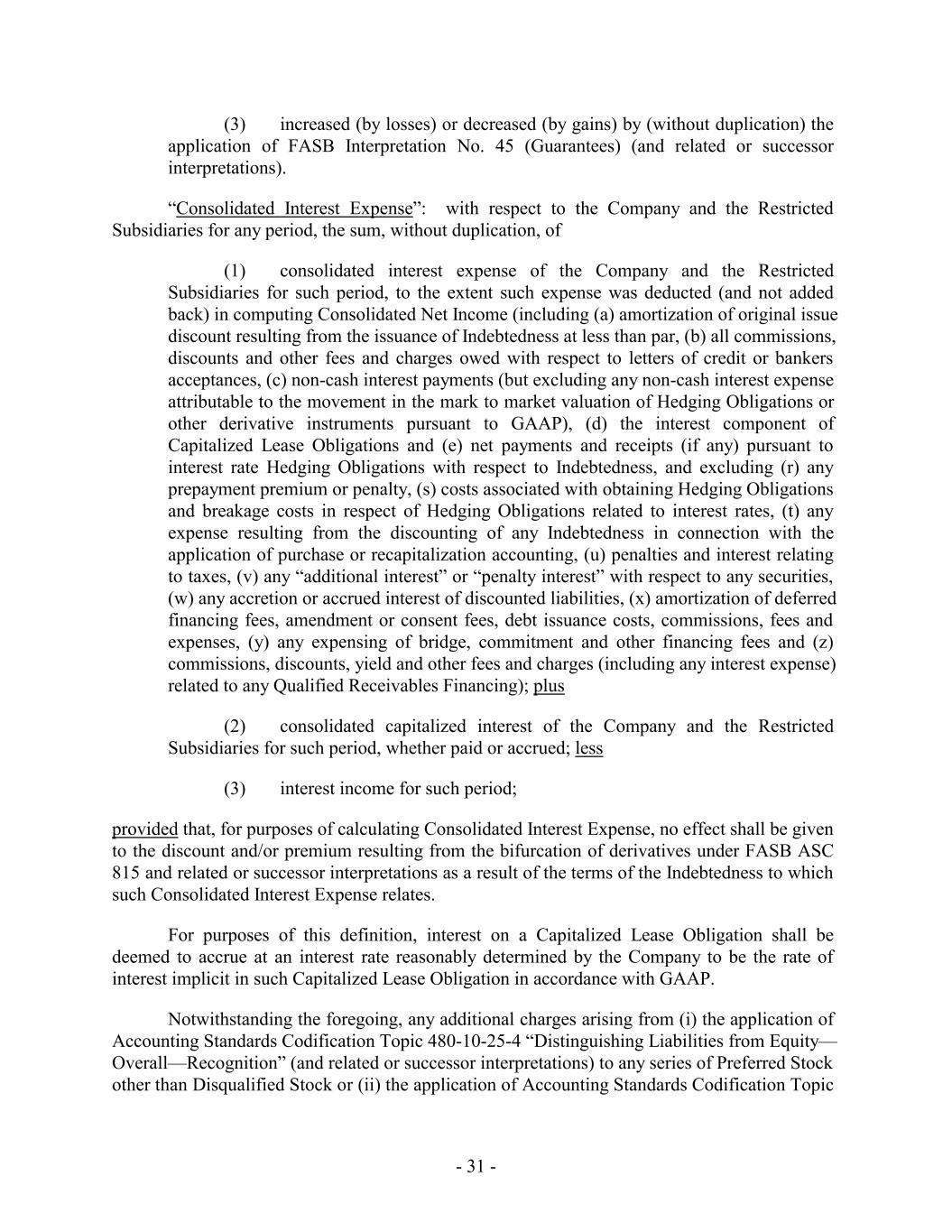(3) increased (by losses) or decreased (by gains) by (without duplication) the application of FASB Interpretation No. 45 (Guarantees) (and related or successor interpretations). “Consolidated Interest Expense”: with respect to the Company and the Restricted Subsidiaries for any period, the sum, without duplication, of (1) consolidated interest expense of the Company and the Restricted Subsidiaries for such period, to the extent such expense was deducted (and not added back) in computing Consolidated Net Income (including (a) amortization of original issue discount resulting from the issuance of Indebtedness at less than par, (b) all commissions, discounts and other fees and charges owed with respect to letters of credit or bankers acceptances, (c) non-cash interest payments (but excluding any non-cash interest expense attributable to the movement in the mark to market valuation of Hedging Obligations or other derivative instruments pursuant to GAAP), (d) the interest component of Capitalized Lease Obligations and (e) net payments and receipts (if any) pursuant to interest rate Hedging Obligations with respect to Indebtedness, and excluding (r) any prepayment premium or penalty, (s) costs associated with obtaining Hedging Obligations and breakage costs in respect of Hedging Obligations related to interest rates, (t) any expense resulting from the discounting of any Indebtedness in connection with the application of purchase or recapitalization accounting, (u) penalties and interest relating to taxes, (v) any “additional interest” or “penalty interest” with respect to any securities, (w) any accretion or accrued interest of discounted liabilities, (x) amortization of deferred financing fees, amendment or consent fees, debt issuance costs, commissions, fees and expenses, (y) any expensing of bridge, commitment and other financing fees and (z) commissions, discounts, yield and other fees and charges (including any interest expense) related to any Qualified Receivables Financing); plus (2) consolidated capitalized interest of the Company and the Restricted Subsidiaries for such period, whether paid or accrued; less (3) interest income for such period; provided that, for purposes of calculating Consolidated Interest Expense, no effect shall be given to the discount and/or premium resulting from the bifurcation of derivatives under FASB ASC 815 and related or successor interpretations as a result of the terms of the Indebtedness to which such Consolidated Interest Expense relates. For purposes of this definition, interest on a Capitalized Lease Obligation shall be deemed to accrue at an interest rate reasonably determined by the Company to be the rate of interest implicit in such Capitalized Lease Obligation in accordance with GAAP. Notwithstanding the foregoing, any additional charges arising from (i) the application of Accounting Standards Codification Topic 480-10-25-4 “Distinguishing Liabilities from Equity— Overall—Recognition” (and related or successor interpretations) to any series of Preferred Stock other than Disqualified Stock or (ii) the application of Accounting Standards Codification Topic - 31 -