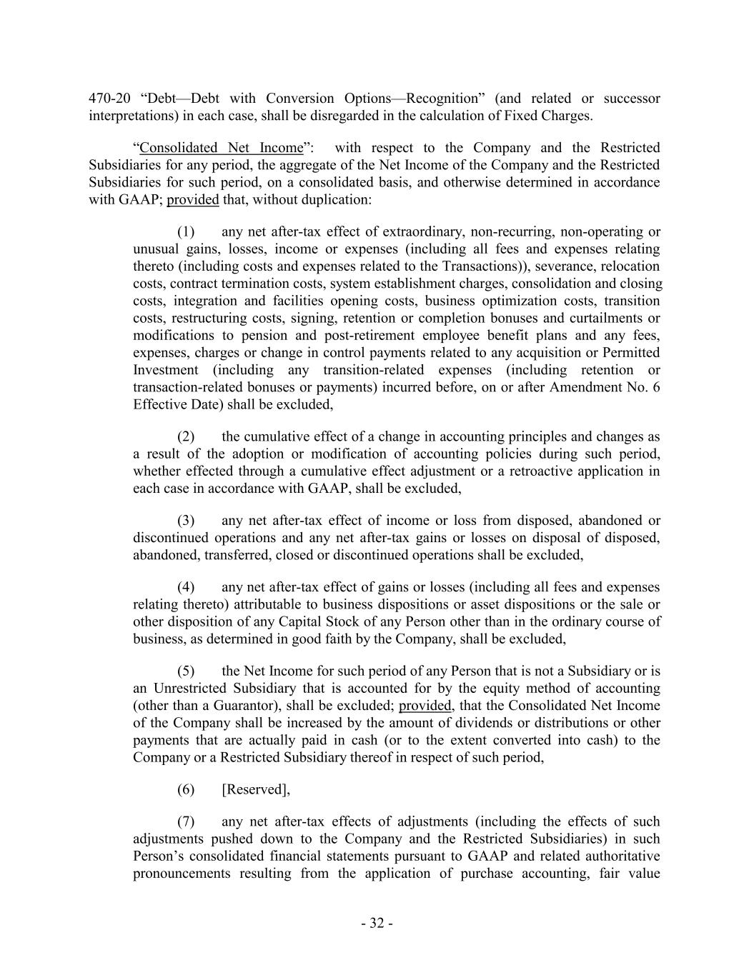 470-20 “Debt—Debt with Conversion Options—Recognition” (and related or successor interpretations) in each case, shall be disregarded in the calculation of Fixed Charges. “Consolidated Net Income”: with respect to the Company and the Restricted Subsidiaries for any period, the aggregate of the Net Income of the Company and the Restricted Subsidiaries for such period, on a consolidated basis, and otherwise determined in accordance with GAAP; provided that, without duplication: (1) any net after-tax effect of extraordinary, non-recurring, non-operating or unusual gains, losses, income or expenses (including all fees and expenses relating thereto (including costs and expenses related to the Transactions)), severance, relocation costs, contract termination costs, system establishment charges, consolidation and closing costs, integration and facilities opening costs, business optimization costs, transition costs, restructuring costs, signing, retention or completion bonuses and curtailments or modifications to pension and post-retirement employee benefit plans and any fees, expenses, charges or change in control payments related to any acquisition or Permitted Investment (including any transition-related expenses (including retention or transaction-related bonuses or payments) incurred before, on or after Amendment No. 6 Effective Date) shall be excluded, (2) the cumulative effect of a change in accounting principles and changes as a result of the adoption or modification of accounting policies during such period, whether effected through a cumulative effect adjustment or a retroactive application in each case in accordance with GAAP, shall be excluded, (3) any net after-tax effect of income or loss from disposed, abandoned or discontinued operations and any net after-tax gains or losses on disposal of disposed, abandoned, transferred, closed or discontinued operations shall be excluded, (4) any net after-tax effect of gains or losses (including all fees and expenses relating thereto) attributable to business dispositions or asset dispositions or the sale or other disposition of any Capital Stock of any Person other than in the ordinary course of business, as determined in good faith by the Company, shall be excluded, (5) the Net Income for such period of any Person that is not a Subsidiary or is an Unrestricted Subsidiary that is accounted for by the equity method of accounting (other than a Guarantor), shall be excluded; provided, that the Consolidated Net Income of the Company shall be increased by the amount of dividends or distributions or other payments that are actually paid in cash (or to the extent converted into cash) to the Company or a Restricted Subsidiary thereof in respect of such period, (6) [Reserved], (7) any net after-tax effects of adjustments (including the effects of such adjustments pushed down to the Company and the Restricted Subsidiaries) in such Person’s consolidated financial statements pursuant to GAAP and related authoritative pronouncements resulting from the application of purchase accounting, fair value - 32 -