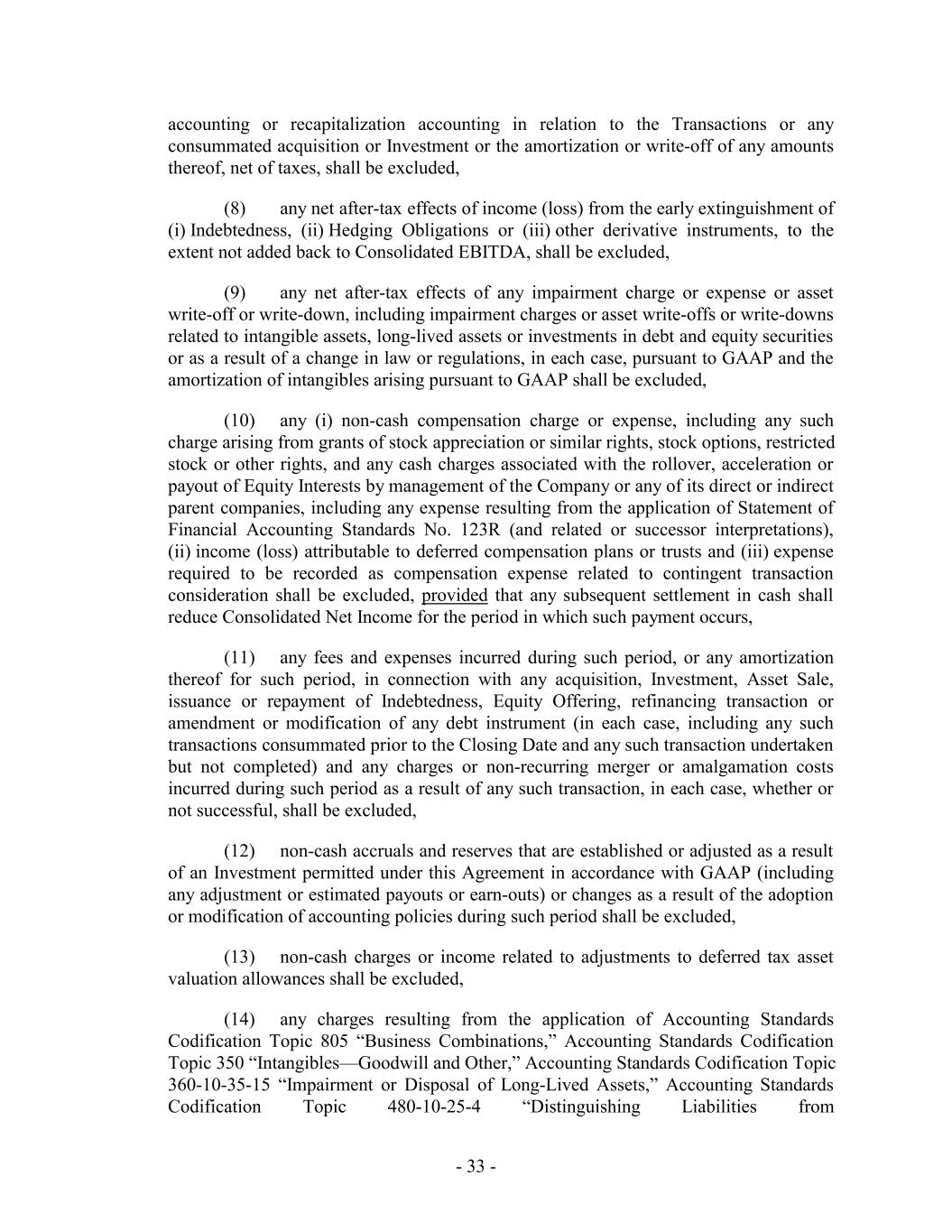 accounting or recapitalization accounting in relation to the Transactions or any consummated acquisition or Investment or the amortization or write-off of any amounts thereof, net of taxes, shall be excluded, (8) any net after-tax effects of income (loss) from the early extinguishment of (i) Indebtedness, (ii) Hedging Obligations or (iii) other derivative instruments, to the extent not added back to Consolidated EBITDA, shall be excluded, (9) any net after-tax effects of any impairment charge or expense or asset write-off or write-down, including impairment charges or asset write-offs or write-downs related to intangible assets, long-lived assets or investments in debt and equity securities or as a result of a change in law or regulations, in each case, pursuant to GAAP and the amortization of intangibles arising pursuant to GAAP shall be excluded, (10) any (i) non-cash compensation charge or expense, including any such charge arising from grants of stock appreciation or similar rights, stock options, restricted stock or other rights, and any cash charges associated with the rollover, acceleration or payout of Equity Interests by management of the Company or any of its direct or indirect parent companies, including any expense resulting from the application of Statement of Financial Accounting Standards No. 123R (and related or successor interpretations), (ii) income (loss) attributable to deferred compensation plans or trusts and (iii) expense required to be recorded as compensation expense related to contingent transaction consideration shall be excluded, provided that any subsequent settlement in cash shall reduce Consolidated Net Income for the period in which such payment occurs, (11) any fees and expenses incurred during such period, or any amortization thereof for such period, in connection with any acquisition, Investment, Asset Sale, issuance or repayment of Indebtedness, Equity Offering, refinancing transaction or amendment or modification of any debt instrument (in each case, including any such transactions consummated prior to the Closing Date and any such transaction undertaken but not completed) and any charges or non-recurring merger or amalgamation costs incurred during such period as a result of any such transaction, in each case, whether or not successful, shall be excluded, (12) non-cash accruals and reserves that are established or adjusted as a result of an Investment permitted under this Agreement in accordance with GAAP (including any adjustment or estimated payouts or earn-outs) or changes as a result of the adoption or modification of accounting policies during such period shall be excluded, (13) non-cash charges or income related to adjustments to deferred tax asset valuation allowances shall be excluded, (14) any charges resulting from the application of Accounting Standards Codification Topic 805 “Business Combinations,” Accounting Standards Codification Topic 350 “Intangibles—Goodwill and Other,” Accounting Standards Codification Topic 360-10-35-15 “Impairment or Disposal of Long-Lived Assets,” Accounting Standards Codification Topic 480-10-25-4 “Distinguishing Liabilities from - 33 -