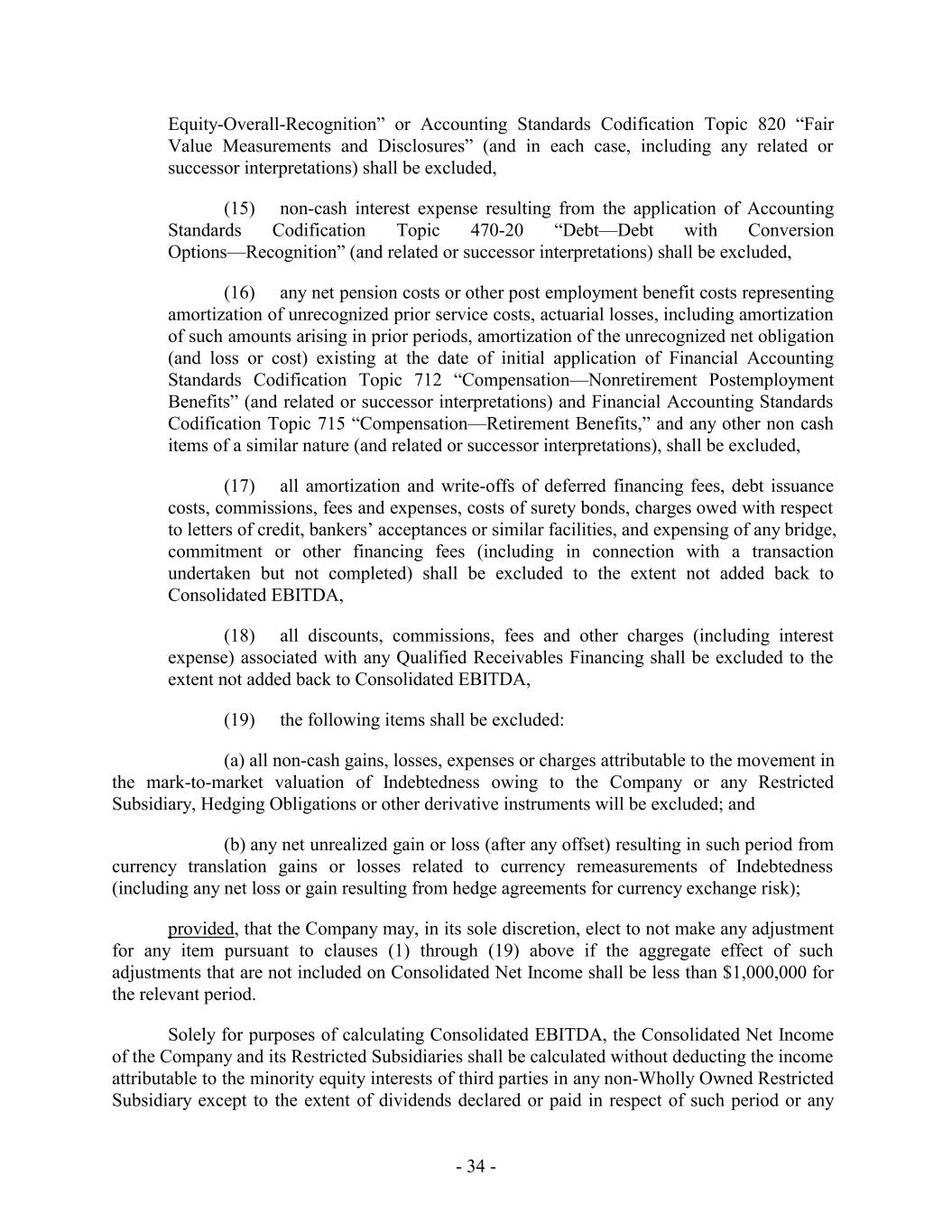 Equity-Overall-Recognition” or Accounting Standards Codification Topic 820 “Fair Value Measurements and Disclosures” (and in each case, including any related or successor interpretations) shall be excluded, (15) non-cash interest expense resulting from the application of Accounting Standards Codification Topic 470-20 “Debt—Debt with Conversion Options—Recognition” (and related or successor interpretations) shall be excluded, (16) any net pension costs or other post employment benefit costs representing amortization of unrecognized prior service costs, actuarial losses, including amortization of such amounts arising in prior periods, amortization of the unrecognized net obligation (and loss or cost) existing at the date of initial application of Financial Accounting Standards Codification Topic 712 “Compensation—Nonretirement Postemployment Benefits” (and related or successor interpretations) and Financial Accounting Standards Codification Topic 715 “Compensation—Retirement Benefits,” and any other non cash items of a similar nature (and related or successor interpretations), shall be excluded, (17) all amortization and write-offs of deferred financing fees, debt issuance costs, commissions, fees and expenses, costs of surety bonds, charges owed with respect to letters of credit, bankers’ acceptances or similar facilities, and expensing of any bridge, commitment or other financing fees (including in connection with a transaction undertaken but not completed) shall be excluded to the extent not added back to Consolidated EBITDA, (18) all discounts, commissions, fees and other charges (including interest expense) associated with any Qualified Receivables Financing shall be excluded to the extent not added back to Consolidated EBITDA, (19) the following items shall be excluded: (a) all non-cash gains, losses, expenses or charges attributable to the movement in the mark-to-market valuation of Indebtedness owing to the Company or any Restricted Subsidiary, Hedging Obligations or other derivative instruments will be excluded; and (b) any net unrealized gain or loss (after any offset) resulting in such period from currency translation gains or losses related to currency remeasurements of Indebtedness (including any net loss or gain resulting from hedge agreements for currency exchange risk); provided, that the Company may, in its sole discretion, elect to not make any adjustment for any item pursuant to clauses (1) through (19) above if the aggregate effect of such adjustments that are not included on Consolidated Net Income shall be less than $1,000,000 for the relevant period. Solely for purposes of calculating Consolidated EBITDA, the Consolidated Net Income of the Company and its Restricted Subsidiaries shall be calculated without deducting the income attributable to the minority equity interests of third parties in any non-Wholly Owned Restricted Subsidiary except to the extent of dividends declared or paid in respect of such period or any - 34 -