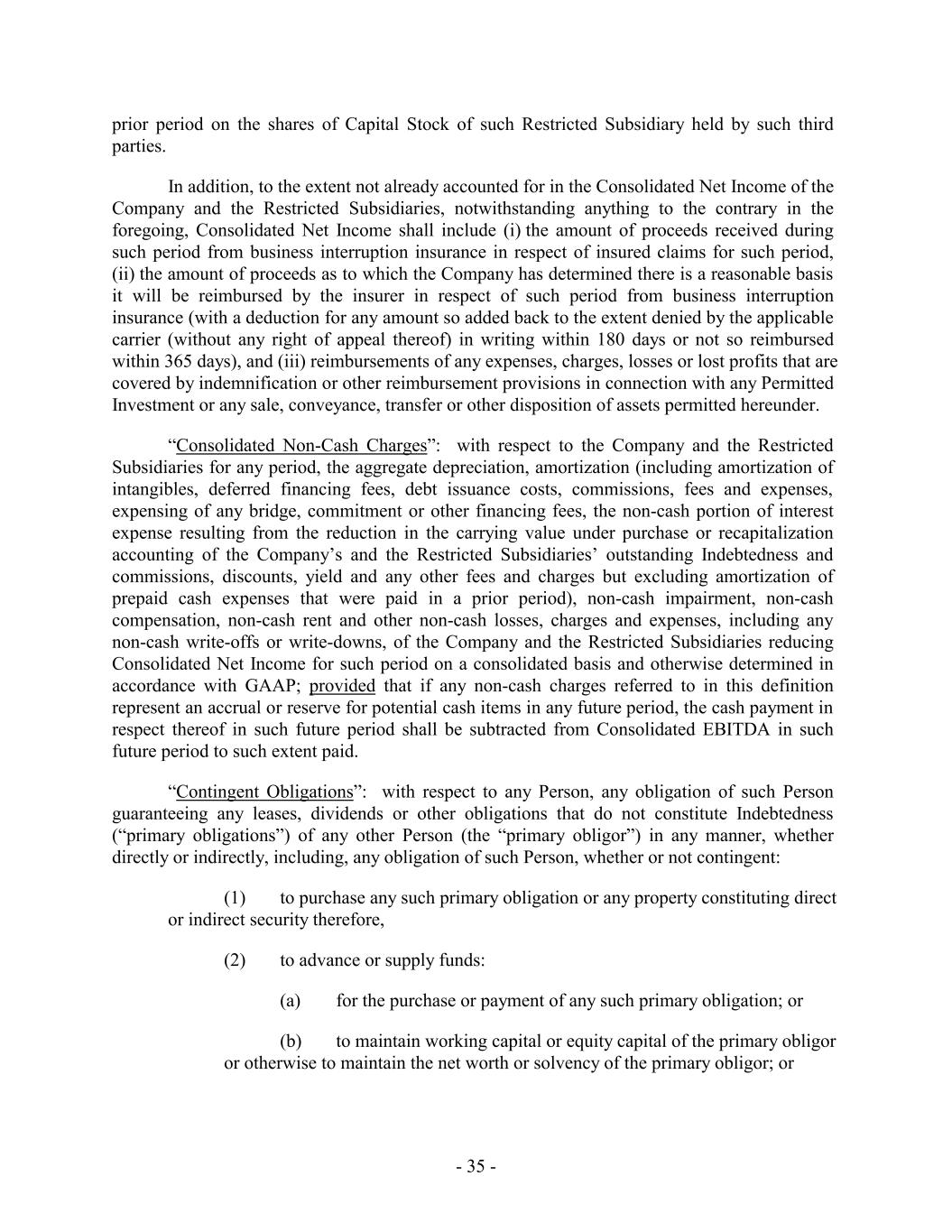 prior period on the shares of Capital Stock of such Restricted Subsidiary held by such third parties. In addition, to the extent not already accounted for in the Consolidated Net Income of the Company and the Restricted Subsidiaries, notwithstanding anything to the contrary in the foregoing, Consolidated Net Income shall include (i) the amount of proceeds received during such period from business interruption insurance in respect of insured claims for such period, (ii) the amount of proceeds as to which the Company has determined there is a reasonable basis it will be reimbursed by the insurer in respect of such period from business interruption insurance (with a deduction for any amount so added back to the extent denied by the applicable carrier (without any right of appeal thereof) in writing within 180 days or not so reimbursed within 365 days), and (iii) reimbursements of any expenses, charges, losses or lost profits that are covered by indemnification or other reimbursement provisions in connection with any Permitted Investment or any sale, conveyance, transfer or other disposition of assets permitted hereunder. “Consolidated Non-Cash Charges”: with respect to the Company and the Restricted Subsidiaries for any period, the aggregate depreciation, amortization (including amortization of intangibles, deferred financing fees, debt issuance costs, commissions, fees and expenses, expensing of any bridge, commitment or other financing fees, the non-cash portion of interest expense resulting from the reduction in the carrying value under purchase or recapitalization accounting of the Company’s and the Restricted Subsidiaries’ outstanding Indebtedness and commissions, discounts, yield and any other fees and charges but excluding amortization of prepaid cash expenses that were paid in a prior period), non-cash impairment, non-cash compensation, non-cash rent and other non-cash losses, charges and expenses, including any non-cash write-offs or write-downs, of the Company and the Restricted Subsidiaries reducing Consolidated Net Income for such period on a consolidated basis and otherwise determined in accordance with GAAP; provided that if any non-cash charges referred to in this definition represent an accrual or reserve for potential cash items in any future period, the cash payment in respect thereof in such future period shall be subtracted from Consolidated EBITDA in such future period to such extent paid. “Contingent Obligations”: with respect to any Person, any obligation of such Person guaranteeing any leases, dividends or other obligations that do not constitute Indebtedness (“primary obligations”) of any other Person (the “primary obligor”) in any manner, whether directly or indirectly, including, any obligation of such Person, whether or not contingent: (1) to purchase any such primary obligation or any property constituting direct or indirect security therefore, (2) to advance or supply funds: (a) for the purchase or payment of any such primary obligation; or (b) to maintain working capital or equity capital of the primary obligor or otherwise to maintain the net worth or solvency of the primary obligor; or - 35 -