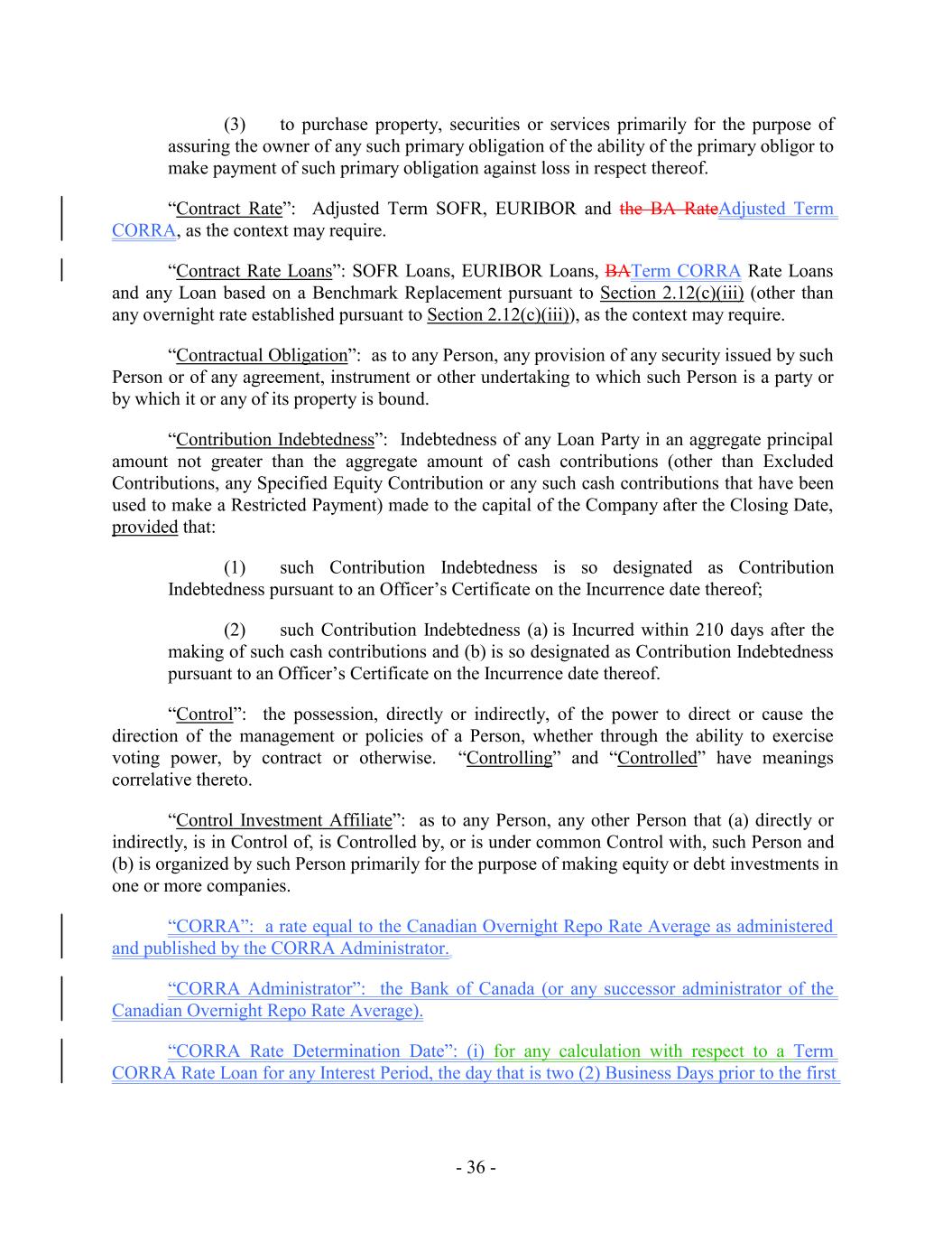 (3) to purchase property, securities or services primarily for the purpose of assuring the owner of any such primary obligation of the ability of the primary obligor to make payment of such primary obligation against loss in respect thereof. “Contract Rate”: Adjusted Term SOFR, EURIBOR and the BA RateAdjusted Term CORRA, as the context may require. “Contract Rate Loans”: SOFR Loans, EURIBOR Loans, BATerm CORRA Rate Loans and any Loan based on a Benchmark Replacement pursuant to Section 2.12(c)(iii) (other than any overnight rate established pursuant to Section 2.12(c)(iii)), as the context may require. “Contractual Obligation”: as to any Person, any provision of any security issued by such Person or of any agreement, instrument or other undertaking to which such Person is a party or by which it or any of its property is bound. “Contribution Indebtedness”: Indebtedness of any Loan Party in an aggregate principal amount not greater than the aggregate amount of cash contributions (other than Excluded Contributions, any Specified Equity Contribution or any such cash contributions that have been used to make a Restricted Payment) made to the capital of the Company after the Closing Date, provided that: (1) such Contribution Indebtedness is so designated as Contribution Indebtedness pursuant to an Officer’s Certificate on the Incurrence date thereof; (2) such Contribution Indebtedness (a) is Incurred within 210 days after the making of such cash contributions and (b) is so designated as Contribution Indebtedness pursuant to an Officer’s Certificate on the Incurrence date thereof. “Control”: the possession, directly or indirectly, of the power to direct or cause the direction of the management or policies of a Person, whether through the ability to exercise voting power, by contract or otherwise. “Controlling” and “Controlled” have meanings correlative thereto. “Control Investment Affiliate”: as to any Person, any other Person that (a) directly or indirectly, is in Control of, is Controlled by, or is under common Control with, such Person and (b) is organized by such Person primarily for the purpose of making equity or debt investments in one or more companies. “CORRA”: a rate equal to the Canadian Overnight Repo Rate Average as administered and published by the CORRA Administrator. “CORRA Administrator”: the Bank of Canada (or any successor administrator of the Canadian Overnight Repo Rate Average). “CORRA Rate Determination Date”: (i) for any calculation with respect to a Term CORRA Rate Loan for any Interest Period, the day that is two (2) Business Days prior to the first - 36 -