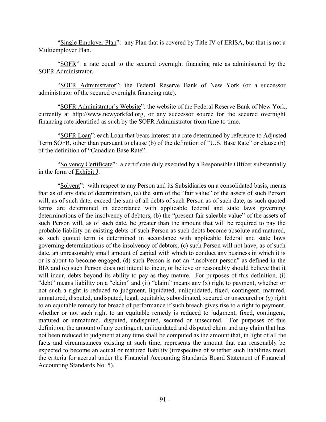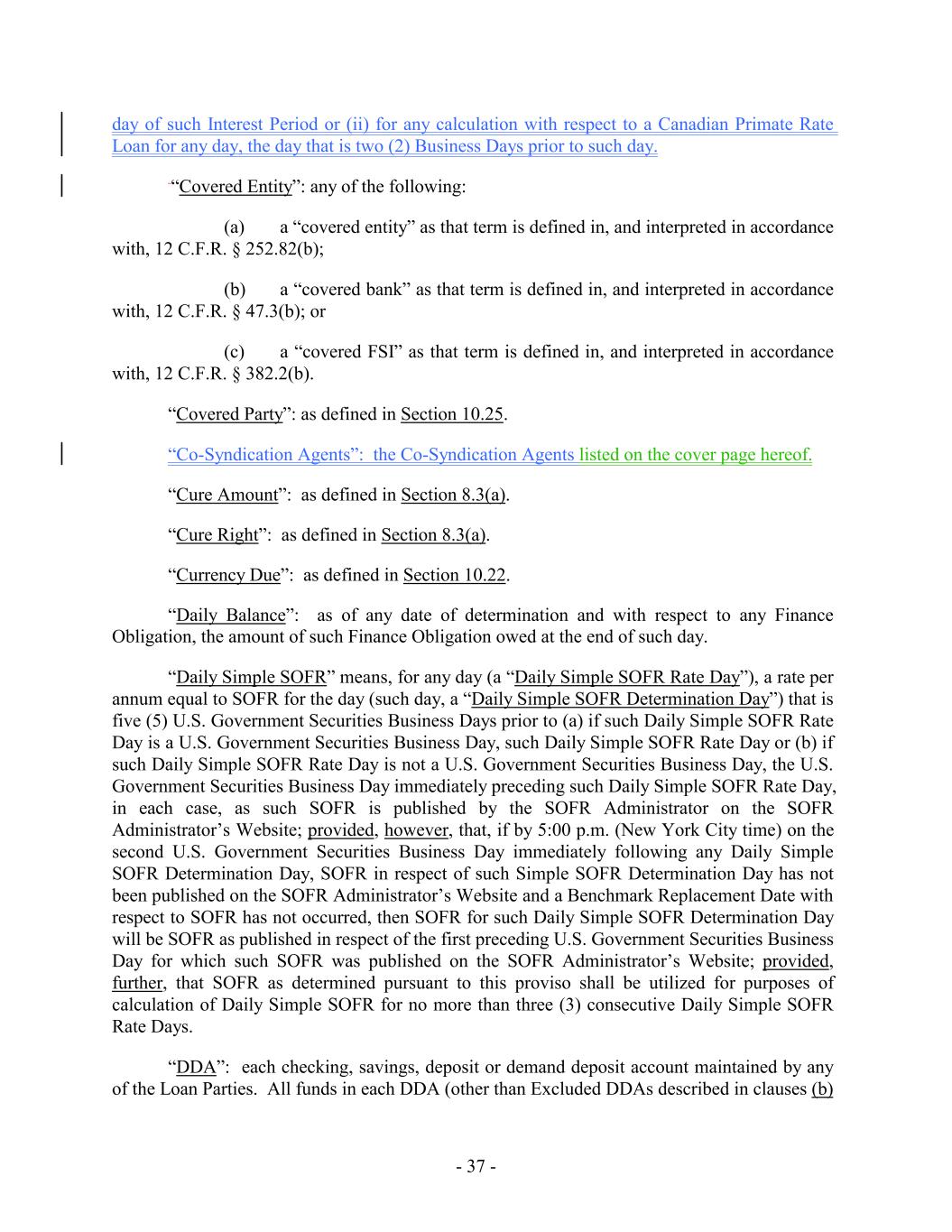 day of such Interest Period or (ii) for any calculation with respect to a Canadian Primate Rate Loan for any day, the day that is two (2) Business Days prior to such day. “Covered Entity”: any of the following: (a) a “covered entity” as that term is defined in, and interpreted in accordance with, 12 C.F.R. § 252.82(b); (b) a “covered bank” as that term is defined in, and interpreted in accordance with, 12 C.F.R. § 47.3(b); or (c) a “covered FSI” as that term is defined in, and interpreted in accordance with, 12 C.F.R. § 382.2(b). “Covered Party”: as defined in Section 10.25. “Co-Syndication Agents”: the Co-Syndication Agents listed on the cover page hereof. “Cure Amount”: as defined in Section 8.3(a). “Cure Right”: as defined in Section 8.3(a). “Currency Due”: as defined in Section 10.22. “Daily Balance”: as of any date of determination and with respect to any Finance Obligation, the amount of such Finance Obligation owed at the end of such day. “Daily Simple SOFR” means, for any day (a “Daily Simple SOFR Rate Day”), a rate per annum equal to SOFR for the day (such day, a “Daily Simple SOFR Determination Day”) that is five (5) U.S. Government Securities Business Days prior to (a) if such Daily Simple SOFR Rate Day is a U.S. Government Securities Business Day, such Daily Simple SOFR Rate Day or (b) if such Daily Simple SOFR Rate Day is not a U.S. Government Securities Business Day, the U.S. Government Securities Business Day immediately preceding such Daily Simple SOFR Rate Day, in each case, as such SOFR is published by the SOFR Administrator on the SOFR Administrator’s Website; provided, however, that, if by 5:00 p.m. (New York City time) on the second U.S. Government Securities Business Day immediately following any Daily Simple SOFR Determination Day, SOFR in respect of such Simple SOFR Determination Day has not been published on the SOFR Administrator’s Website and a Benchmark Replacement Date with respect to SOFR has not occurred, then SOFR for such Daily Simple SOFR Determination Day will be SOFR as published in respect of the first preceding U.S. Government Securities Business Day for which such SOFR was published on the SOFR Administrator’s Website; provided, further, that SOFR as determined pursuant to this proviso shall be utilized for purposes of calculation of Daily Simple SOFR for no more than three (3) consecutive Daily Simple SOFR Rate Days. “DDA”: each checking, savings, deposit or demand deposit account maintained by any of the Loan Parties. All funds in each DDA (other than Excluded DDAs described in clauses (b) - 37 -