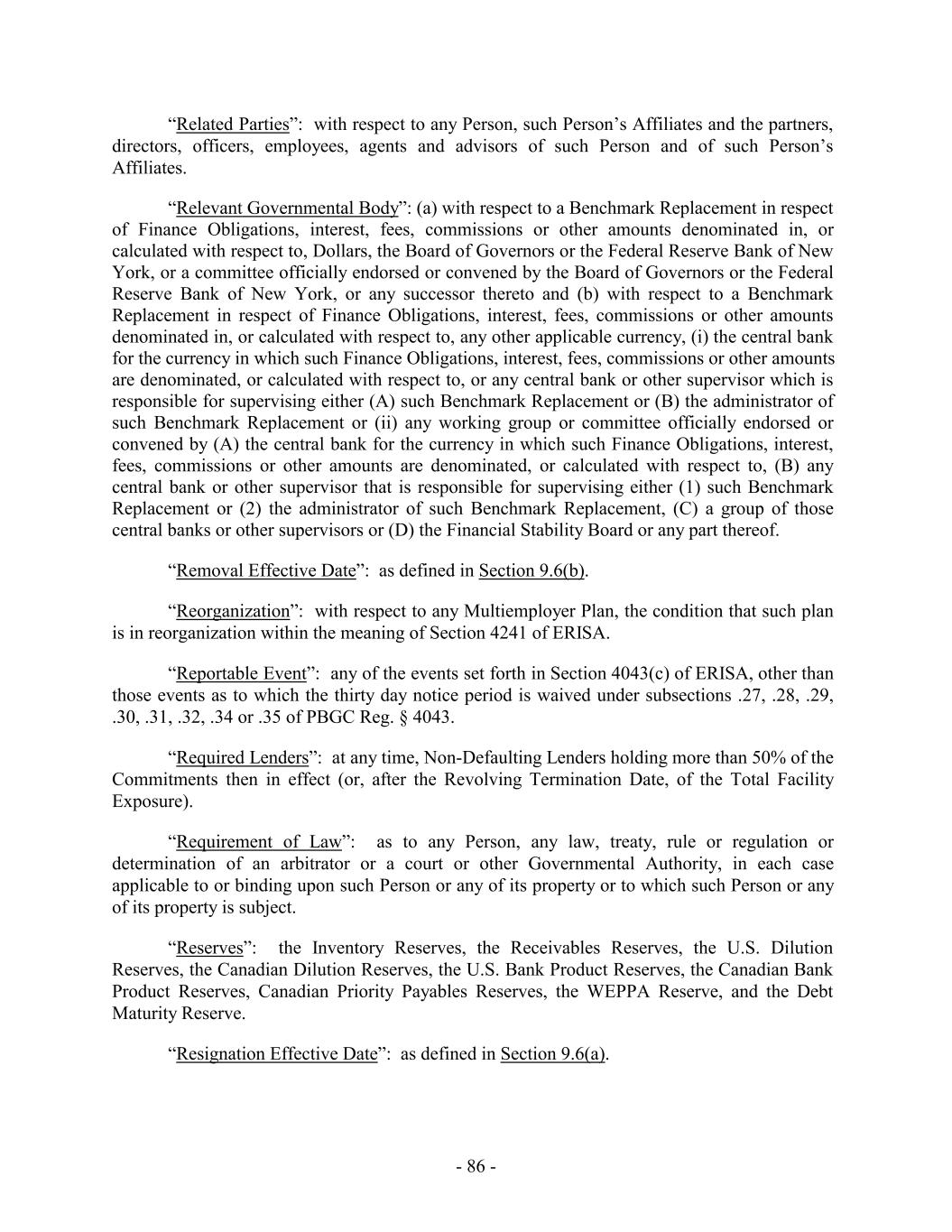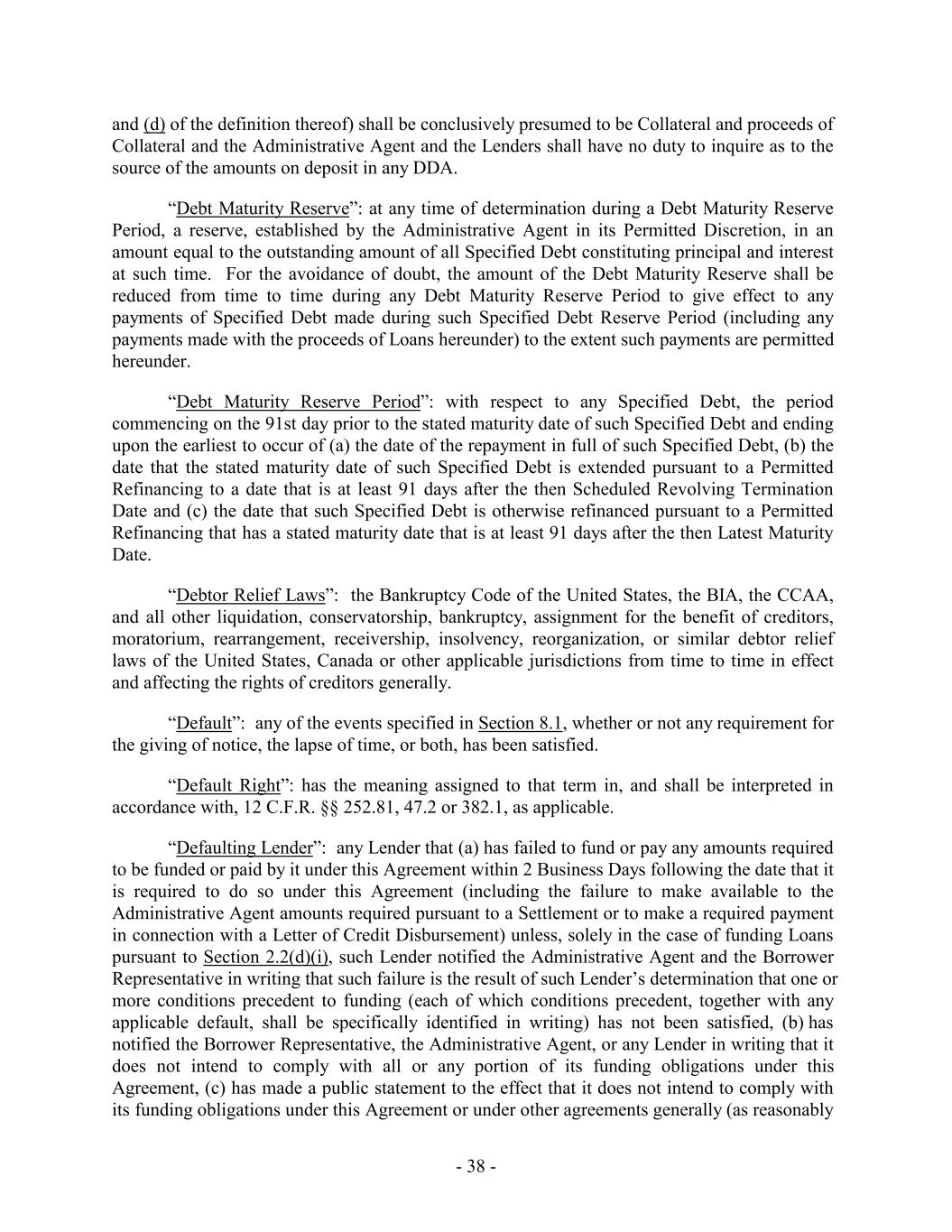 and (d) of the definition thereof) shall be conclusively presumed to be Collateral and proceeds of Collateral and the Administrative Agent and the Lenders shall have no duty to inquire as to the source of the amounts on deposit in any DDA. “Debt Maturity Reserve”: at any time of determination during a Debt Maturity Reserve Period, a reserve, established by the Administrative Agent in its Permitted Discretion, in an amount equal to the outstanding amount of all Specified Debt constituting principal and interest at such time. For the avoidance of doubt, the amount of the Debt Maturity Reserve shall be reduced from time to time during any Debt Maturity Reserve Period to give effect to any payments of Specified Debt made during such Specified Debt Reserve Period (including any payments made with the proceeds of Loans hereunder) to the extent such payments are permitted hereunder. “Debt Maturity Reserve Period”: with respect to any Specified Debt, the period commencing on the 91st day prior to the stated maturity date of such Specified Debt and ending upon the earliest to occur of (a) the date of the repayment in full of such Specified Debt, (b) the date that the stated maturity date of such Specified Debt is extended pursuant to a Permitted Refinancing to a date that is at least 91 days after the then Scheduled Revolving Termination Date and (c) the date that such Specified Debt is otherwise refinanced pursuant to a Permitted Refinancing that has a stated maturity date that is at least 91 days after the then Latest Maturity Date. “Debtor Relief Laws”: the Bankruptcy Code of the United States, the BIA, the CCAA, and all other liquidation, conservatorship, bankruptcy, assignment for the benefit of creditors, moratorium, rearrangement, receivership, insolvency, reorganization, or similar debtor relief laws of the United States, Canada or other applicable jurisdictions from time to time in effect and affecting the rights of creditors generally. “Default”: any of the events specified in Section 8.1, whether or not any requirement for the giving of notice, the lapse of time, or both, has been satisfied. “Default Right”: has the meaning assigned to that term in, and shall be interpreted in accordance with, 12 C.F.R. §§ 252.81, 47.2 or 382.1, as applicable. “Defaulting Lender”: any Lender that (a) has failed to fund or pay any amounts required to be funded or paid by it under this Agreement within 2 Business Days following the date that it is required to do so under this Agreement (including the failure to make available to the Administrative Agent amounts required pursuant to a Settlement or to make a required payment in connection with a Letter of Credit Disbursement) unless, solely in the case of funding Loans pursuant to Section 2.2(d)(i), such Lender notified the Administrative Agent and the Borrower Representative in writing that such failure is the result of such Lender’s determination that one or more conditions precedent to funding (each of which conditions precedent, together with any applicable default, shall be specifically identified in writing) has not been satisfied, (b) has notified the Borrower Representative, the Administrative Agent, or any Lender in writing that it does not intend to comply with all or any portion of its funding obligations under this Agreement, (c) has made a public statement to the effect that it does not intend to comply with its funding obligations under this Agreement or under other agreements generally (as reasonably - 38 -