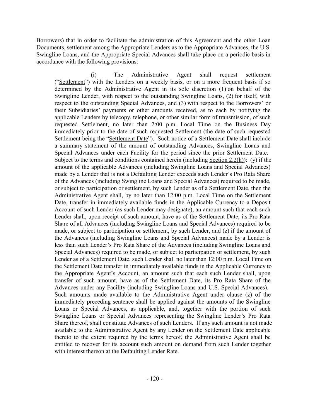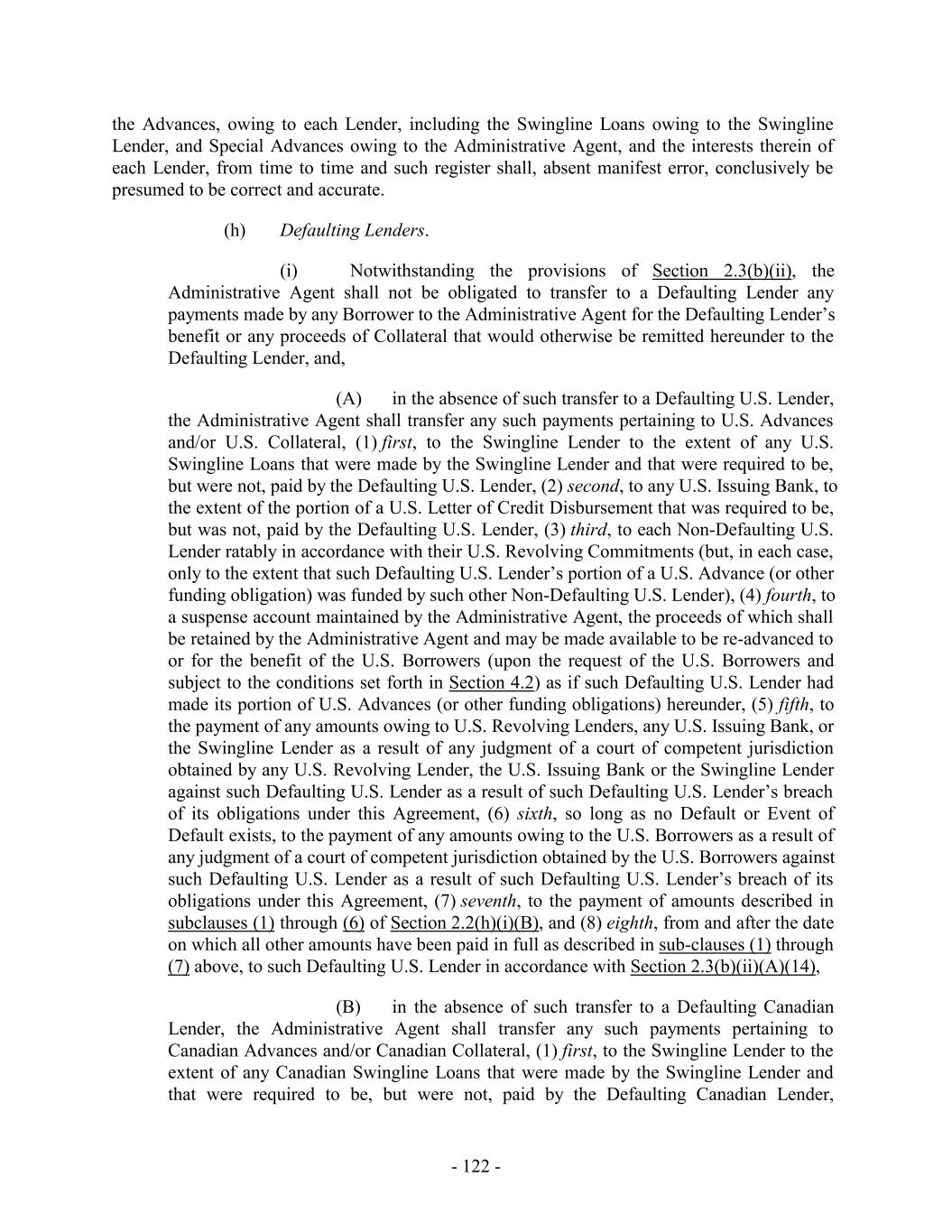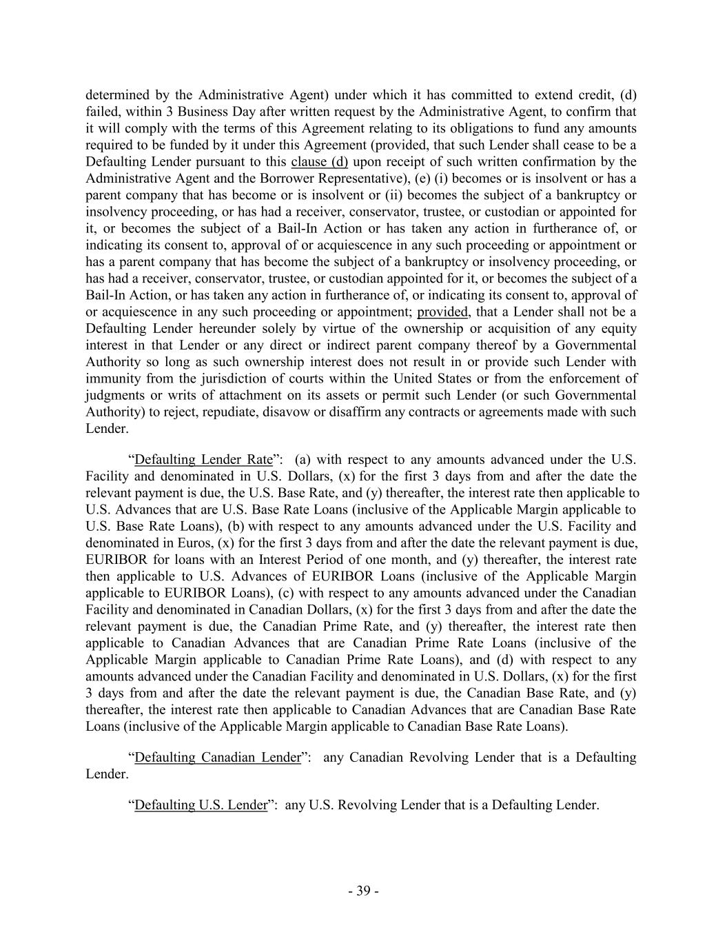 determined by the Administrative Agent) under which it has committed to extend credit, (d) failed, within 3 Business Day after written request by the Administrative Agent, to confirm that it will comply with the terms of this Agreement relating to its obligations to fund any amounts required to be funded by it under this Agreement (provided, that such Lender shall cease to be a Defaulting Lender pursuant to this clause (d) upon receipt of such written confirmation by the Administrative Agent and the Borrower Representative), (e) (i) becomes or is insolvent or has a parent company that has become or is insolvent or (ii) becomes the subject of a bankruptcy or insolvency proceeding, or has had a receiver, conservator, trustee, or custodian or appointed for it, or becomes the subject of a Bail-In Action or has taken any action in furtherance of, or indicating its consent to, approval of or acquiescence in any such proceeding or appointment or has a parent company that has become the subject of a bankruptcy or insolvency proceeding, or has had a receiver, conservator, trustee, or custodian appointed for it, or becomes the subject of a Bail-In Action, or has taken any action in furtherance of, or indicating its consent to, approval of or acquiescence in any such proceeding or appointment; provided, that a Lender shall not be a Defaulting Lender hereunder solely by virtue of the ownership or acquisition of any equity interest in that Lender or any direct or indirect parent company thereof by a Governmental Authority so long as such ownership interest does not result in or provide such Lender with immunity from the jurisdiction of courts within the United States or from the enforcement of judgments or writs of attachment on its assets or permit such Lender (or such Governmental Authority) to reject, repudiate, disavow or disaffirm any contracts or agreements made with such Lender. “Defaulting Lender Rate”: (a) with respect to any amounts advanced under the U.S. Facility and denominated in U.S. Dollars, (x) for the first 3 days from and after the date the relevant payment is due, the U.S. Base Rate, and (y) thereafter, the interest rate then applicable to U.S. Advances that are U.S. Base Rate Loans (inclusive of the Applicable Margin applicable to U.S. Base Rate Loans), (b) with respect to any amounts advanced under the U.S. Facility and denominated in Euros, (x) for the first 3 days from and after the date the relevant payment is due, EURIBOR for loans with an Interest Period of one month, and (y) thereafter, the interest rate then applicable to U.S. Advances of EURIBOR Loans (inclusive of the Applicable Margin applicable to EURIBOR Loans), (c) with respect to any amounts advanced under the Canadian Facility and denominated in Canadian Dollars, (x) for the first 3 days from and after the date the relevant payment is due, the Canadian Prime Rate, and (y) thereafter, the interest rate then applicable to Canadian Advances that are Canadian Prime Rate Loans (inclusive of the Applicable Margin applicable to Canadian Prime Rate Loans), and (d) with respect to any amounts advanced under the Canadian Facility and denominated in U.S. Dollars, (x) for the first 3 days from and after the date the relevant payment is due, the Canadian Base Rate, and (y) thereafter, the interest rate then applicable to Canadian Advances that are Canadian Base Rate Loans (inclusive of the Applicable Margin applicable to Canadian Base Rate Loans). “Defaulting Canadian Lender”: any Canadian Revolving Lender that is a Defaulting Lender. “Defaulting U.S. Lender”: any U.S. Revolving Lender that is a Defaulting Lender. - 39 -