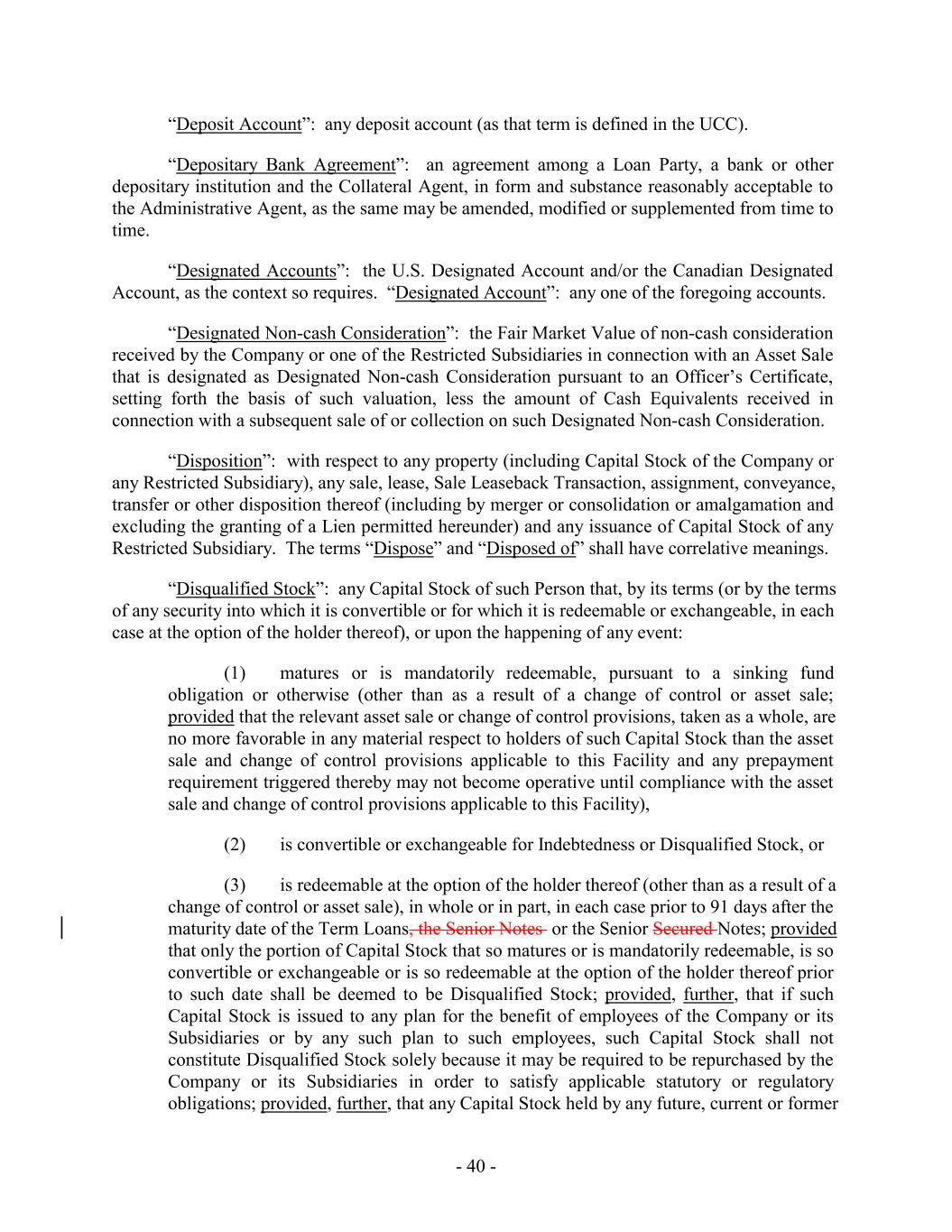 “Deposit Account”: any deposit account (as that term is defined in the UCC). “Depositary Bank Agreement”: an agreement among a Loan Party, a bank or other depositary institution and the Collateral Agent, in form and substance reasonably acceptable to the Administrative Agent, as the same may be amended, modified or supplemented from time to time. “Designated Accounts”: the U.S. Designated Account and/or the Canadian Designated Account, as the context so requires. “Designated Account”: any one of the foregoing accounts. “Designated Non-cash Consideration”: the Fair Market Value of non-cash consideration received by the Company or one of the Restricted Subsidiaries in connection with an Asset Sale that is designated as Designated Non-cash Consideration pursuant to an Officer’s Certificate, setting forth the basis of such valuation, less the amount of Cash Equivalents received in connection with a subsequent sale of or collection on such Designated Non-cash Consideration. “Disposition”: with respect to any property (including Capital Stock of the Company or any Restricted Subsidiary), any sale, lease, Sale Leaseback Transaction, assignment, conveyance, transfer or other disposition thereof (including by merger or consolidation or amalgamation and excluding the granting of a Lien permitted hereunder) and any issuance of Capital Stock of any Restricted Subsidiary. The terms “Dispose” and “Disposed of” shall have correlative meanings. “Disqualified Stock”: any Capital Stock of such Person that, by its terms (or by the terms of any security into which it is convertible or for which it is redeemable or exchangeable, in each case at the option of the holder thereof), or upon the happening of any event: (1) matures or is mandatorily redeemable, pursuant to a sinking fund obligation or otherwise (other than as a result of a change of control or asset sale; provided that the relevant asset sale or change of control provisions, taken as a whole, are no more favorable in any material respect to holders of such Capital Stock than the asset sale and change of control provisions applicable to this Facility and any prepayment requirement triggered thereby may not become operative until compliance with the asset sale and change of control provisions applicable to this Facility), (2) is convertible or exchangeable for Indebtedness or Disqualified Stock, or (3) is redeemable at the option of the holder thereof (other than as a result of a change of control or asset sale), in whole or in part, in each case prior to 91 days after the maturity date of the Term Loans, the Senior Notes or the Senior Secured Notes; provided that only the portion of Capital Stock that so matures or is mandatorily redeemable, is so convertible or exchangeable or is so redeemable at the option of the holder thereof prior to such date shall be deemed to be Disqualified Stock; provided, further, that if such Capital Stock is issued to any plan for the benefit of employees of the Company or its Subsidiaries or by any such plan to such employees, such Capital Stock shall not constitute Disqualified Stock solely because it may be required to be repurchased by the Company or its Subsidiaries in order to satisfy applicable statutory or regulatory obligations; provided, further, that any Capital Stock held by any future, current or former - 40 -