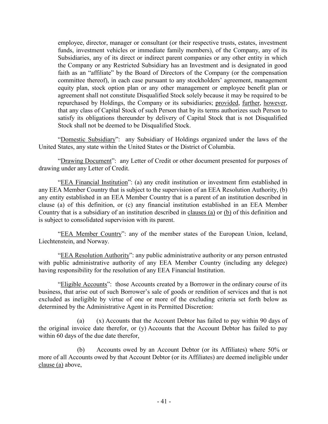 employee, director, manager or consultant (or their respective trusts, estates, investment funds, investment vehicles or immediate family members), of the Company, any of its Subsidiaries, any of its direct or indirect parent companies or any other entity in which the Company or any Restricted Subsidiary has an Investment and is designated in good faith as an “affiliate” by the Board of Directors of the Company (or the compensation committee thereof), in each case pursuant to any stockholders’ agreement, management equity plan, stock option plan or any other management or employee benefit plan or agreement shall not constitute Disqualified Stock solely because it may be required to be repurchased by Holdings, the Company or its subsidiaries; provided, further, however, that any class of Capital Stock of such Person that by its terms authorizes such Person to satisfy its obligations thereunder by delivery of Capital Stock that is not Disqualified Stock shall not be deemed to be Disqualified Stock. “Domestic Subsidiary”: any Subsidiary of Holdings organized under the laws of the United States, any state within the United States or the District of Columbia. “Drawing Document”: any Letter of Credit or other document presented for purposes of drawing under any Letter of Credit. “EEA Financial Institution”: (a) any credit institution or investment firm established in any EEA Member Country that is subject to the supervision of an EEA Resolution Authority, (b) any entity established in an EEA Member Country that is a parent of an institution described in clause (a) of this definition, or (c) any financial institution established in an EEA Member Country that is a subsidiary of an institution described in clauses (a) or (b) of this definition and is subject to consolidated supervision with its parent. “EEA Member Country”: any of the member states of the European Union, Iceland, Liechtenstein, and Norway. “EEA Resolution Authority”: any public administrative authority or any person entrusted with public administrative authority of any EEA Member Country (including any delegee) having responsibility for the resolution of any EEA Financial Institution. “Eligible Accounts”: those Accounts created by a Borrower in the ordinary course of its business, that arise out of such Borrower’s sale of goods or rendition of services and that is not excluded as ineligible by virtue of one or more of the excluding criteria set forth below as determined by the Administrative Agent in its Permitted Discretion: (a) (x) Accounts that the Account Debtor has failed to pay within 90 days of the original invoice date therefor, or (y) Accounts that the Account Debtor has failed to pay within 60 days of the due date therefor, (b) Accounts owed by an Account Debtor (or its Affiliates) where 50% or more of all Accounts owed by that Account Debtor (or its Affiliates) are deemed ineligible under clause (a) above, - 41 -