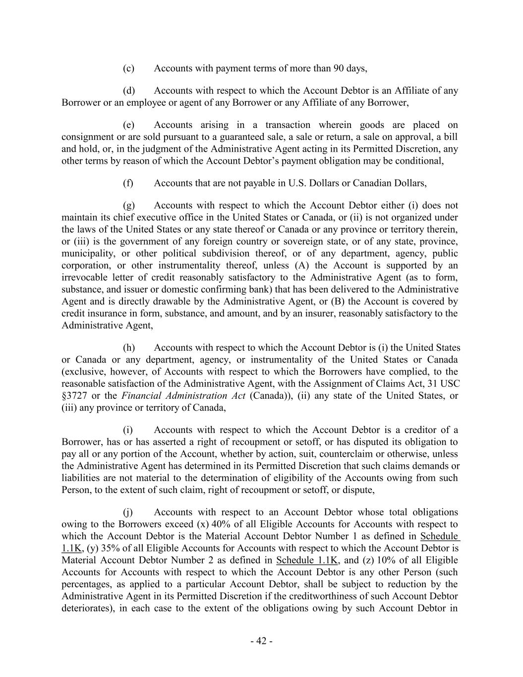 (c) Accounts with payment terms of more than 90 days, (d) Accounts with respect to which the Account Debtor is an Affiliate of any Borrower or an employee or agent of any Borrower or any Affiliate of any Borrower, (e) Accounts arising in a transaction wherein goods are placed on consignment or are sold pursuant to a guaranteed sale, a sale or return, a sale on approval, a bill and hold, or, in the judgment of the Administrative Agent acting in its Permitted Discretion, any other terms by reason of which the Account Debtor’s payment obligation may be conditional, (f) Accounts that are not payable in U.S. Dollars or Canadian Dollars, (g) Accounts with respect to which the Account Debtor either (i) does not maintain its chief executive office in the United States or Canada, or (ii) is not organized under the laws of the United States or any state thereof or Canada or any province or territory therein, or (iii) is the government of any foreign country or sovereign state, or of any state, province, municipality, or other political subdivision thereof, or of any department, agency, public corporation, or other instrumentality thereof, unless (A) the Account is supported by an irrevocable letter of credit reasonably satisfactory to the Administrative Agent (as to form, substance, and issuer or domestic confirming bank) that has been delivered to the Administrative Agent and is directly drawable by the Administrative Agent, or (B) the Account is covered by credit insurance in form, substance, and amount, and by an insurer, reasonably satisfactory to the Administrative Agent, (h) Accounts with respect to which the Account Debtor is (i) the United States or Canada or any department, agency, or instrumentality of the United States or Canada (exclusive, however, of Accounts with respect to which the Borrowers have complied, to the reasonable satisfaction of the Administrative Agent, with the Assignment of Claims Act, 31 USC §3727 or the Financial Administration Act (Canada)), (ii) any state of the United States, or (iii) any province or territory of Canada, (i) Accounts with respect to which the Account Debtor is a creditor of a Borrower, has or has asserted a right of recoupment or setoff, or has disputed its obligation to pay all or any portion of the Account, whether by action, suit, counterclaim or otherwise, unless the Administrative Agent has determined in its Permitted Discretion that such claims demands or liabilities are not material to the determination of eligibility of the Accounts owing from such Person, to the extent of such claim, right of recoupment or setoff, or dispute, (j) Accounts with respect to an Account Debtor whose total obligations owing to the Borrowers exceed (x) 40% of all Eligible Accounts for Accounts with respect to which the Account Debtor is the Material Account Debtor Number 1 as defined in Schedule 1.1K, (y) 35% of all Eligible Accounts for Accounts with respect to which the Account Debtor is Material Account Debtor Number 2 as defined in Schedule 1.1K, and (z) 10% of all Eligible Accounts for Accounts with respect to which the Account Debtor is any other Person (such percentages, as applied to a particular Account Debtor, shall be subject to reduction by the Administrative Agent in its Permitted Discretion if the creditworthiness of such Account Debtor deteriorates), in each case to the extent of the obligations owing by such Account Debtor in - 42 -