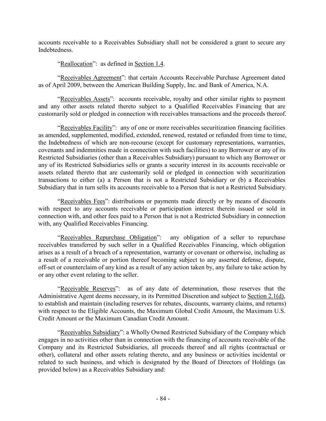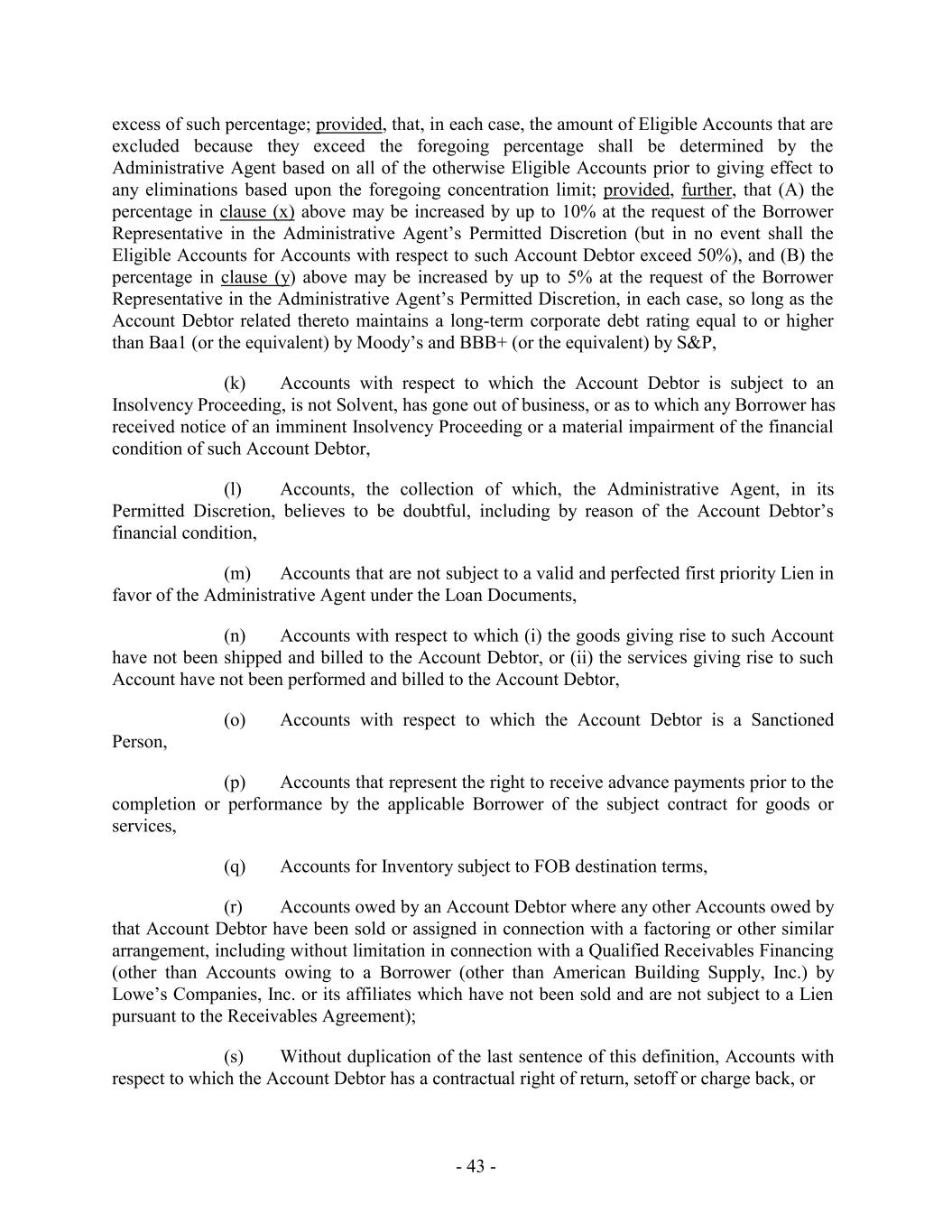 excess of such percentage; provided, that, in each case, the amount of Eligible Accounts that are excluded because they exceed the foregoing percentage shall be determined by the Administrative Agent based on all of the otherwise Eligible Accounts prior to giving effect to any eliminations based upon the foregoing concentration limit; provided, further, that (A) the percentage in clause (x) above may be increased by up to 10% at the request of the Borrower Representative in the Administrative Agent’s Permitted Discretion (but in no event shall the Eligible Accounts for Accounts with respect to such Account Debtor exceed 50%), and (B) the percentage in clause (y) above may be increased by up to 5% at the request of the Borrower Representative in the Administrative Agent’s Permitted Discretion, in each case, so long as the Account Debtor related thereto maintains a long-term corporate debt rating equal to or higher than Baa1 (or the equivalent) by Moody’s and BBB+ (or the equivalent) by S&P, (k) Accounts with respect to which the Account Debtor is subject to an Insolvency Proceeding, is not Solvent, has gone out of business, or as to which any Borrower has received notice of an imminent Insolvency Proceeding or a material impairment of the financial condition of such Account Debtor, (l) Accounts, the collection of which, the Administrative Agent, in its Permitted Discretion, believes to be doubtful, including by reason of the Account Debtor’s financial condition, (m) Accounts that are not subject to a valid and perfected first priority Lien in favor of the Administrative Agent under the Loan Documents, (n) Accounts with respect to which (i) the goods giving rise to such Account have not been shipped and billed to the Account Debtor, or (ii) the services giving rise to such Account have not been performed and billed to the Account Debtor, (o) Accounts with respect to which the Account Debtor is a Sanctioned Person, (p) Accounts that represent the right to receive advance payments prior to the completion or performance by the applicable Borrower of the subject contract for goods or services, (q) Accounts for Inventory subject to FOB destination terms, (r) Accounts owed by an Account Debtor where any other Accounts owed by that Account Debtor have been sold or assigned in connection with a factoring or other similar arrangement, including without limitation in connection with a Qualified Receivables Financing (other than Accounts owing to a Borrower (other than American Building Supply, Inc.) by Lowe’s Companies, Inc. or its affiliates which have not been sold and are not subject to a Lien pursuant to the Receivables Agreement); (s) Without duplication of the last sentence of this definition, Accounts with respect to which the Account Debtor has a contractual right of return, setoff or charge back, or - 43 -