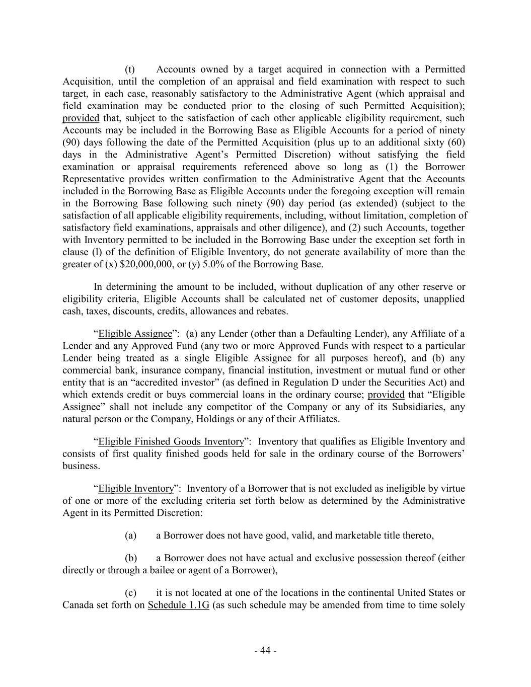 (t) Accounts owned by a target acquired in connection with a Permitted Acquisition, until the completion of an appraisal and field examination with respect to such target, in each case, reasonably satisfactory to the Administrative Agent (which appraisal and field examination may be conducted prior to the closing of such Permitted Acquisition); provided that, subject to the satisfaction of each other applicable eligibility requirement, such Accounts may be included in the Borrowing Base as Eligible Accounts for a period of ninety (90) days following the date of the Permitted Acquisition (plus up to an additional sixty (60) days in the Administrative Agent’s Permitted Discretion) without satisfying the field examination or appraisal requirements referenced above so long as (1) the Borrower Representative provides written confirmation to the Administrative Agent that the Accounts included in the Borrowing Base as Eligible Accounts under the foregoing exception will remain in the Borrowing Base following such ninety (90) day period (as extended) (subject to the satisfaction of all applicable eligibility requirements, including, without limitation, completion of satisfactory field examinations, appraisals and other diligence), and (2) such Accounts, together with Inventory permitted to be included in the Borrowing Base under the exception set forth in clause (l) of the definition of Eligible Inventory, do not generate availability of more than the greater of (x) $20,000,000, or (y) 5.0% of the Borrowing Base. In determining the amount to be included, without duplication of any other reserve or eligibility criteria, Eligible Accounts shall be calculated net of customer deposits, unapplied cash, taxes, discounts, credits, allowances and rebates. “Eligible Assignee”: (a) any Lender (other than a Defaulting Lender), any Affiliate of a Lender and any Approved Fund (any two or more Approved Funds with respect to a particular Lender being treated as a single Eligible Assignee for all purposes hereof), and (b) any commercial bank, insurance company, financial institution, investment or mutual fund or other entity that is an “accredited investor” (as defined in Regulation D under the Securities Act) and which extends credit or buys commercial loans in the ordinary course; provided that “Eligible Assignee” shall not include any competitor of the Company or any of its Subsidiaries, any natural person or the Company, Holdings or any of their Affiliates. “Eligible Finished Goods Inventory”: Inventory that qualifies as Eligible Inventory and consists of first quality finished goods held for sale in the ordinary course of the Borrowers’ business. “Eligible Inventory”: Inventory of a Borrower that is not excluded as ineligible by virtue of one or more of the excluding criteria set forth below as determined by the Administrative Agent in its Permitted Discretion: (a) a Borrower does not have good, valid, and marketable title thereto, (b) a Borrower does not have actual and exclusive possession thereof (either directly or through a bailee or agent of a Borrower), (c) it is not located at one of the locations in the continental United States or Canada set forth on Schedule 1.1G (as such schedule may be amended from time to time solely - 44 -