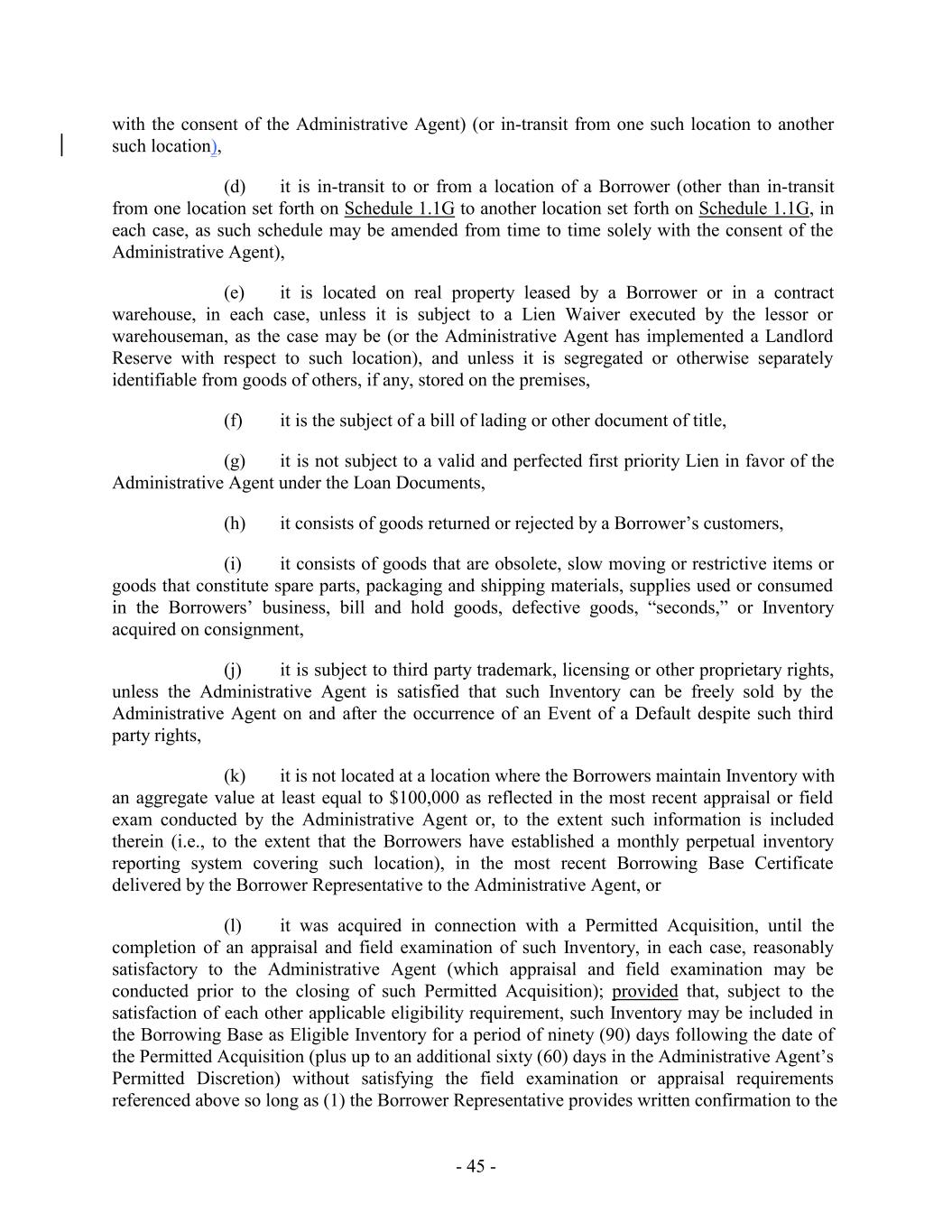 with the consent of the Administrative Agent) (or in-transit from one such location to another such location), (d) it is in-transit to or from a location of a Borrower (other than in-transit from one location set forth on Schedule 1.1G to another location set forth on Schedule 1.1G, in each case, as such schedule may be amended from time to time solely with the consent of the Administrative Agent), (e) it is located on real property leased by a Borrower or in a contract warehouse, in each case, unless it is subject to a Lien Waiver executed by the lessor or warehouseman, as the case may be (or the Administrative Agent has implemented a Landlord Reserve with respect to such location), and unless it is segregated or otherwise separately identifiable from goods of others, if any, stored on the premises, (f) it is the subject of a bill of lading or other document of title, (g) it is not subject to a valid and perfected first priority Lien in favor of the Administrative Agent under the Loan Documents, (h) it consists of goods returned or rejected by a Borrower’s customers, (i) it consists of goods that are obsolete, slow moving or restrictive items or goods that constitute spare parts, packaging and shipping materials, supplies used or consumed in the Borrowers’ business, bill and hold goods, defective goods, “seconds,” or Inventory acquired on consignment, (j) it is subject to third party trademark, licensing or other proprietary rights, unless the Administrative Agent is satisfied that such Inventory can be freely sold by the Administrative Agent on and after the occurrence of an Event of a Default despite such third party rights, (k) it is not located at a location where the Borrowers maintain Inventory with an aggregate value at least equal to $100,000 as reflected in the most recent appraisal or field exam conducted by the Administrative Agent or, to the extent such information is included therein (i.e., to the extent that the Borrowers have established a monthly perpetual inventory reporting system covering such location), in the most recent Borrowing Base Certificate delivered by the Borrower Representative to the Administrative Agent, or (l) it was acquired in connection with a Permitted Acquisition, until the completion of an appraisal and field examination of such Inventory, in each case, reasonably satisfactory to the Administrative Agent (which appraisal and field examination may be conducted prior to the closing of such Permitted Acquisition); provided that, subject to the satisfaction of each other applicable eligibility requirement, such Inventory may be included in the Borrowing Base as Eligible Inventory for a period of ninety (90) days following the date of the Permitted Acquisition (plus up to an additional sixty (60) days in the Administrative Agent’s Permitted Discretion) without satisfying the field examination or appraisal requirements referenced above so long as (1) the Borrower Representative provides written confirmation to the - 45 -