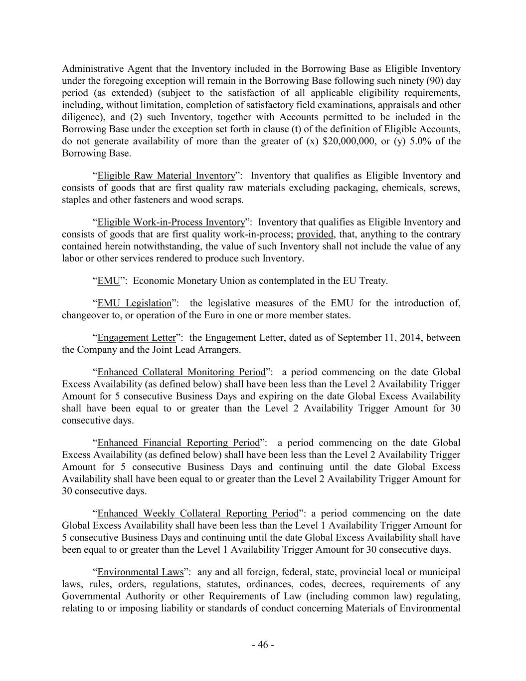 Administrative Agent that the Inventory included in the Borrowing Base as Eligible Inventory under the foregoing exception will remain in the Borrowing Base following such ninety (90) day period (as extended) (subject to the satisfaction of all applicable eligibility requirements, including, without limitation, completion of satisfactory field examinations, appraisals and other diligence), and (2) such Inventory, together with Accounts permitted to be included in the Borrowing Base under the exception set forth in clause (t) of the definition of Eligible Accounts, do not generate availability of more than the greater of (x) $20,000,000, or (y) 5.0% of the Borrowing Base. “Eligible Raw Material Inventory”: Inventory that qualifies as Eligible Inventory and consists of goods that are first quality raw materials excluding packaging, chemicals, screws, staples and other fasteners and wood scraps. “Eligible Work-in-Process Inventory”: Inventory that qualifies as Eligible Inventory and consists of goods that are first quality work-in-process; provided, that, anything to the contrary contained herein notwithstanding, the value of such Inventory shall not include the value of any labor or other services rendered to produce such Inventory. “EMU”: Economic Monetary Union as contemplated in the EU Treaty. “EMU Legislation”: the legislative measures of the EMU for the introduction of, changeover to, or operation of the Euro in one or more member states. “Engagement Letter”: the Engagement Letter, dated as of September 11, 2014, between the Company and the Joint Lead Arrangers. “Enhanced Collateral Monitoring Period”: a period commencing on the date Global Excess Availability (as defined below) shall have been less than the Level 2 Availability Trigger Amount for 5 consecutive Business Days and expiring on the date Global Excess Availability shall have been equal to or greater than the Level 2 Availability Trigger Amount for 30 consecutive days. “Enhanced Financial Reporting Period”: a period commencing on the date Global Excess Availability (as defined below) shall have been less than the Level 2 Availability Trigger Amount for 5 consecutive Business Days and continuing until the date Global Excess Availability shall have been equal to or greater than the Level 2 Availability Trigger Amount for 30 consecutive days. “Enhanced Weekly Collateral Reporting Period”: a period commencing on the date Global Excess Availability shall have been less than the Level 1 Availability Trigger Amount for 5 consecutive Business Days and continuing until the date Global Excess Availability shall have been equal to or greater than the Level 1 Availability Trigger Amount for 30 consecutive days. “Environmental Laws”: any and all foreign, federal, state, provincial local or municipal laws, rules, orders, regulations, statutes, ordinances, codes, decrees, requirements of any Governmental Authority or other Requirements of Law (including common law) regulating, relating to or imposing liability or standards of conduct concerning Materials of Environmental - 46 -