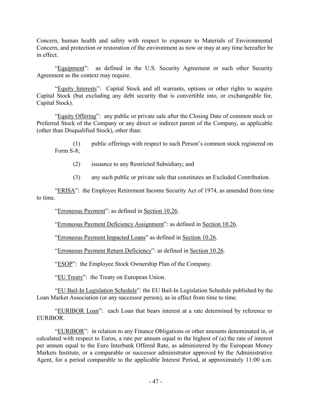 Concern, human health and safety with respect to exposure to Materials of Environmental Concern, and protection or restoration of the environment as now or may at any time hereafter be in effect. “Equipment”: as defined in the U.S. Security Agreement or such other Security Agreement as the context may require. “Equity Interests”: Capital Stock and all warrants, options or other rights to acquire Capital Stock (but excluding any debt security that is convertible into, or exchangeable for, Capital Stock). “Equity Offering”: any public or private sale after the Closing Date of common stock or Preferred Stock of the Company or any direct or indirect parent of the Company, as applicable (other than Disqualified Stock), other than: (1) public offerings with respect to such Person’s common stock registered on Form S-8; (2) issuance to any Restricted Subsidiary; and (3) any such public or private sale that constitutes an Excluded Contribution. “ERISA”: the Employee Retirement Income Security Act of 1974, as amended from time to time. “Erroneous Payment”: as defined in Section 10.26. “Erroneous Payment Deficiency Assignment”: as defined in Section 10.26. “Erroneous Payment Impacted Loans” as defined in Section 10.26. “Erroneous Payment Return Deficiency”: as defined in Section 10.26. “ESOP”: the Employee Stock Ownership Plan of the Company. “EU Treaty”: the Treaty on European Union. “EU Bail-In Legislation Schedule”: the EU Bail-In Legislation Schedule published by the Loan Market Association (or any successor person), as in effect from time to time. “EURIBOR Loan”: each Loan that bears interest at a rate determined by reference to EURIBOR. “EURIBOR”: in relation to any Finance Obligations or other amounts denominated in, or calculated with respect to Euros, a rate per annum equal to the highest of (a) the rate of interest per annum equal to the Euro Interbank Offered Rate, as administered by the European Money Markets Institute, or a comparable or successor administrator approved by the Administrative Agent, for a period comparable to the applicable Interest Period, at approximately 11:00 a.m. - 47 -