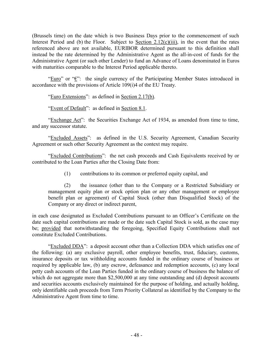 (Brussels time) on the date which is two Business Days prior to the commencement of such Interest Period and (b) the Floor. Subject to Section 2.12(c)(iii), in the event that the rates referenced above are not available, EURIBOR determined pursuant to this definition shall instead be the rate determined by the Administrative Agent as the all-in-cost of funds for the Administrative Agent (or such other Lender) to fund an Advance of Loans denominated in Euros with maturities comparable to the Interest Period applicable thereto. “Euro” or “€”: the single currency of the Participating Member States introduced in accordance with the provisions of Article 109(i)4 of the EU Treaty. “Euro Extensions”: as defined in Section 2.17(b). “Event of Default”: as defined in Section 8.1. “Exchange Act”: the Securities Exchange Act of 1934, as amended from time to time, and any successor statute. “Excluded Assets”: as defined in the U.S. Security Agreement, Canadian Security Agreement or such other Security Agreement as the context may require. “Excluded Contributions”: the net cash proceeds and Cash Equivalents received by or contributed to the Loan Parties after the Closing Date from: (1) contributions to its common or preferred equity capital, and (2) the issuance (other than to the Company or a Restricted Subsidiary or management equity plan or stock option plan or any other management or employee benefit plan or agreement) of Capital Stock (other than Disqualified Stock) of the Company or any direct or indirect parent, in each case designated as Excluded Contributions pursuant to an Officer’s Certificate on the date such capital contributions are made or the date such Capital Stock is sold, as the case may be; provided that notwithstanding the foregoing, Specified Equity Contributions shall not constitute Excluded Contributions. “Excluded DDA”: a deposit account other than a Collection DDA which satisfies one of the following: (a) any exclusive payroll, other employee benefits, trust, fiduciary, customs, insurance deposits or tax withholding accounts funded in the ordinary course of business or required by applicable law, (b) any escrow, defeasance and redemption accounts, (c) any local petty cash accounts of the Loan Parties funded in the ordinary course of business the balance of which do not aggregate more than $2,500,000 at any time outstanding and (d) deposit accounts and securities accounts exclusively maintained for the purpose of holding, and actually holding, only identifiable cash proceeds from Term Priority Collateral as identified by the Company to the Administrative Agent from time to time. - 48 -