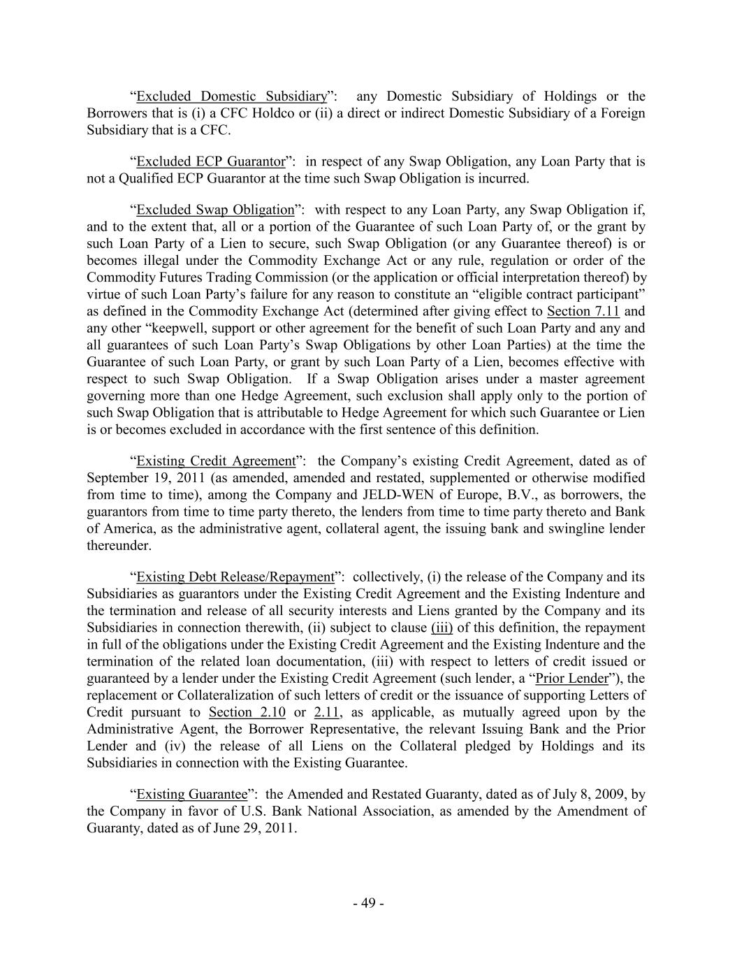 “Excluded Domestic Subsidiary”: any Domestic Subsidiary of Holdings or the Borrowers that is (i) a CFC Holdco or (ii) a direct or indirect Domestic Subsidiary of a Foreign Subsidiary that is a CFC. “Excluded ECP Guarantor”: in respect of any Swap Obligation, any Loan Party that is not a Qualified ECP Guarantor at the time such Swap Obligation is incurred. “Excluded Swap Obligation”: with respect to any Loan Party, any Swap Obligation if, and to the extent that, all or a portion of the Guarantee of such Loan Party of, or the grant by such Loan Party of a Lien to secure, such Swap Obligation (or any Guarantee thereof) is or becomes illegal under the Commodity Exchange Act or any rule, regulation or order of the Commodity Futures Trading Commission (or the application or official interpretation thereof) by virtue of such Loan Party’s failure for any reason to constitute an “eligible contract participant” as defined in the Commodity Exchange Act (determined after giving effect to Section 7.11 and any other “keepwell, support or other agreement for the benefit of such Loan Party and any and all guarantees of such Loan Party’s Swap Obligations by other Loan Parties) at the time the Guarantee of such Loan Party, or grant by such Loan Party of a Lien, becomes effective with respect to such Swap Obligation. If a Swap Obligation arises under a master agreement governing more than one Hedge Agreement, such exclusion shall apply only to the portion of such Swap Obligation that is attributable to Hedge Agreement for which such Guarantee or Lien is or becomes excluded in accordance with the first sentence of this definition. “Existing Credit Agreement”: the Company’s existing Credit Agreement, dated as of September 19, 2011 (as amended, amended and restated, supplemented or otherwise modified from time to time), among the Company and JELD-WEN of Europe, B.V., as borrowers, the guarantors from time to time party thereto, the lenders from time to time party thereto and Bank of America, as the administrative agent, collateral agent, the issuing bank and swingline lender thereunder. “Existing Debt Release/Repayment”: collectively, (i) the release of the Company and its Subsidiaries as guarantors under the Existing Credit Agreement and the Existing Indenture and the termination and release of all security interests and Liens granted by the Company and its Subsidiaries in connection therewith, (ii) subject to clause (iii) of this definition, the repayment in full of the obligations under the Existing Credit Agreement and the Existing Indenture and the termination of the related loan documentation, (iii) with respect to letters of credit issued or guaranteed by a lender under the Existing Credit Agreement (such lender, a “Prior Lender”), the replacement or Collateralization of such letters of credit or the issuance of supporting Letters of Credit pursuant to Section 2.10 or 2.11, as applicable, as mutually agreed upon by the Administrative Agent, the Borrower Representative, the relevant Issuing Bank and the Prior Lender and (iv) the release of all Liens on the Collateral pledged by Holdings and its Subsidiaries in connection with the Existing Guarantee. “Existing Guarantee”: the Amended and Restated Guaranty, dated as of July 8, 2009, by the Company in favor of U.S. Bank National Association, as amended by the Amendment of Guaranty, dated as of June 29, 2011. - 49 -