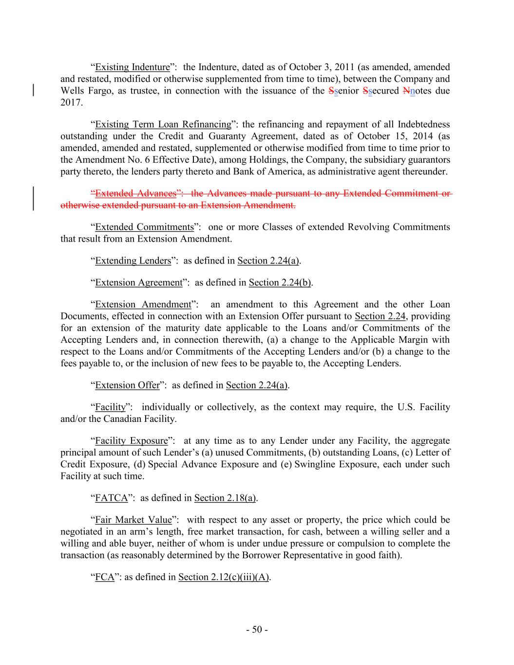 “Existing Indenture”: the Indenture, dated as of October 3, 2011 (as amended, amended and restated, modified or otherwise supplemented from time to time), between the Company and Wells Fargo, as trustee, in connection with the issuance of the Ssenior Ssecured Nnotes due 2017. “Existing Term Loan Refinancing”: the refinancing and repayment of all Indebtedness outstanding under the Credit and Guaranty Agreement, dated as of October 15, 2014 (as amended, amended and restated, supplemented or otherwise modified from time to time prior to the Amendment No. 6 Effective Date), among Holdings, the Company, the subsidiary guarantors party thereto, the lenders party thereto and Bank of America, as administrative agent thereunder. “Extended Advances”: the Advances made pursuant to any Extended Commitment or otherwise extended pursuant to an Extension Amendment. “Extended Commitments”: one or more Classes of extended Revolving Commitments that result from an Extension Amendment. “Extending Lenders”: as defined in Section 2.24(a). “Extension Agreement”: as defined in Section 2.24(b). “Extension Amendment”: an amendment to this Agreement and the other Loan Documents, effected in connection with an Extension Offer pursuant to Section 2.24, providing for an extension of the maturity date applicable to the Loans and/or Commitments of the Accepting Lenders and, in connection therewith, (a) a change to the Applicable Margin with respect to the Loans and/or Commitments of the Accepting Lenders and/or (b) a change to the fees payable to, or the inclusion of new fees to be payable to, the Accepting Lenders. “Extension Offer”: as defined in Section 2.24(a). “Facility”: individually or collectively, as the context may require, the U.S. Facility and/or the Canadian Facility. “Facility Exposure”: at any time as to any Lender under any Facility, the aggregate principal amount of such Lender’s (a) unused Commitments, (b) outstanding Loans, (c) Letter of Credit Exposure, (d) Special Advance Exposure and (e) Swingline Exposure, each under such Facility at such time. “FATCA”: as defined in Section 2.18(a). “Fair Market Value”: with respect to any asset or property, the price which could be negotiated in an arm’s length, free market transaction, for cash, between a willing seller and a willing and able buyer, neither of whom is under undue pressure or compulsion to complete the transaction (as reasonably determined by the Borrower Representative in good faith). “FCA”: as defined in Section 2.12(c)(iii)(A). - 50 -