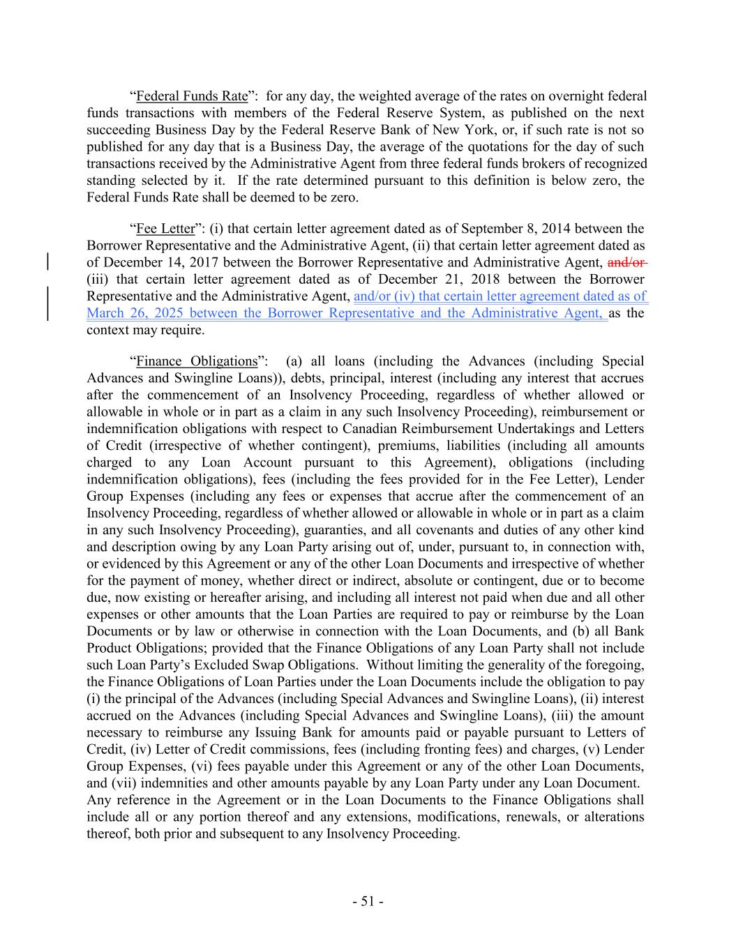 “Federal Funds Rate”: for any day, the weighted average of the rates on overnight federal funds transactions with members of the Federal Reserve System, as published on the next succeeding Business Day by the Federal Reserve Bank of New York, or, if such rate is not so published for any day that is a Business Day, the average of the quotations for the day of such transactions received by the Administrative Agent from three federal funds brokers of recognized standing selected by it. If the rate determined pursuant to this definition is below zero, the Federal Funds Rate shall be deemed to be zero. “Fee Letter”: (i) that certain letter agreement dated as of September 8, 2014 between the Borrower Representative and the Administrative Agent, (ii) that certain letter agreement dated as of December 14, 2017 between the Borrower Representative and Administrative Agent, and/or (iii) that certain letter agreement dated as of December 21, 2018 between the Borrower Representative and the Administrative Agent, and/or (iv) that certain letter agreement dated as of March 26, 2025 between the Borrower Representative and the Administrative Agent, as the context may require. “Finance Obligations”: (a) all loans (including the Advances (including Special Advances and Swingline Loans)), debts, principal, interest (including any interest that accrues after the commencement of an Insolvency Proceeding, regardless of whether allowed or allowable in whole or in part as a claim in any such Insolvency Proceeding), reimbursement or indemnification obligations with respect to Canadian Reimbursement Undertakings and Letters of Credit (irrespective of whether contingent), premiums, liabilities (including all amounts charged to any Loan Account pursuant to this Agreement), obligations (including indemnification obligations), fees (including the fees provided for in the Fee Letter), Lender Group Expenses (including any fees or expenses that accrue after the commencement of an Insolvency Proceeding, regardless of whether allowed or allowable in whole or in part as a claim in any such Insolvency Proceeding), guaranties, and all covenants and duties of any other kind and description owing by any Loan Party arising out of, under, pursuant to, in connection with, or evidenced by this Agreement or any of the other Loan Documents and irrespective of whether for the payment of money, whether direct or indirect, absolute or contingent, due or to become due, now existing or hereafter arising, and including all interest not paid when due and all other expenses or other amounts that the Loan Parties are required to pay or reimburse by the Loan Documents or by law or otherwise in connection with the Loan Documents, and (b) all Bank Product Obligations; provided that the Finance Obligations of any Loan Party shall not include such Loan Party’s Excluded Swap Obligations. Without limiting the generality of the foregoing, the Finance Obligations of Loan Parties under the Loan Documents include the obligation to pay (i) the principal of the Advances (including Special Advances and Swingline Loans), (ii) interest accrued on the Advances (including Special Advances and Swingline Loans), (iii) the amount necessary to reimburse any Issuing Bank for amounts paid or payable pursuant to Letters of Credit, (iv) Letter of Credit commissions, fees (including fronting fees) and charges, (v) Lender Group Expenses, (vi) fees payable under this Agreement or any of the other Loan Documents, and (vii) indemnities and other amounts payable by any Loan Party under any Loan Document. Any reference in the Agreement or in the Loan Documents to the Finance Obligations shall include all or any portion thereof and any extensions, modifications, renewals, or alterations thereof, both prior and subsequent to any Insolvency Proceeding. - 51 -