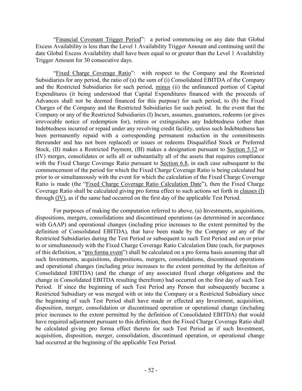 “Financial Covenant Trigger Period”: a period commencing on any date that Global Excess Availability is less than the Level 1 Availability Trigger Amount and continuing until the date Global Excess Availability shall have been equal to or greater than the Level 1 Availability Trigger Amount for 30 consecutive days. “Fixed Charge Coverage Ratio”: with respect to the Company and the Restricted Subsidiaries for any period, the ratio of (a) the sum of (i) Consolidated EBITDA of the Company and the Restricted Subsidiaries for such period, minus (ii) the unfinanced portion of Capital Expenditures (it being understood that Capital Expenditures financed with the proceeds of Advances shall not be deemed financed for this purpose) for such period, to (b) the Fixed Charges of the Company and the Restricted Subsidiaries for such period. In the event that the Company or any of the Restricted Subsidiaries (I) Incurs, assumes, guarantees, redeems (or gives irrevocable notice of redemption for), retires or extinguishes any Indebtedness (other than Indebtedness incurred or repaid under any revolving credit facility, unless such Indebtedness has been permanently repaid with a corresponding permanent reduction in the commitments thereunder and has not been replaced) or issues or redeems Disqualified Stock or Preferred Stock, (II) makes a Restricted Payment, (III) makes a designation pursuant to Section 5.12 or (IV) merges, consolidates or sells all or substantially all of the assets that requires compliance with the Fixed Charge Coverage Ratio pursuant to Section 6.8, in each case subsequent to the commencement of the period for which the Fixed Charge Coverage Ratio is being calculated but prior to or simultaneously with the event for which the calculation of the Fixed Charge Coverage Ratio is made (the “Fixed Charge Coverage Ratio Calculation Date”), then the Fixed Charge Coverage Ratio shall be calculated giving pro forma effect to such actions set forth in clauses (I) through (IV), as if the same had occurred on the first day of the applicable Test Period. For purposes of making the computation referred to above, (a) Investments, acquisitions, dispositions, mergers, consolidations and discontinued operations (as determined in accordance with GAAP) and operational changes (including price increases to the extent permitted by the definition of Consolidated EBITDA), that have been made by the Company or any of the Restricted Subsidiaries during the Test Period or subsequent to such Test Period and on or prior to or simultaneously with the Fixed Charge Coverage Ratio Calculation Date (each, for purposes of this definition, a “pro forma event”) shall be calculated on a pro forma basis assuming that all such Investments, acquisitions, dispositions, mergers, consolidations, discontinued operations and operational changes (including price increases to the extent permitted by the definition of Consolidated EBITDA) (and the change of any associated fixed charge obligations and the change in Consolidated EBITDA resulting therefrom) had occurred on the first day of such Test Period. If since the beginning of such Test Period any Person that subsequently became a Restricted Subsidiary or was merged with or into the Company or a Restricted Subsidiary since the beginning of such Test Period shall have made or effected any Investment, acquisition, disposition, merger, consolidation or discontinued operation or operational change (including price increases to the extent permitted by the definition of Consolidated EBITDA) that would have required adjustment pursuant to this definition, then the Fixed Charge Coverage Ratio shall be calculated giving pro forma effect thereto for such Test Period as if such Investment, acquisition, disposition, merger, consolidation, discontinued operation, or operational change had occurred at the beginning of the applicable Test Period. - 52 -