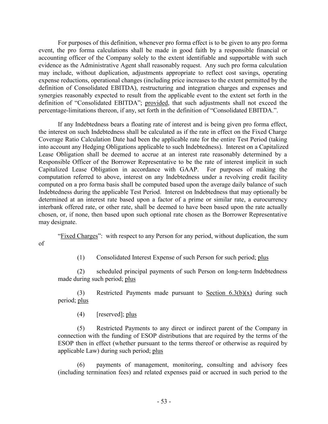 For purposes of this definition, whenever pro forma effect is to be given to any pro forma event, the pro forma calculations shall be made in good faith by a responsible financial or accounting officer of the Company solely to the extent identifiable and supportable with such evidence as the Administrative Agent shall reasonably request. Any such pro forma calculation may include, without duplication, adjustments appropriate to reflect cost savings, operating expense reductions, operational changes (including price increases to the extent permitted by the definition of Consolidated EBITDA), restructuring and integration charges and expenses and synergies reasonably expected to result from the applicable event to the extent set forth in the definition of “Consolidated EBITDA”; provided, that such adjustments shall not exceed the percentage-limitations thereon, if any, set forth in the definition of “Consolidated EBITDA.”. If any Indebtedness bears a floating rate of interest and is being given pro forma effect, the interest on such Indebtedness shall be calculated as if the rate in effect on the Fixed Charge Coverage Ratio Calculation Date had been the applicable rate for the entire Test Period (taking into account any Hedging Obligations applicable to such Indebtedness). Interest on a Capitalized Lease Obligation shall be deemed to accrue at an interest rate reasonably determined by a Responsible Officer of the Borrower Representative to be the rate of interest implicit in such Capitalized Lease Obligation in accordance with GAAP. For purposes of making the computation referred to above, interest on any Indebtedness under a revolving credit facility computed on a pro forma basis shall be computed based upon the average daily balance of such Indebtedness during the applicable Test Period. Interest on Indebtedness that may optionally be determined at an interest rate based upon a factor of a prime or similar rate, a eurocurrency interbank offered rate, or other rate, shall be deemed to have been based upon the rate actually chosen, or, if none, then based upon such optional rate chosen as the Borrower Representative may designate. “Fixed Charges”: with respect to any Person for any period, without duplication, the sum of (1) Consolidated Interest Expense of such Person for such period; plus (2) scheduled principal payments of such Person on long-term Indebtedness made during such period; plus (3) Restricted Payments made pursuant to Section 6.3(b)(x) during such period; plus (4) [reserved]; plus (5) Restricted Payments to any direct or indirect parent of the Company in connection with the funding of ESOP distributions that are required by the terms of the ESOP then in effect (whether pursuant to the terms thereof or otherwise as required by applicable Law) during such period; plus (6) payments of management, monitoring, consulting and advisory fees (including termination fees) and related expenses paid or accrued in such period to the - 53 -