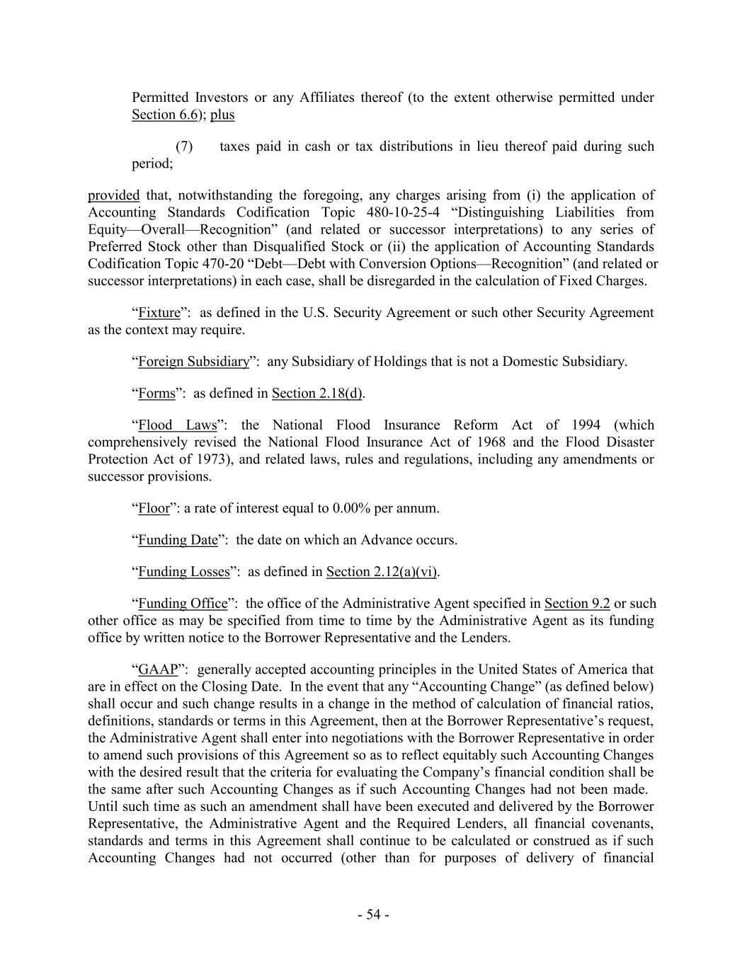 Permitted Investors or any Affiliates thereof (to the extent otherwise permitted under Section 6.6); plus (7) taxes paid in cash or tax distributions in lieu thereof paid during such period; provided that, notwithstanding the foregoing, any charges arising from (i) the application of Accounting Standards Codification Topic 480-10-25-4 “Distinguishing Liabilities from Equity—Overall—Recognition” (and related or successor interpretations) to any series of Preferred Stock other than Disqualified Stock or (ii) the application of Accounting Standards Codification Topic 470-20 “Debt—Debt with Conversion Options—Recognition” (and related or successor interpretations) in each case, shall be disregarded in the calculation of Fixed Charges. “Fixture”: as defined in the U.S. Security Agreement or such other Security Agreement as the context may require. “Foreign Subsidiary”: any Subsidiary of Holdings that is not a Domestic Subsidiary. “Forms”: as defined in Section 2.18(d). “Flood Laws”: the National Flood Insurance Reform Act of 1994 (which comprehensively revised the National Flood Insurance Act of 1968 and the Flood Disaster Protection Act of 1973), and related laws, rules and regulations, including any amendments or successor provisions. “Floor”: a rate of interest equal to 0.00% per annum. “Funding Date”: the date on which an Advance occurs. “Funding Losses”: as defined in Section 2.12(a)(vi). “Funding Office”: the office of the Administrative Agent specified in Section 9.2 or such other office as may be specified from time to time by the Administrative Agent as its funding office by written notice to the Borrower Representative and the Lenders. “GAAP”: generally accepted accounting principles in the United States of America that are in effect on the Closing Date. In the event that any “Accounting Change” (as defined below) shall occur and such change results in a change in the method of calculation of financial ratios, definitions, standards or terms in this Agreement, then at the Borrower Representative’s request, the Administrative Agent shall enter into negotiations with the Borrower Representative in order to amend such provisions of this Agreement so as to reflect equitably such Accounting Changes with the desired result that the criteria for evaluating the Company’s financial condition shall be the same after such Accounting Changes as if such Accounting Changes had not been made. Until such time as such an amendment shall have been executed and delivered by the Borrower Representative, the Administrative Agent and the Required Lenders, all financial covenants, standards and terms in this Agreement shall continue to be calculated or construed as if such Accounting Changes had not occurred (other than for purposes of delivery of financial - 54 -
