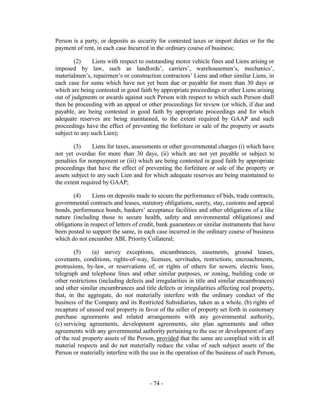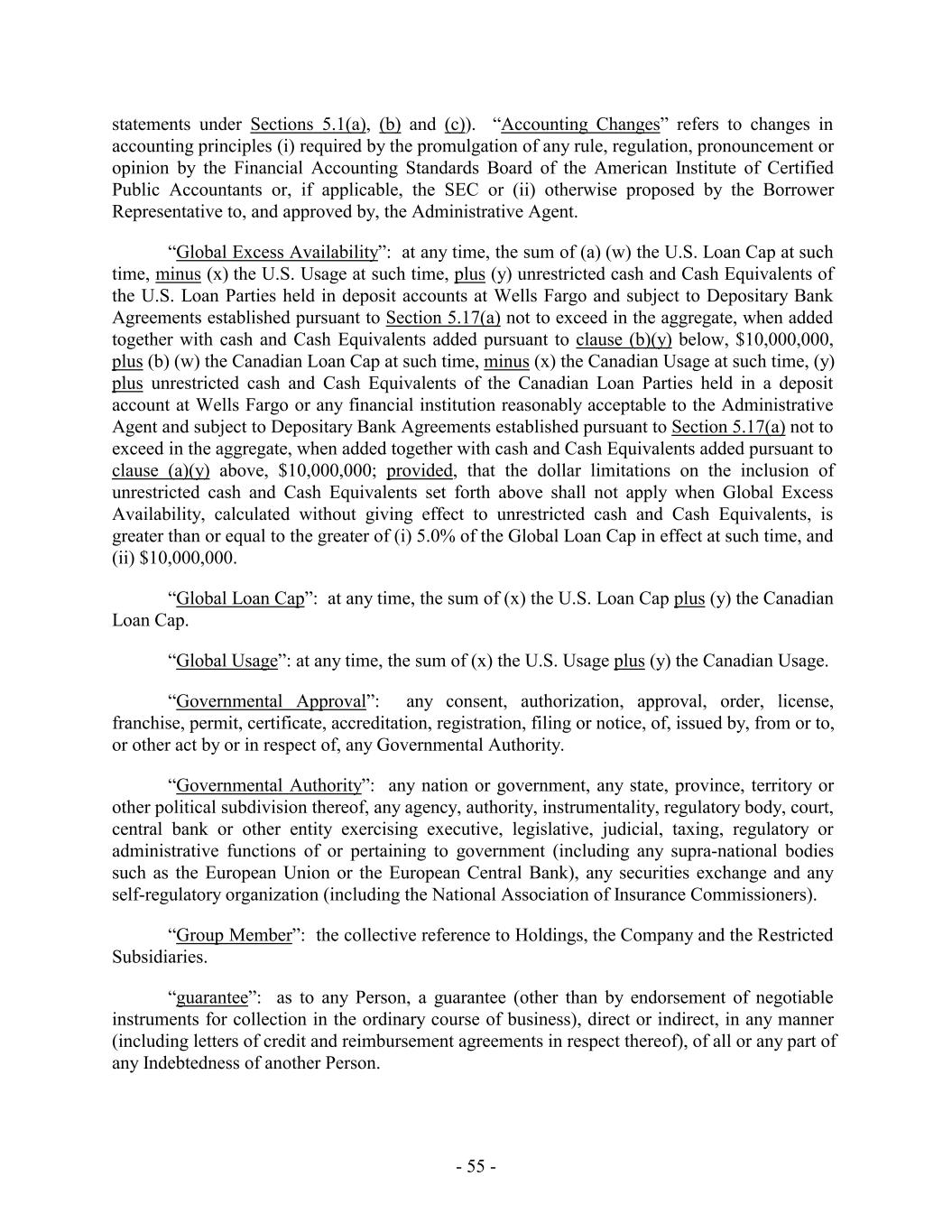 statements under Sections 5.1(a), (b) and (c)). “Accounting Changes” refers to changes in accounting principles (i) required by the promulgation of any rule, regulation, pronouncement or opinion by the Financial Accounting Standards Board of the American Institute of Certified Public Accountants or, if applicable, the SEC or (ii) otherwise proposed by the Borrower Representative to, and approved by, the Administrative Agent. “Global Excess Availability”: at any time, the sum of (a) (w) the U.S. Loan Cap at such time, minus (x) the U.S. Usage at such time, plus (y) unrestricted cash and Cash Equivalents of the U.S. Loan Parties held in deposit accounts at Wells Fargo and subject to Depositary Bank Agreements established pursuant to Section 5.17(a) not to exceed in the aggregate, when added together with cash and Cash Equivalents added pursuant to clause (b)(y) below, $10,000,000, plus (b) (w) the Canadian Loan Cap at such time, minus (x) the Canadian Usage at such time, (y) plus unrestricted cash and Cash Equivalents of the Canadian Loan Parties held in a deposit account at Wells Fargo or any financial institution reasonably acceptable to the Administrative Agent and subject to Depositary Bank Agreements established pursuant to Section 5.17(a) not to exceed in the aggregate, when added together with cash and Cash Equivalents added pursuant to clause (a)(y) above, $10,000,000; provided, that the dollar limitations on the inclusion of unrestricted cash and Cash Equivalents set forth above shall not apply when Global Excess Availability, calculated without giving effect to unrestricted cash and Cash Equivalents, is greater than or equal to the greater of (i) 5.0% of the Global Loan Cap in effect at such time, and (ii) $10,000,000. “Global Loan Cap”: at any time, the sum of (x) the U.S. Loan Cap plus (y) the Canadian Loan Cap. “Global Usage”: at any time, the sum of (x) the U.S. Usage plus (y) the Canadian Usage. “Governmental Approval”: any consent, authorization, approval, order, license, franchise, permit, certificate, accreditation, registration, filing or notice, of, issued by, from or to, or other act by or in respect of, any Governmental Authority. “Governmental Authority”: any nation or government, any state, province, territory or other political subdivision thereof, any agency, authority, instrumentality, regulatory body, court, central bank or other entity exercising executive, legislative, judicial, taxing, regulatory or administrative functions of or pertaining to government (including any supra-national bodies such as the European Union or the European Central Bank), any securities exchange and any self-regulatory organization (including the National Association of Insurance Commissioners). “Group Member”: the collective reference to Holdings, the Company and the Restricted Subsidiaries. “guarantee”: as to any Person, a guarantee (other than by endorsement of negotiable instruments for collection in the ordinary course of business), direct or indirect, in any manner (including letters of credit and reimbursement agreements in respect thereof), of all or any part of any Indebtedness of another Person. - 55 -