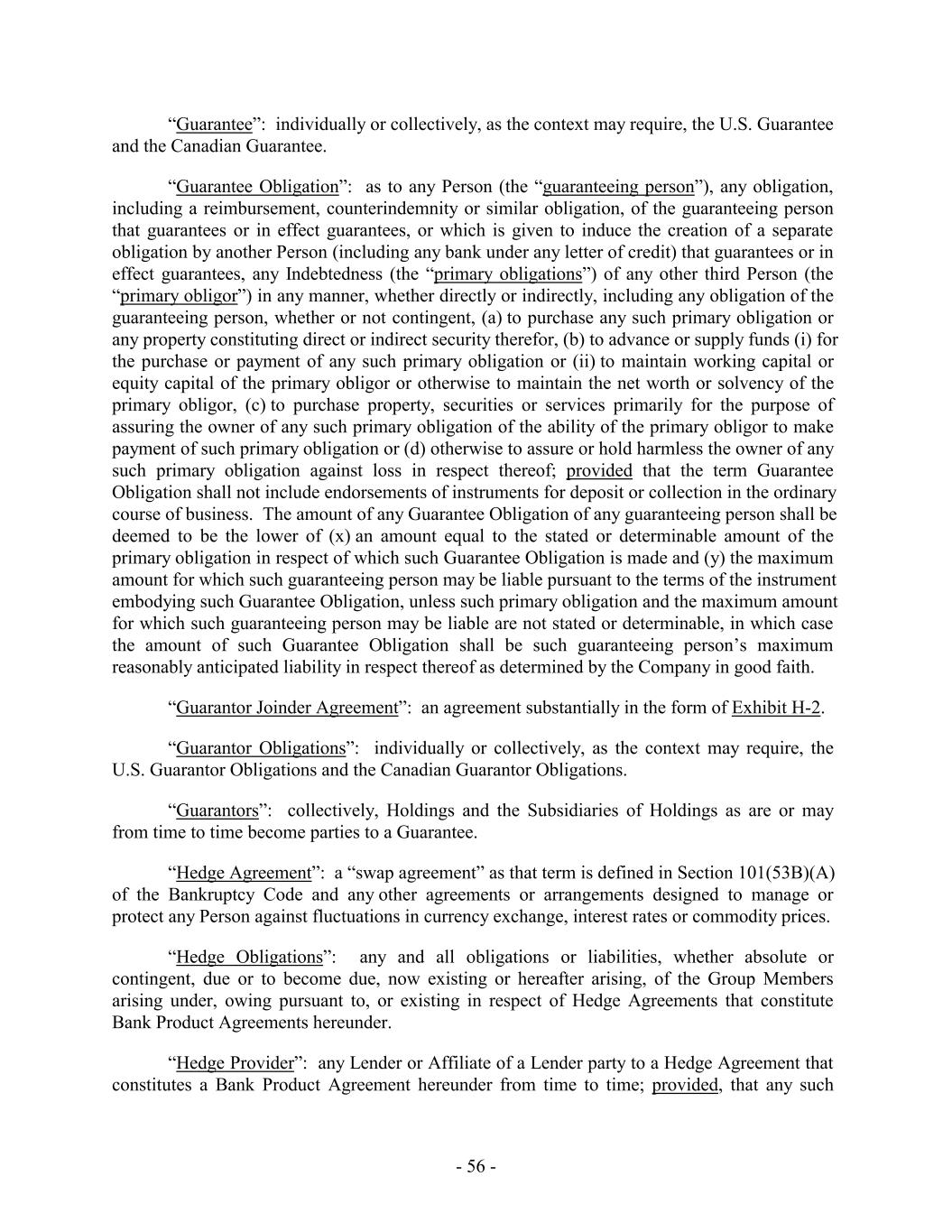 “Guarantee”: individually or collectively, as the context may require, the U.S. Guarantee and the Canadian Guarantee. “Guarantee Obligation”: as to any Person (the “guaranteeing person”), any obligation, including a reimbursement, counterindemnity or similar obligation, of the guaranteeing person that guarantees or in effect guarantees, or which is given to induce the creation of a separate obligation by another Person (including any bank under any letter of credit) that guarantees or in effect guarantees, any Indebtedness (the “primary obligations”) of any other third Person (the “primary obligor”) in any manner, whether directly or indirectly, including any obligation of the guaranteeing person, whether or not contingent, (a) to purchase any such primary obligation or any property constituting direct or indirect security therefor, (b) to advance or supply funds (i) for the purchase or payment of any such primary obligation or (ii) to maintain working capital or equity capital of the primary obligor or otherwise to maintain the net worth or solvency of the primary obligor, (c) to purchase property, securities or services primarily for the purpose of assuring the owner of any such primary obligation of the ability of the primary obligor to make payment of such primary obligation or (d) otherwise to assure or hold harmless the owner of any such primary obligation against loss in respect thereof; provided that the term Guarantee Obligation shall not include endorsements of instruments for deposit or collection in the ordinary course of business. The amount of any Guarantee Obligation of any guaranteeing person shall be deemed to be the lower of (x) an amount equal to the stated or determinable amount of the primary obligation in respect of which such Guarantee Obligation is made and (y) the maximum amount for which such guaranteeing person may be liable pursuant to the terms of the instrument embodying such Guarantee Obligation, unless such primary obligation and the maximum amount for which such guaranteeing person may be liable are not stated or determinable, in which case the amount of such Guarantee Obligation shall be such guaranteeing person’s maximum reasonably anticipated liability in respect thereof as determined by the Company in good faith. “Guarantor Joinder Agreement”: an agreement substantially in the form of Exhibit H-2. “Guarantor Obligations”: individually or collectively, as the context may require, the U.S. Guarantor Obligations and the Canadian Guarantor Obligations. “Guarantors”: collectively, Holdings and the Subsidiaries of Holdings as are or may from time to time become parties to a Guarantee. “Hedge Agreement”: a “swap agreement” as that term is defined in Section 101(53B)(A) of the Bankruptcy Code and any other agreements or arrangements designed to manage or protect any Person against fluctuations in currency exchange, interest rates or commodity prices. “Hedge Obligations”: any and all obligations or liabilities, whether absolute or contingent, due or to become due, now existing or hereafter arising, of the Group Members arising under, owing pursuant to, or existing in respect of Hedge Agreements that constitute Bank Product Agreements hereunder. “Hedge Provider”: any Lender or Affiliate of a Lender party to a Hedge Agreement that constitutes a Bank Product Agreement hereunder from time to time; provided, that any such - 56 -