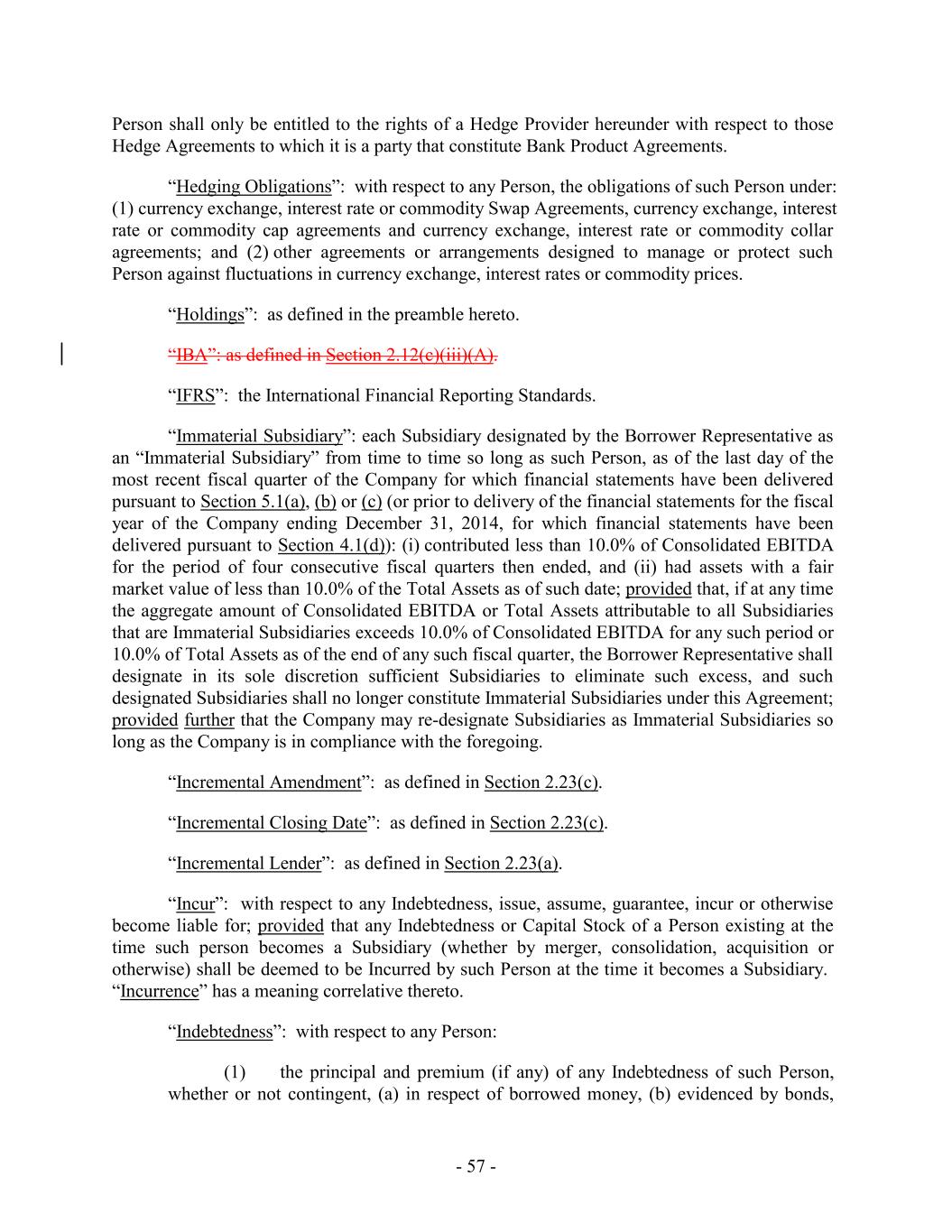 Person shall only be entitled to the rights of a Hedge Provider hereunder with respect to those Hedge Agreements to which it is a party that constitute Bank Product Agreements. “Hedging Obligations”: with respect to any Person, the obligations of such Person under: (1) currency exchange, interest rate or commodity Swap Agreements, currency exchange, interest rate or commodity cap agreements and currency exchange, interest rate or commodity collar agreements; and (2) other agreements or arrangements designed to manage or protect such Person against fluctuations in currency exchange, interest rates or commodity prices. “Holdings”: as defined in the preamble hereto. “IBA”: as defined in Section 2.12(c)(iii)(A). “IFRS”: the International Financial Reporting Standards. “Immaterial Subsidiary”: each Subsidiary designated by the Borrower Representative as an “Immaterial Subsidiary” from time to time so long as such Person, as of the last day of the most recent fiscal quarter of the Company for which financial statements have been delivered pursuant to Section 5.1(a), (b) or (c) (or prior to delivery of the financial statements for the fiscal year of the Company ending December 31, 2014, for which financial statements have been delivered pursuant to Section 4.1(d)): (i) contributed less than 10.0% of Consolidated EBITDA for the period of four consecutive fiscal quarters then ended, and (ii) had assets with a fair market value of less than 10.0% of the Total Assets as of such date; provided that, if at any time the aggregate amount of Consolidated EBITDA or Total Assets attributable to all Subsidiaries that are Immaterial Subsidiaries exceeds 10.0% of Consolidated EBITDA for any such period or 10.0% of Total Assets as of the end of any such fiscal quarter, the Borrower Representative shall designate in its sole discretion sufficient Subsidiaries to eliminate such excess, and such designated Subsidiaries shall no longer constitute Immaterial Subsidiaries under this Agreement; provided further that the Company may re-designate Subsidiaries as Immaterial Subsidiaries so long as the Company is in compliance with the foregoing. “Incremental Amendment”: as defined in Section 2.23(c). “Incremental Closing Date”: as defined in Section 2.23(c). “Incremental Lender”: as defined in Section 2.23(a). “Incur”: with respect to any Indebtedness, issue, assume, guarantee, incur or otherwise become liable for; provided that any Indebtedness or Capital Stock of a Person existing at the time such person becomes a Subsidiary (whether by merger, consolidation, acquisition or otherwise) shall be deemed to be Incurred by such Person at the time it becomes a Subsidiary. “Incurrence” has a meaning correlative thereto. “Indebtedness”: with respect to any Person: (1) the principal and premium (if any) of any Indebtedness of such Person, whether or not contingent, (a) in respect of borrowed money, (b) evidenced by bonds, - 57 -