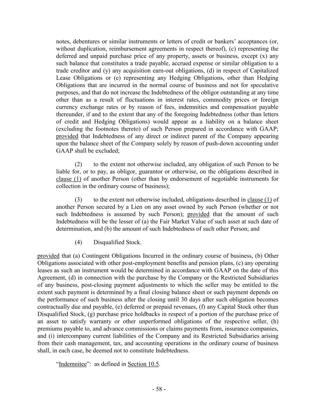 notes, debentures or similar instruments or letters of credit or bankers’ acceptances (or, without duplication, reimbursement agreements in respect thereof), (c) representing the deferred and unpaid purchase price of any property, assets or business, except (x) any such balance that constitutes a trade payable, accrued expense or similar obligation to a trade creditor and (y) any acquisition earn-out obligations, (d) in respect of Capitalized Lease Obligations or (e) representing any Hedging Obligations, other than Hedging Obligations that are incurred in the normal course of business and not for speculative purposes, and that do not increase the Indebtedness of the obligor outstanding at any time other than as a result of fluctuations in interest rates, commodity prices or foreign currency exchange rates or by reason of fees, indemnities and compensation payable thereunder, if and to the extent that any of the foregoing Indebtedness (other than letters of credit and Hedging Obligations) would appear as a liability on a balance sheet (excluding the footnotes thereto) of such Person prepared in accordance with GAAP; provided that Indebtedness of any direct or indirect parent of the Company appearing upon the balance sheet of the Company solely by reason of push-down accounting under GAAP shall be excluded; (2) to the extent not otherwise included, any obligation of such Person to be liable for, or to pay, as obligor, guarantor or otherwise, on the obligations described in clause (1) of another Person (other than by endorsement of negotiable instruments for collection in the ordinary course of business); (3) to the extent not otherwise included, obligations described in clause (1) of another Person secured by a Lien on any asset owned by such Person (whether or not such Indebtedness is assumed by such Person); provided that the amount of such Indebtedness will be the lesser of (a) the Fair Market Value of such asset at such date of determination, and (b) the amount of such Indebtedness of such other Person; and (4) Disqualified Stock. provided that (a) Contingent Obligations Incurred in the ordinary course of business, (b) Other Obligations associated with other post-employment benefits and pension plans, (c) any operating leases as such an instrument would be determined in accordance with GAAP on the date of this Agreement, (d) in connection with the purchase by the Company or the Restricted Subsidiaries of any business, post-closing payment adjustments to which the seller may be entitled to the extent such payment is determined by a final closing balance sheet or such payment depends on the performance of such business after the closing until 30 days after such obligation becomes contractually due and payable, (e) deferred or prepaid revenues, (f) any Capital Stock other than Disqualified Stock, (g) purchase price holdbacks in respect of a portion of the purchase price of an asset to satisfy warranty or other unperformed obligations of the respective seller, (h) premiums payable to, and advance commissions or claims payments from, insurance companies, and (i) intercompany current liabilities of the Company and its Restricted Subsidiaries arising from their cash management, tax, and accounting operations in the ordinary course of business shall, in each case, be deemed not to constitute Indebtedness. “Indemnitee”: as defined in Section 10.5. - 58 -