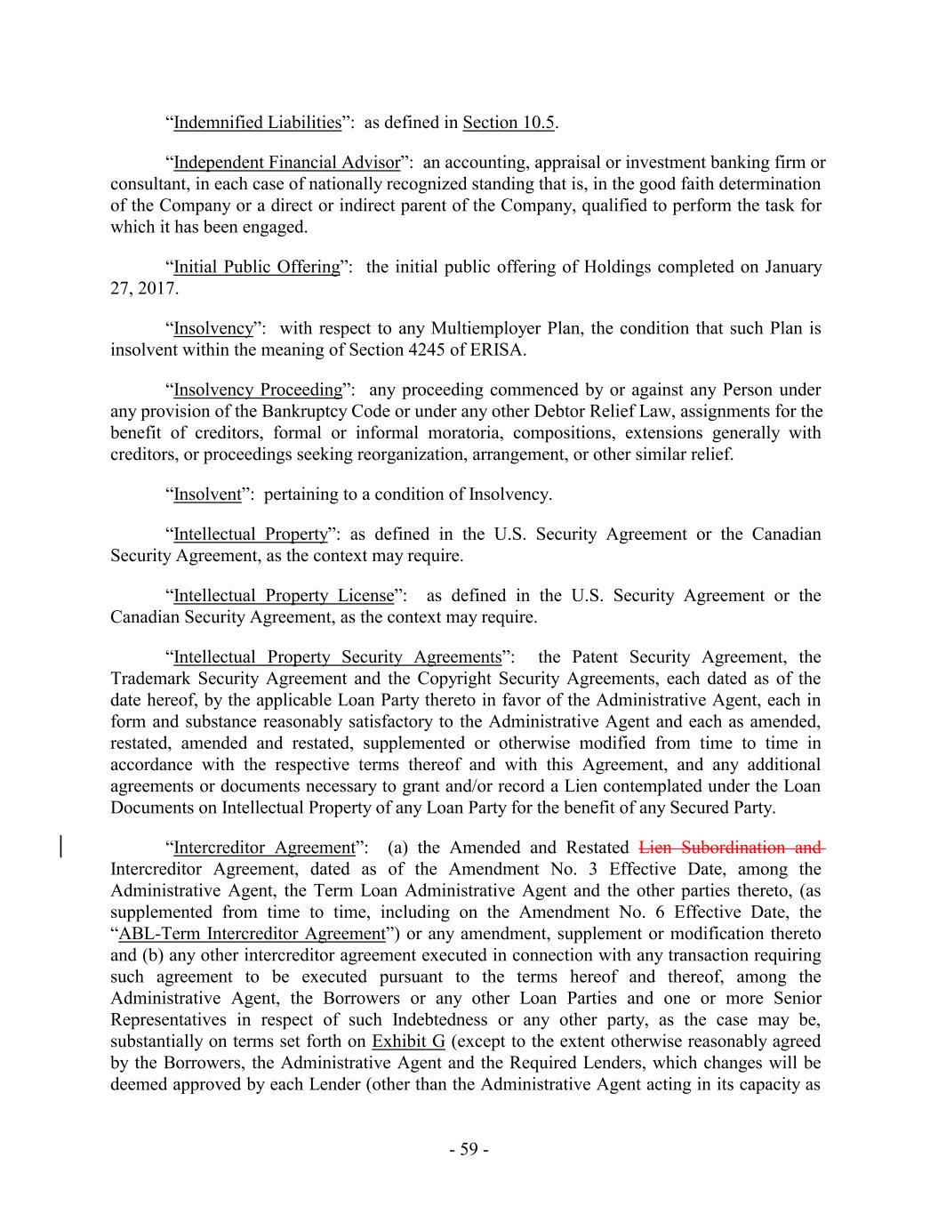 “Indemnified Liabilities”: as defined in Section 10.5. “Independent Financial Advisor”: an accounting, appraisal or investment banking firm or consultant, in each case of nationally recognized standing that is, in the good faith determination of the Company or a direct or indirect parent of the Company, qualified to perform the task for which it has been engaged. “Initial Public Offering”: the initial public offering of Holdings completed on January 27, 2017. “Insolvency”: with respect to any Multiemployer Plan, the condition that such Plan is insolvent within the meaning of Section 4245 of ERISA. “Insolvency Proceeding”: any proceeding commenced by or against any Person under any provision of the Bankruptcy Code or under any other Debtor Relief Law, assignments for the benefit of creditors, formal or informal moratoria, compositions, extensions generally with creditors, or proceedings seeking reorganization, arrangement, or other similar relief. “Insolvent”: pertaining to a condition of Insolvency. “Intellectual Property”: as defined in the U.S. Security Agreement or the Canadian Security Agreement, as the context may require. “Intellectual Property License”: as defined in the U.S. Security Agreement or the Canadian Security Agreement, as the context may require. “Intellectual Property Security Agreements”: the Patent Security Agreement, the Trademark Security Agreement and the Copyright Security Agreements, each dated as of the date hereof, by the applicable Loan Party thereto in favor of the Administrative Agent, each in form and substance reasonably satisfactory to the Administrative Agent and each as amended, restated, amended and restated, supplemented or otherwise modified from time to time in accordance with the respective terms thereof and with this Agreement, and any additional agreements or documents necessary to grant and/or record a Lien contemplated under the Loan Documents on Intellectual Property of any Loan Party for the benefit of any Secured Party. “Intercreditor Agreement”: (a) the Amended and Restated Lien Subordination and Intercreditor Agreement, dated as of the Amendment No. 3 Effective Date, among the Administrative Agent, the Term Loan Administrative Agent and the other parties thereto, (as supplemented from time to time, including on the Amendment No. 6 Effective Date, the “ABL-Term Intercreditor Agreement”) or any amendment, supplement or modification thereto and (b) any other intercreditor agreement executed in connection with any transaction requiring such agreement to be executed pursuant to the terms hereof and thereof, among the Administrative Agent, the Borrowers or any other Loan Parties and one or more Senior Representatives in respect of such Indebtedness or any other party, as the case may be, substantially on terms set forth on Exhibit G (except to the extent otherwise reasonably agreed by the Borrowers, the Administrative Agent and the Required Lenders, which changes will be deemed approved by each Lender (other than the Administrative Agent acting in its capacity as - 59 -