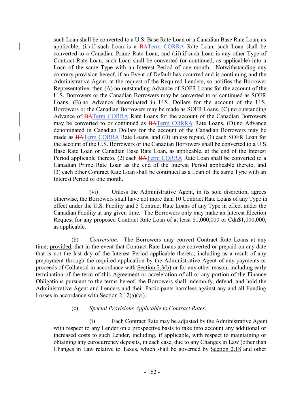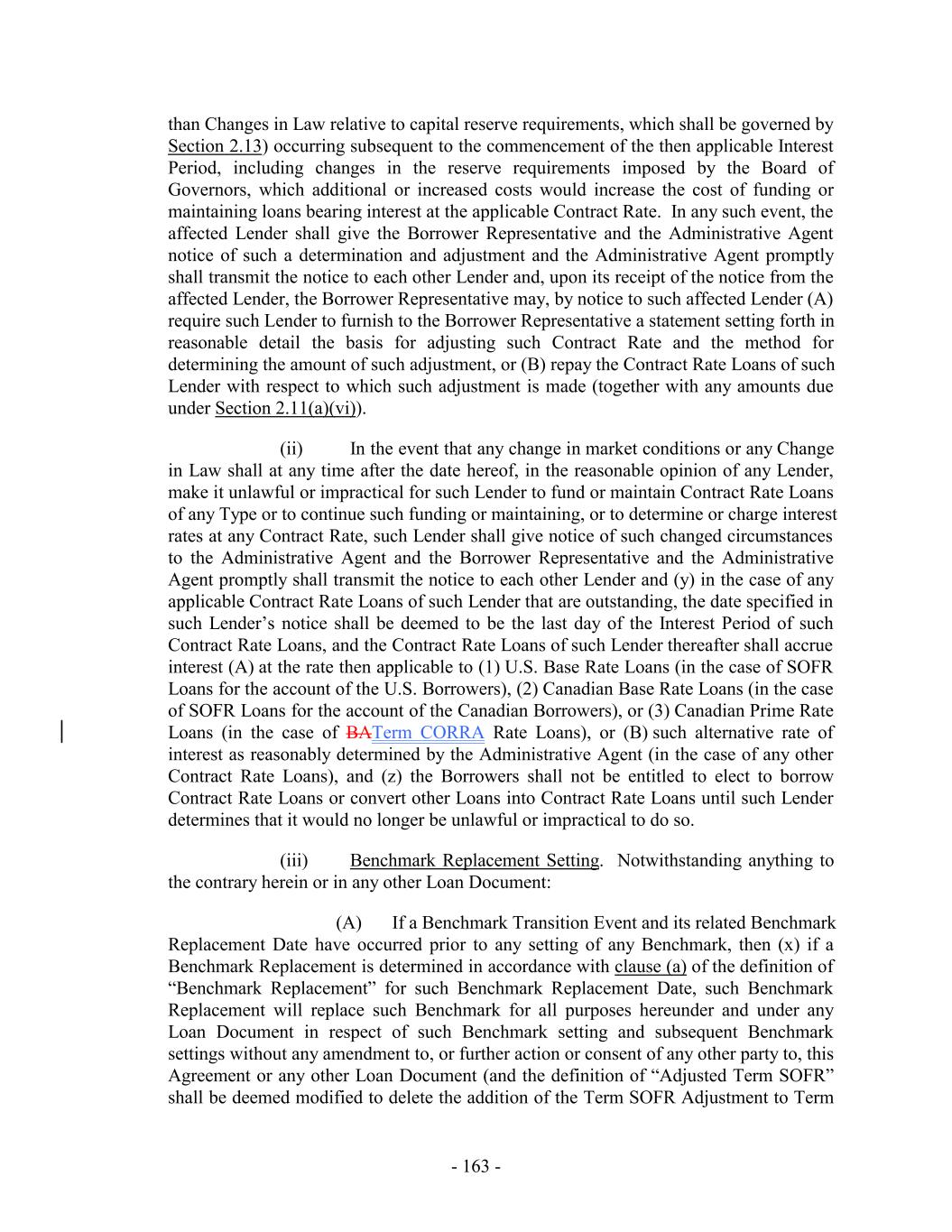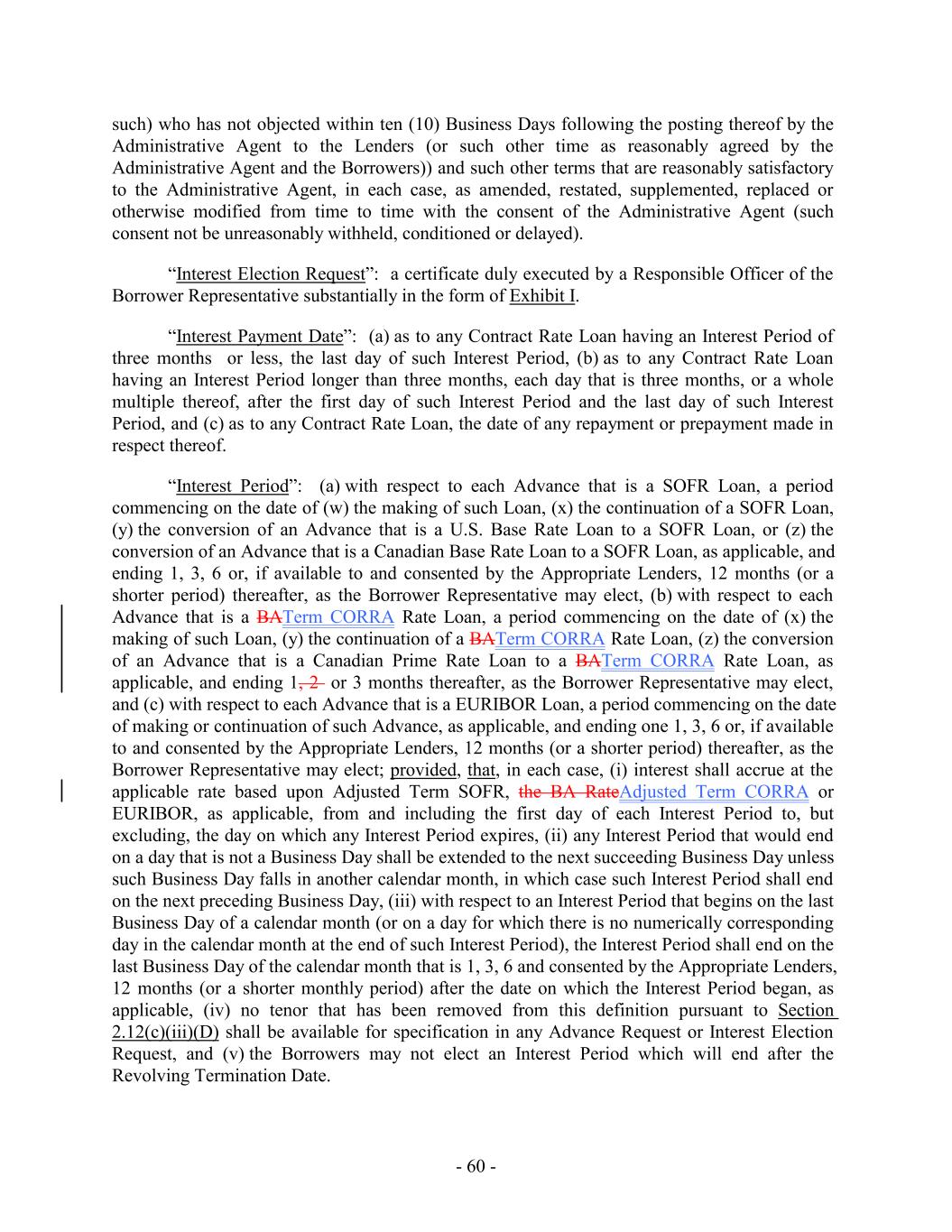 such) who has not objected within ten (10) Business Days following the posting thereof by the Administrative Agent to the Lenders (or such other time as reasonably agreed by the Administrative Agent and the Borrowers)) and such other terms that are reasonably satisfactory to the Administrative Agent, in each case, as amended, restated, supplemented, replaced or otherwise modified from time to time with the consent of the Administrative Agent (such consent not be unreasonably withheld, conditioned or delayed). “Interest Election Request”: a certificate duly executed by a Responsible Officer of the Borrower Representative substantially in the form of Exhibit I. “Interest Payment Date”: (a) as to any Contract Rate Loan having an Interest Period of three months or less, the last day of such Interest Period, (b) as to any Contract Rate Loan having an Interest Period longer than three months, each day that is three months, or a whole multiple thereof, after the first day of such Interest Period and the last day of such Interest Period, and (c) as to any Contract Rate Loan, the date of any repayment or prepayment made in respect thereof. “Interest Period”: (a) with respect to each Advance that is a SOFR Loan, a period commencing on the date of (w) the making of such Loan, (x) the continuation of a SOFR Loan, (y) the conversion of an Advance that is a U.S. Base Rate Loan to a SOFR Loan, or (z) the conversion of an Advance that is a Canadian Base Rate Loan to a SOFR Loan, as applicable, and ending 1, 3, 6 or, if available to and consented by the Appropriate Lenders, 12 months (or a shorter period) thereafter, as the Borrower Representative may elect, (b) with respect to each Advance that is a BATerm CORRA Rate Loan, a period commencing on the date of (x) the making of such Loan, (y) the continuation of a BATerm CORRA Rate Loan, (z) the conversion of an Advance that is a Canadian Prime Rate Loan to a BATerm CORRA Rate Loan, as applicable, and ending 1, 2 or 3 months thereafter, as the Borrower Representative may elect, and (c) with respect to each Advance that is a EURIBOR Loan, a period commencing on the date of making or continuation of such Advance, as applicable, and ending one 1, 3, 6 or, if available to and consented by the Appropriate Lenders, 12 months (or a shorter period) thereafter, as the Borrower Representative may elect; provided, that, in each case, (i) interest shall accrue at the applicable rate based upon Adjusted Term SOFR, the BA RateAdjusted Term CORRA or EURIBOR, as applicable, from and including the first day of each Interest Period to, but excluding, the day on which any Interest Period expires, (ii) any Interest Period that would end on a day that is not a Business Day shall be extended to the next succeeding Business Day unless such Business Day falls in another calendar month, in which case such Interest Period shall end on the next preceding Business Day, (iii) with respect to an Interest Period that begins on the last Business Day of a calendar month (or on a day for which there is no numerically corresponding day in the calendar month at the end of such Interest Period), the Interest Period shall end on the last Business Day of the calendar month that is 1, 3, 6 and consented by the Appropriate Lenders, 12 months (or a shorter monthly period) after the date on which the Interest Period began, as applicable, (iv) no tenor that has been removed from this definition pursuant to Section 2.12(c)(iii)(D) shall be available for specification in any Advance Request or Interest Election Request, and (v) the Borrowers may not elect an Interest Period which will end after the Revolving Termination Date. - 60 -
