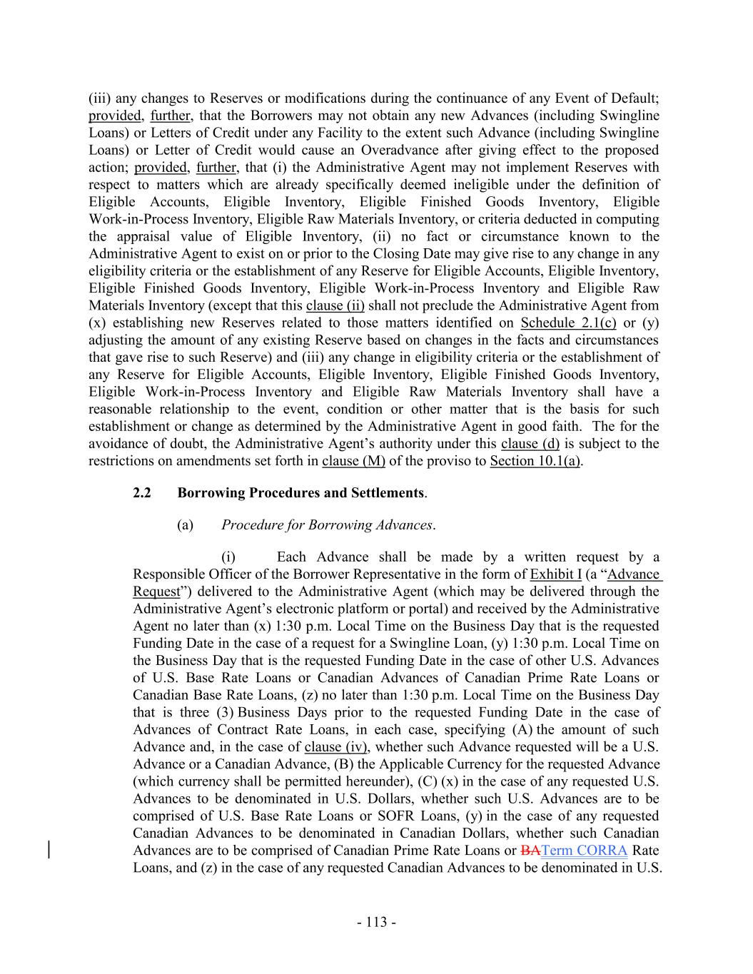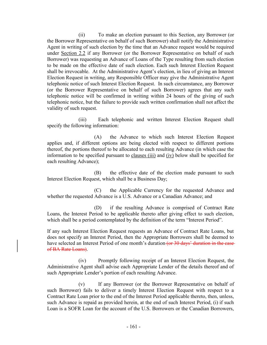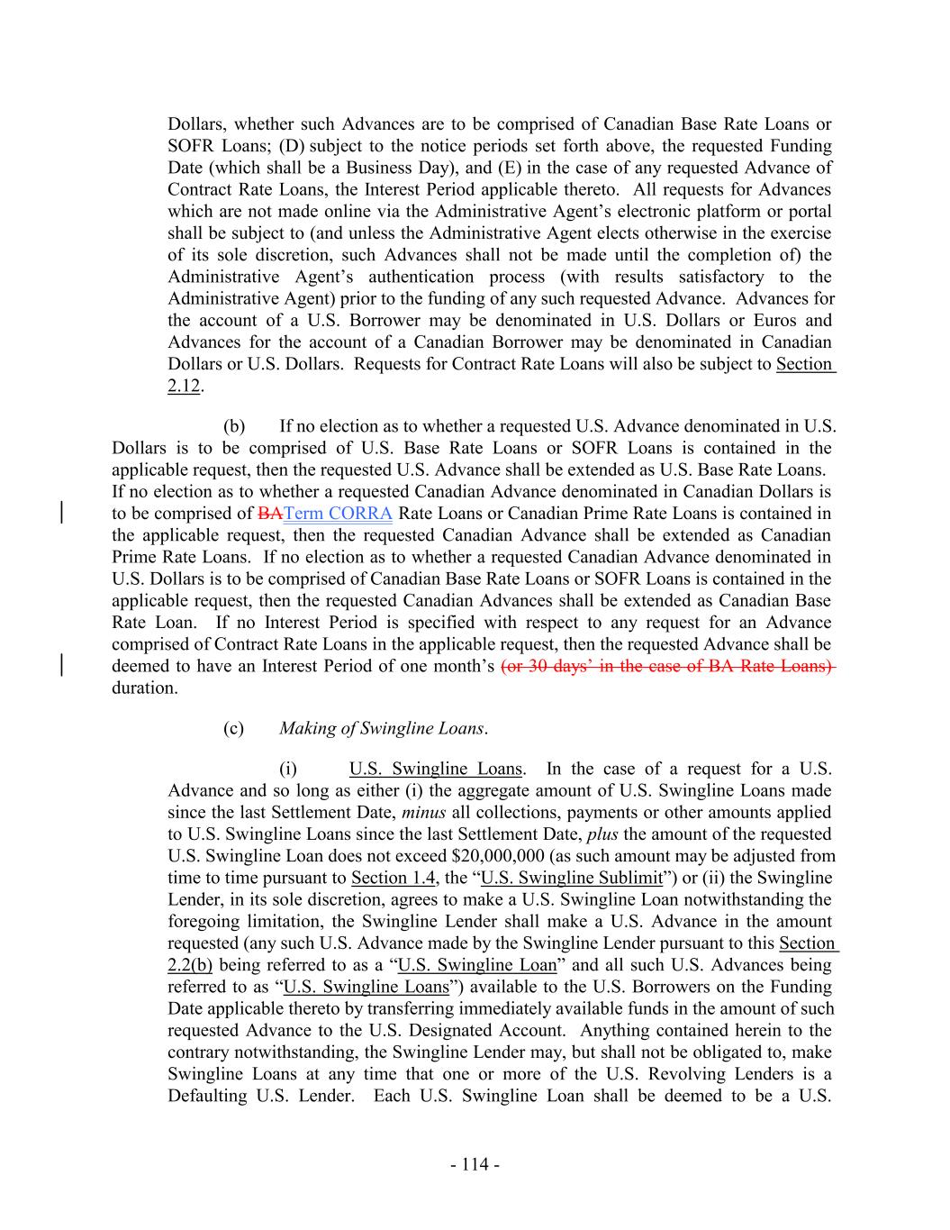 such) who has not objected within ten (10) Business Days following the posting thereof by the Administrative Agent to the Lenders (or such other time as reasonably agreed by the Administrative Agent and the Borrowers)) and such other terms that are reasonably satisfactory to the Administrative Agent, in each case, as amended, restated, supplemented, replaced or otherwise modified from time to time with the consent of the Administrative Agent (such consent not be unreasonably withheld, conditioned or delayed). “Interest Election Request”: a certificate duly executed by a Responsible Officer of the Borrower Representative substantially in the form of Exhibit I. “Interest Payment Date”: (a) as to any Contract Rate Loan having an Interest Period of three months or less, the last day of such Interest Period, (b) as to any Contract Rate Loan having an Interest Period longer than three months, each day that is three months, or a whole multiple thereof, after the first day of such Interest Period and the last day of such Interest Period, and (c) as to any Contract Rate Loan, the date of any repayment or prepayment made in respect thereof. “Interest Period”: (a) with respect to each Advance that is a SOFR Loan, a period commencing on the date of (w) the making of such Loan, (x) the continuation of a SOFR Loan, (y) the conversion of an Advance that is a U.S. Base Rate Loan to a SOFR Loan, or (z) the conversion of an Advance that is a Canadian Base Rate Loan to a SOFR Loan, as applicable, and ending 1, 3, 6 or, if available to and consented by the Appropriate Lenders, 12 months (or a shorter period) thereafter, as the Borrower Representative may elect, (b) with respect to each Advance that is a BATerm CORRA Rate Loan, a period commencing on the date of (x) the making of such Loan, (y) the continuation of a BATerm CORRA Rate Loan, (z) the conversion of an Advance that is a Canadian Prime Rate Loan to a BATerm CORRA Rate Loan, as applicable, and ending 1, 2 or 3 months thereafter, as the Borrower Representative may elect, and (c) with respect to each Advance that is a EURIBOR Loan, a period commencing on the date of making or continuation of such Advance, as applicable, and ending one 1, 3, 6 or, if available to and consented by the Appropriate Lenders, 12 months (or a shorter period) thereafter, as the Borrower Representative may elect; provided, that, in each case, (i) interest shall accrue at the applicable rate based upon Adjusted Term SOFR, the BA RateAdjusted Term CORRA or EURIBOR, as applicable, from and including the first day of each Interest Period to, but excluding, the day on which any Interest Period expires, (ii) any Interest Period that would end on a day that is not a Business Day shall be extended to the next succeeding Business Day unless such Business Day falls in another calendar month, in which case such Interest Period shall end on the next preceding Business Day, (iii) with respect to an Interest Period that begins on the last Business Day of a calendar month (or on a day for which there is no numerically corresponding day in the calendar month at the end of such Interest Period), the Interest Period shall end on the last Business Day of the calendar month that is 1, 3, 6 and consented by the Appropriate Lenders, 12 months (or a shorter monthly period) after the date on which the Interest Period began, as applicable, (iv) no tenor that has been removed from this definition pursuant to Section 2.12(c)(iii)(D) shall be available for specification in any Advance Request or Interest Election Request, and (v) the Borrowers may not elect an Interest Period which will end after the Revolving Termination Date. - 60 -