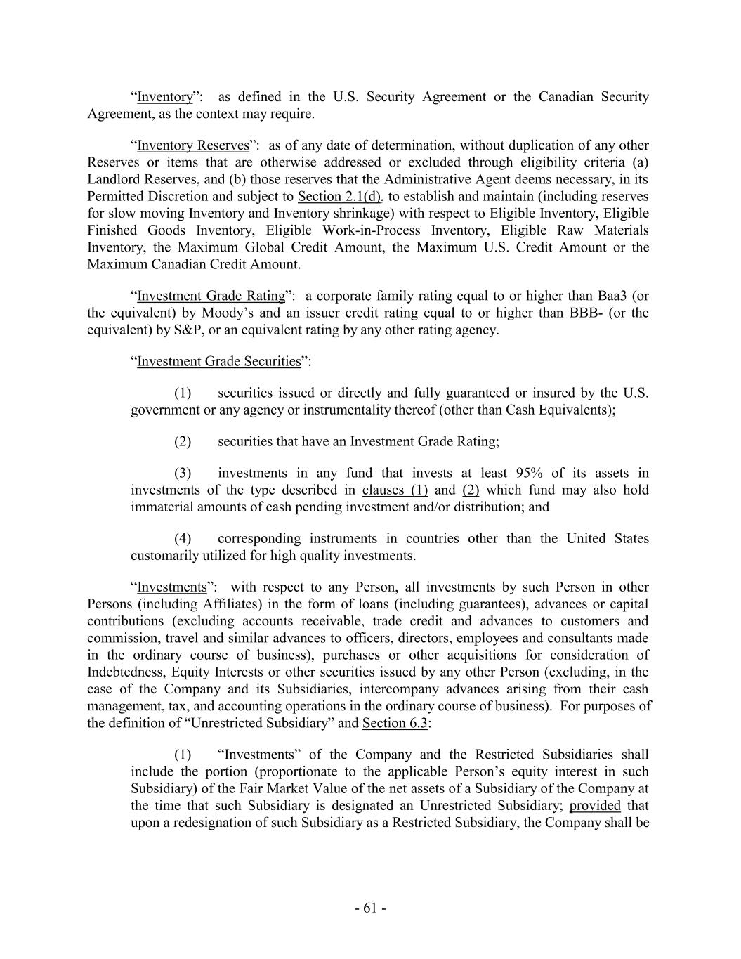 “Inventory”: as defined in the U.S. Security Agreement or the Canadian Security Agreement, as the context may require. “Inventory Reserves”: as of any date of determination, without duplication of any other Reserves or items that are otherwise addressed or excluded through eligibility criteria (a) Landlord Reserves, and (b) those reserves that the Administrative Agent deems necessary, in its Permitted Discretion and subject to Section 2.1(d), to establish and maintain (including reserves for slow moving Inventory and Inventory shrinkage) with respect to Eligible Inventory, Eligible Finished Goods Inventory, Eligible Work-in-Process Inventory, Eligible Raw Materials Inventory, the Maximum Global Credit Amount, the Maximum U.S. Credit Amount or the Maximum Canadian Credit Amount. “Investment Grade Rating”: a corporate family rating equal to or higher than Baa3 (or the equivalent) by Moody’s and an issuer credit rating equal to or higher than BBB- (or the equivalent) by S&P, or an equivalent rating by any other rating agency. “Investment Grade Securities”: (1) securities issued or directly and fully guaranteed or insured by the U.S. government or any agency or instrumentality thereof (other than Cash Equivalents); (2) securities that have an Investment Grade Rating; (3) investments in any fund that invests at least 95% of its assets in investments of the type described in clauses (1) and (2) which fund may also hold immaterial amounts of cash pending investment and/or distribution; and (4) corresponding instruments in countries other than the United States customarily utilized for high quality investments. “Investments”: with respect to any Person, all investments by such Person in other Persons (including Affiliates) in the form of loans (including guarantees), advances or capital contributions (excluding accounts receivable, trade credit and advances to customers and commission, travel and similar advances to officers, directors, employees and consultants made in the ordinary course of business), purchases or other acquisitions for consideration of Indebtedness, Equity Interests or other securities issued by any other Person (excluding, in the case of the Company and its Subsidiaries, intercompany advances arising from their cash management, tax, and accounting operations in the ordinary course of business). For purposes of the definition of “Unrestricted Subsidiary” and Section 6.3: (1) “Investments” of the Company and the Restricted Subsidiaries shall include the portion (proportionate to the applicable Person’s equity interest in such Subsidiary) of the Fair Market Value of the net assets of a Subsidiary of the Company at the time that such Subsidiary is designated an Unrestricted Subsidiary; provided that upon a redesignation of such Subsidiary as a Restricted Subsidiary, the Company shall be - 61 -