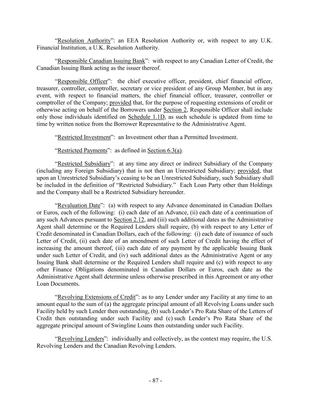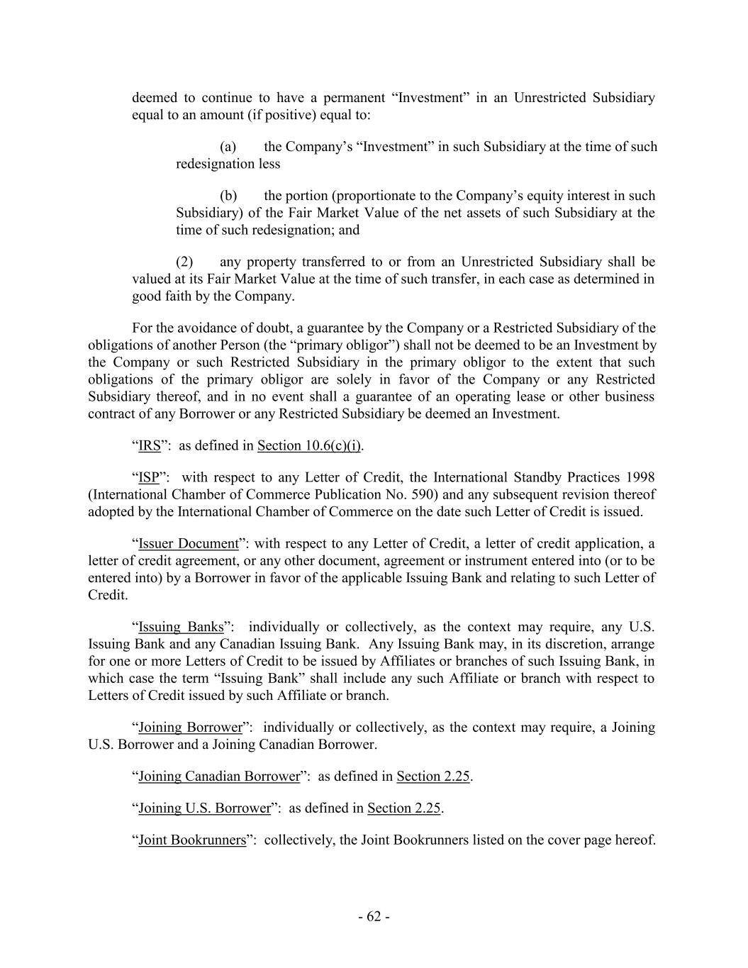 deemed to continue to have a permanent “Investment” in an Unrestricted Subsidiary equal to an amount (if positive) equal to: (a) the Company’s “Investment” in such Subsidiary at the time of such redesignation less (b) the portion (proportionate to the Company’s equity interest in such Subsidiary) of the Fair Market Value of the net assets of such Subsidiary at the time of such redesignation; and (2) any property transferred to or from an Unrestricted Subsidiary shall be valued at its Fair Market Value at the time of such transfer, in each case as determined in good faith by the Company. For the avoidance of doubt, a guarantee by the Company or a Restricted Subsidiary of the obligations of another Person (the “primary obligor”) shall not be deemed to be an Investment by the Company or such Restricted Subsidiary in the primary obligor to the extent that such obligations of the primary obligor are solely in favor of the Company or any Restricted Subsidiary thereof, and in no event shall a guarantee of an operating lease or other business contract of any Borrower or any Restricted Subsidiary be deemed an Investment. “IRS”: as defined in Section 10.6(c)(i). “ISP”: with respect to any Letter of Credit, the International Standby Practices 1998 (International Chamber of Commerce Publication No. 590) and any subsequent revision thereof adopted by the International Chamber of Commerce on the date such Letter of Credit is issued. “Issuer Document”: with respect to any Letter of Credit, a letter of credit application, a letter of credit agreement, or any other document, agreement or instrument entered into (or to be entered into) by a Borrower in favor of the applicable Issuing Bank and relating to such Letter of Credit. “Issuing Banks”: individually or collectively, as the context may require, any U.S. Issuing Bank and any Canadian Issuing Bank. Any Issuing Bank may, in its discretion, arrange for one or more Letters of Credit to be issued by Affiliates or branches of such Issuing Bank, in which case the term “Issuing Bank” shall include any such Affiliate or branch with respect to Letters of Credit issued by such Affiliate or branch. “Joining Borrower”: individually or collectively, as the context may require, a Joining U.S. Borrower and a Joining Canadian Borrower. “Joining Canadian Borrower”: as defined in Section 2.25. “Joining U.S. Borrower”: as defined in Section 2.25. “Joint Bookrunners”: collectively, the Joint Bookrunners listed on the cover page hereof. - 62 -