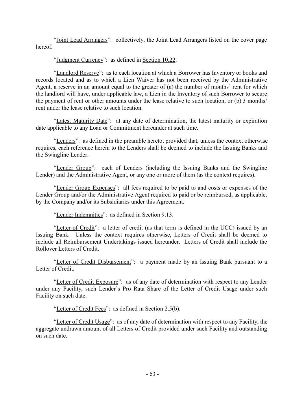“Joint Lead Arrangers”: collectively, the Joint Lead Arrangers listed on the cover page hereof. “Judgment Currency”: as defined in Section 10.22. “Landlord Reserve”: as to each location at which a Borrower has Inventory or books and records located and as to which a Lien Waiver has not been received by the Administrative Agent, a reserve in an amount equal to the greater of (a) the number of months’ rent for which the landlord will have, under applicable law, a Lien in the Inventory of such Borrower to secure the payment of rent or other amounts under the lease relative to such location, or (b) 3 months’ rent under the lease relative to such location. “Latest Maturity Date”: at any date of determination, the latest maturity or expiration date applicable to any Loan or Commitment hereunder at such time. “Lenders”: as defined in the preamble hereto; provided that, unless the context otherwise requires, each reference herein to the Lenders shall be deemed to include the Issuing Banks and the Swingline Lender. “Lender Group”: each of Lenders (including the Issuing Banks and the Swingline Lender) and the Administrative Agent, or any one or more of them (as the context requires). “Lender Group Expenses”: all fees required to be paid to and costs or expenses of the Lender Group and/or the Administrative Agent required to paid or be reimbursed, as applicable, by the Company and/or its Subsidiaries under this Agreement. “Lender Indemnities”: as defined in Section 9.13. “Letter of Credit”: a letter of credit (as that term is defined in the UCC) issued by an Issuing Bank. Unless the context requires otherwise, Letters of Credit shall be deemed to include all Reimbursement Undertakings issued hereunder. Letters of Credit shall include the Rollover Letters of Credit. “Letter of Credit Disbursement”: a payment made by an Issuing Bank pursuant to a Letter of Credit. “Letter of Credit Exposure”: as of any date of determination with respect to any Lender under any Facility, such Lender’s Pro Rata Share of the Letter of Credit Usage under such Facility on such date. “Letter of Credit Fees”: as defined in Section 2.5(b). “Letter of Credit Usage”: as of any date of determination with respect to any Facility, the aggregate undrawn amount of all Letters of Credit provided under such Facility and outstanding on such date. - 63 -