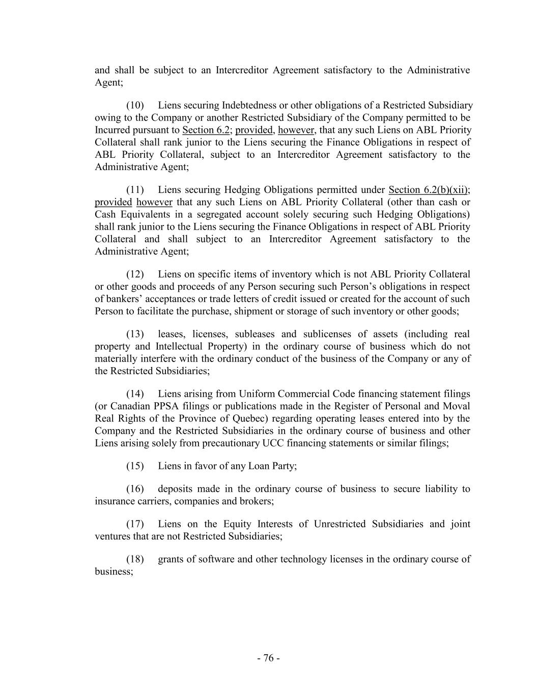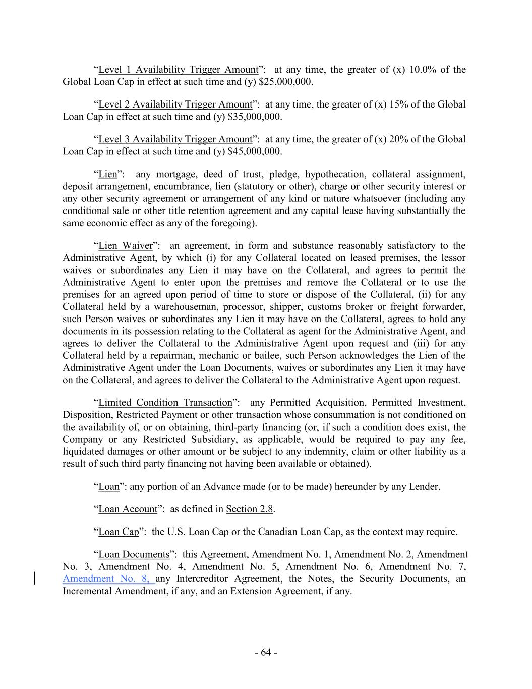 “Level 1 Availability Trigger Amount”: at any time, the greater of (x) 10.0% of the Global Loan Cap in effect at such time and (y) $25,000,000. “Level 2 Availability Trigger Amount”: at any time, the greater of (x) 15% of the Global Loan Cap in effect at such time and (y) $35,000,000. “Level 3 Availability Trigger Amount”: at any time, the greater of (x) 20% of the Global Loan Cap in effect at such time and (y) $45,000,000. “Lien”: any mortgage, deed of trust, pledge, hypothecation, collateral assignment, deposit arrangement, encumbrance, lien (statutory or other), charge or other security interest or any other security agreement or arrangement of any kind or nature whatsoever (including any conditional sale or other title retention agreement and any capital lease having substantially the same economic effect as any of the foregoing). “Lien Waiver”: an agreement, in form and substance reasonably satisfactory to the Administrative Agent, by which (i) for any Collateral located on leased premises, the lessor waives or subordinates any Lien it may have on the Collateral, and agrees to permit the Administrative Agent to enter upon the premises and remove the Collateral or to use the premises for an agreed upon period of time to store or dispose of the Collateral, (ii) for any Collateral held by a warehouseman, processor, shipper, customs broker or freight forwarder, such Person waives or subordinates any Lien it may have on the Collateral, agrees to hold any documents in its possession relating to the Collateral as agent for the Administrative Agent, and agrees to deliver the Collateral to the Administrative Agent upon request and (iii) for any Collateral held by a repairman, mechanic or bailee, such Person acknowledges the Lien of the Administrative Agent under the Loan Documents, waives or subordinates any Lien it may have on the Collateral, and agrees to deliver the Collateral to the Administrative Agent upon request. “Limited Condition Transaction”: any Permitted Acquisition, Permitted Investment, Disposition, Restricted Payment or other transaction whose consummation is not conditioned on the availability of, or on obtaining, third-party financing (or, if such a condition does exist, the Company or any Restricted Subsidiary, as applicable, would be required to pay any fee, liquidated damages or other amount or be subject to any indemnity, claim or other liability as a result of such third party financing not having been available or obtained). “Loan”: any portion of an Advance made (or to be made) hereunder by any Lender. “Loan Account”: as defined in Section 2.8. “Loan Cap”: the U.S. Loan Cap or the Canadian Loan Cap, as the context may require. “Loan Documents”: this Agreement, Amendment No. 1, Amendment No. 2, Amendment No. 3, Amendment No. 4, Amendment No. 5, Amendment No. 6, Amendment No. 7, Amendment No. 8, any Intercreditor Agreement, the Notes, the Security Documents, an Incremental Amendment, if any, and an Extension Agreement, if any. - 64 -